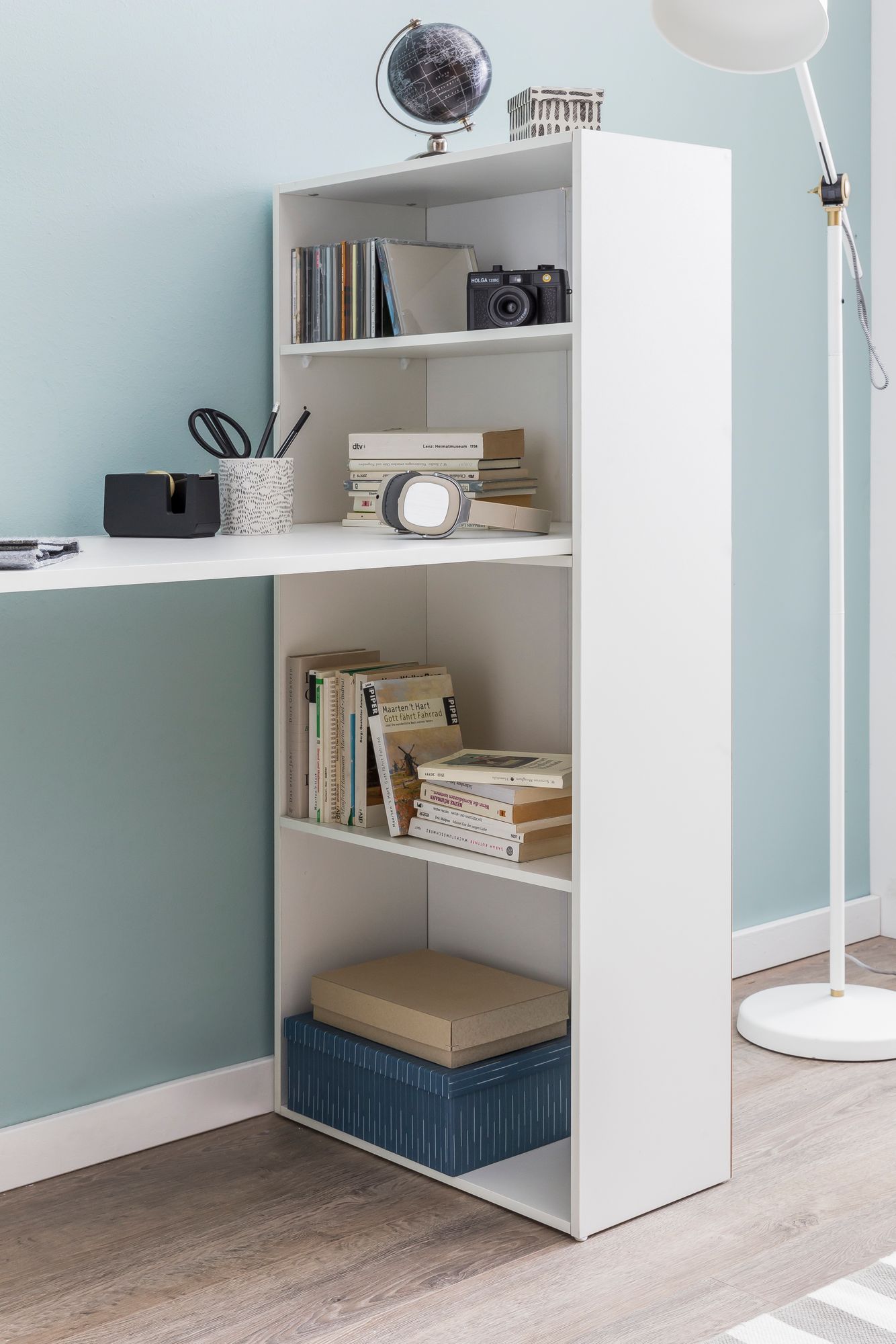 Deze moderne bureau heeft een wit mat spaanplaat oppervlak met geïntegreerde planken, ideaal voor het opbergen van ordners en kantoorbenodigdheden.