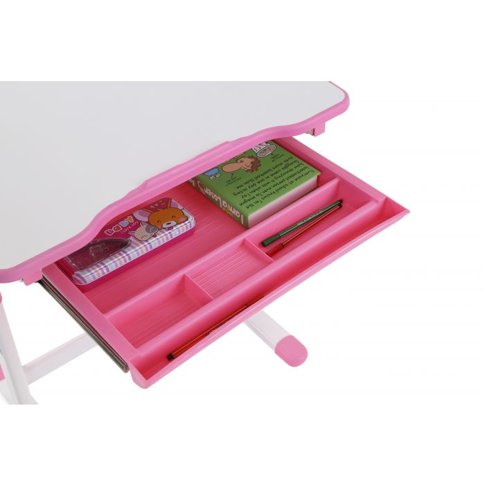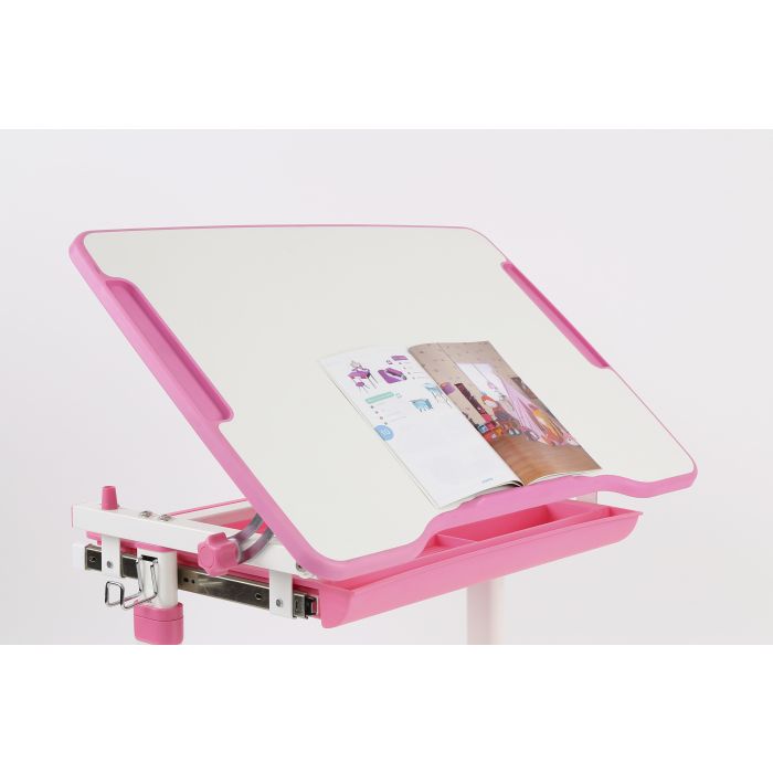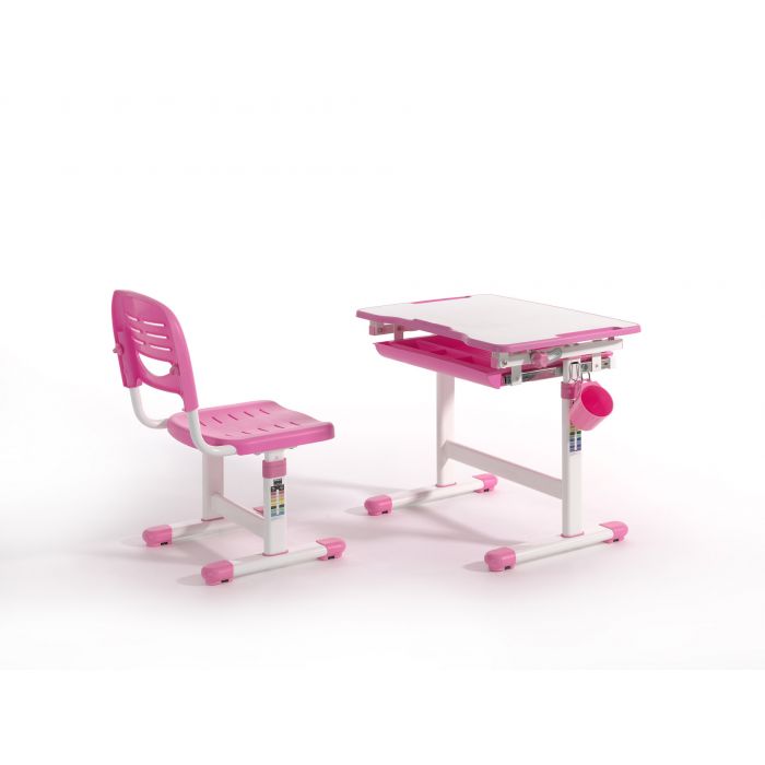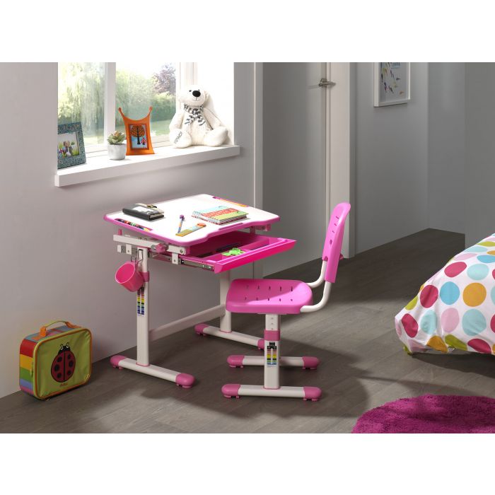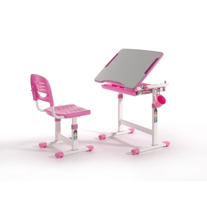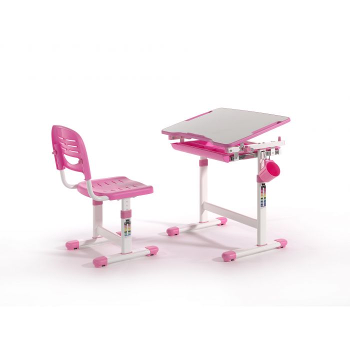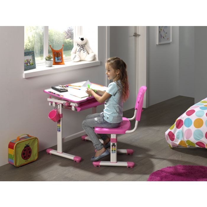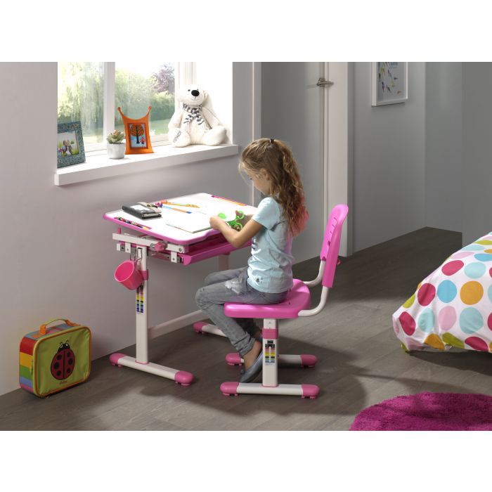 Ergonomisch en functioneel kinderbureau en bijpassende bureaustoel, uit de COMFORTLINE serie in roze en wit. Zowel het bureau als de stoel beschikken over een hoogteverstelling. De helling van het schrijfoppervlak kan worden aangepast om een ergonomisch optimale houding bij het lezen, schilderen of schrijven mogelijk te maken.