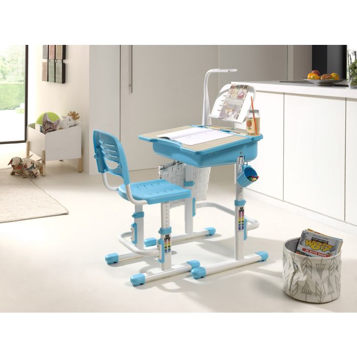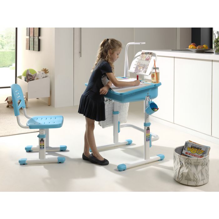 Ergonomisch en functioneel kinderbureau en bijpassende bureaustoel, uit de COMFORTLINE serie in blauw en wit. Zowel het bureau als de stoel beschikken over een hoogteverstelling. De helling van het schrijfoppervlak kan worden aangepast om een ergonomisch optimale houding bij het lezen, schilderen of schrijven mogelijk te maken.