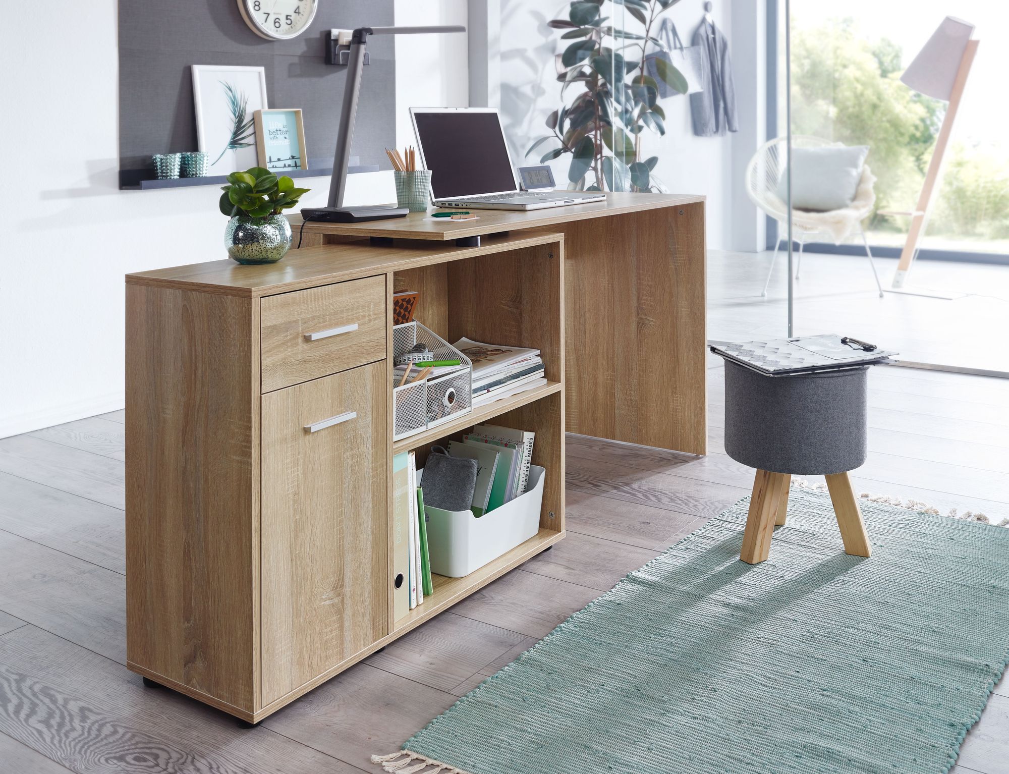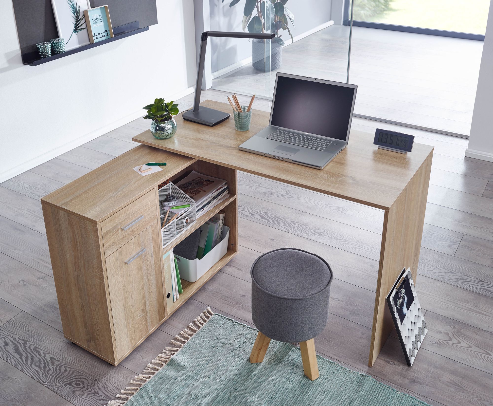 Maximaliseer uw werkruimte met dit moderne Sonoma hoekbureau met geïntegreerde plank. Het praktische ontwerp bevat een deur, lade en compartimenten geschikt voor A4-bestanden voor georganiseerde en gemakkelijke opberging.