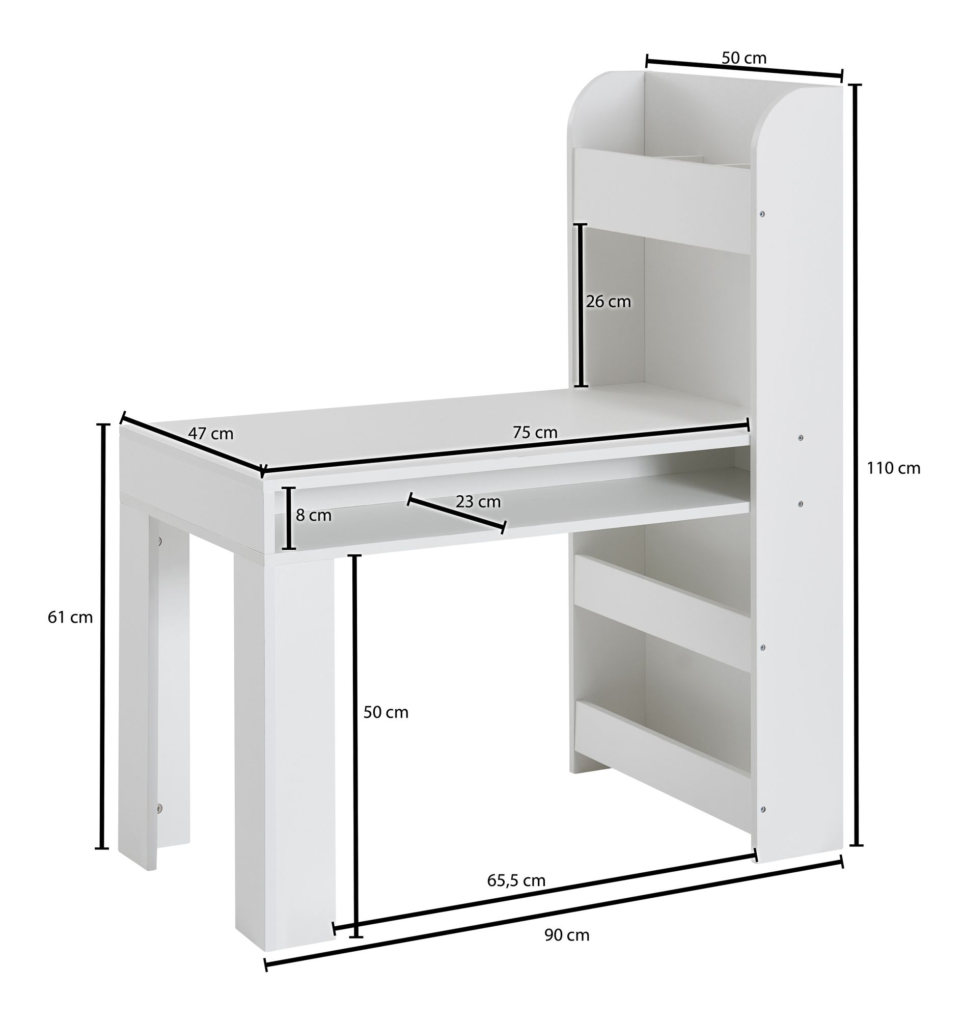 Het bureau heeft een blad van 75 x 47 cm en een totale breedte van 90 cm inclusief een geïntegreerde plank met twee open vakken voor het opbergen van papier, pennen en knutselspullen. De totale hoogte is 110 cm met een tafelbladhoogte van 61 cm, wat een comfortabele werkhouding mogelijk maakt.