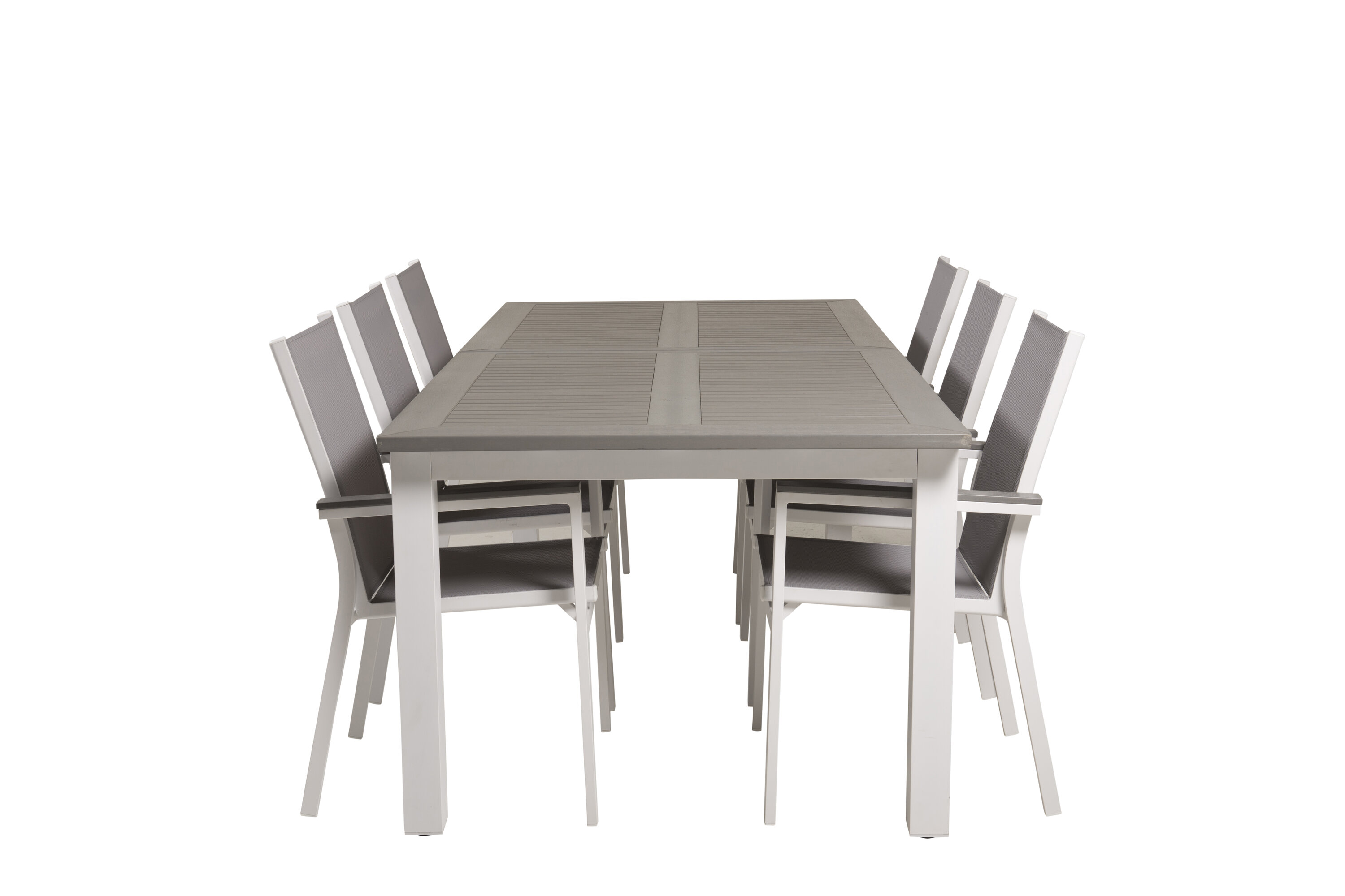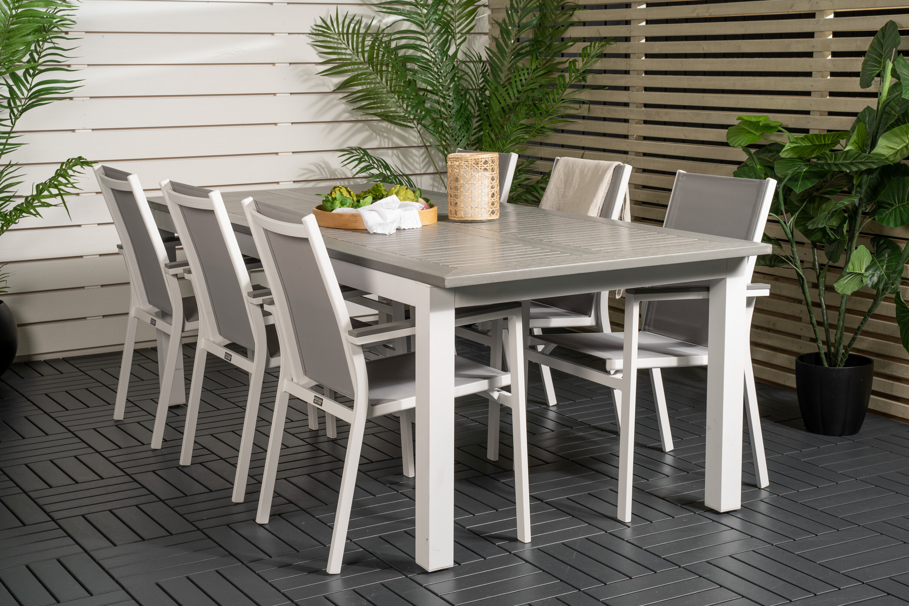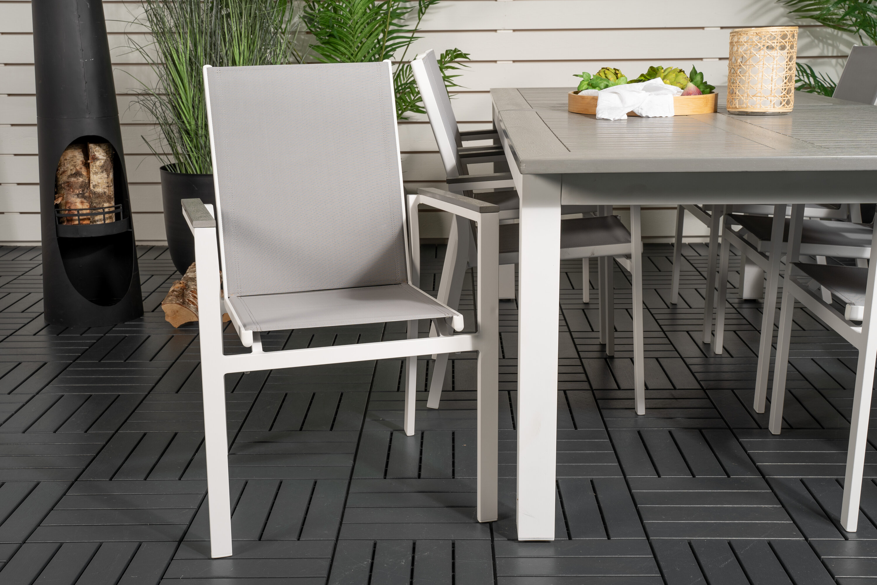 Albany Bord - Vit Alu/grå aintwood - 224/324*100+Parma Karmstol (stapelbar) - vi