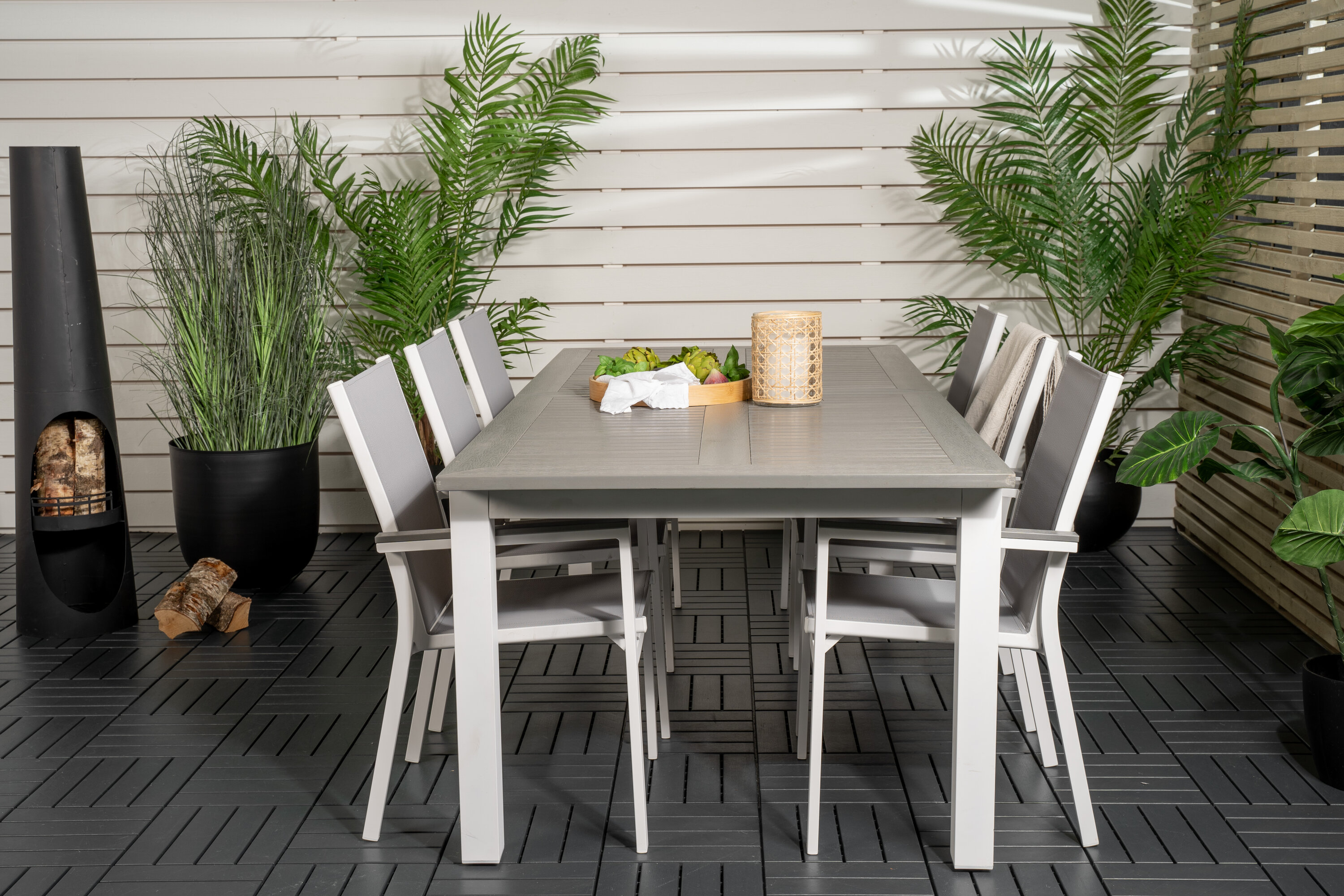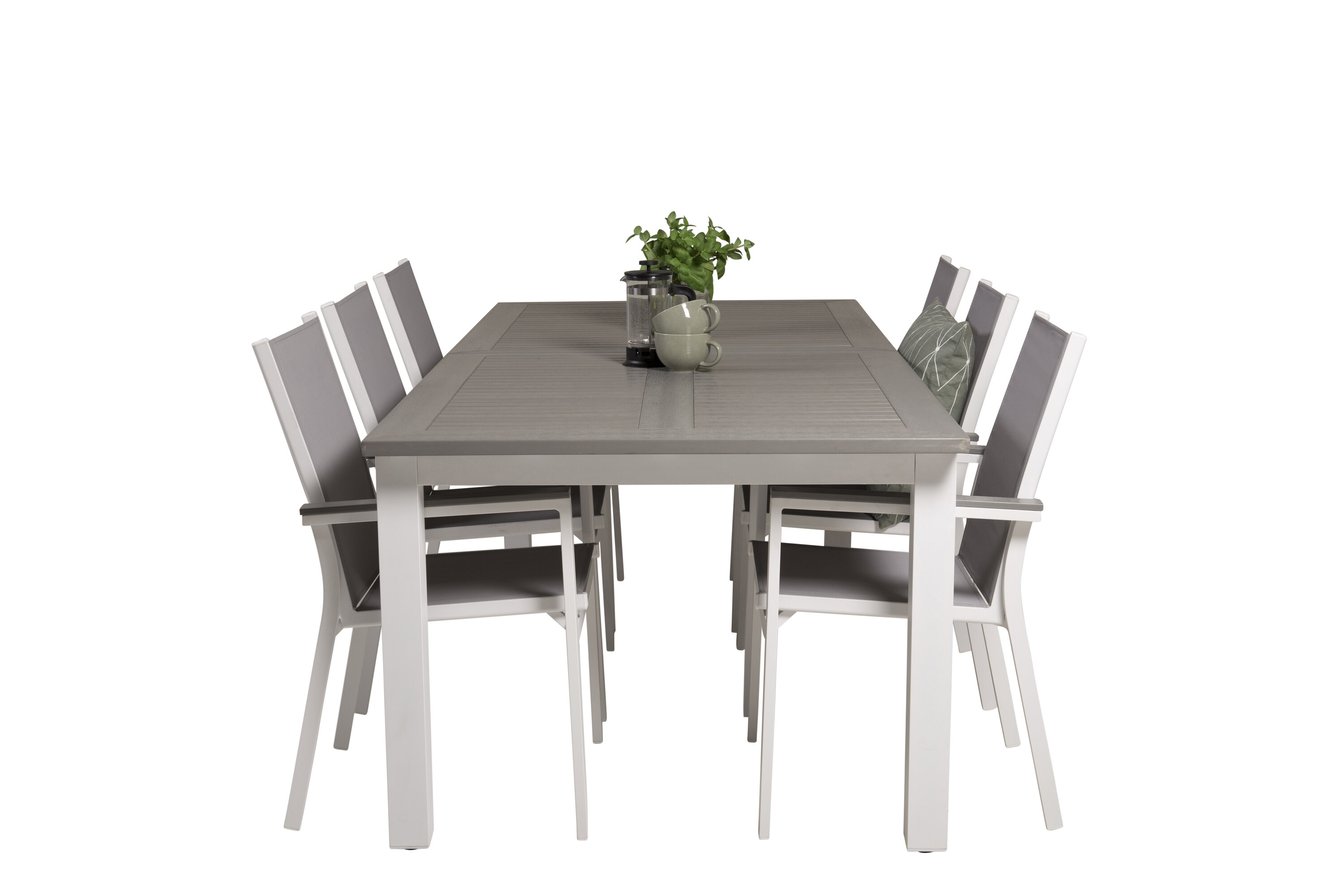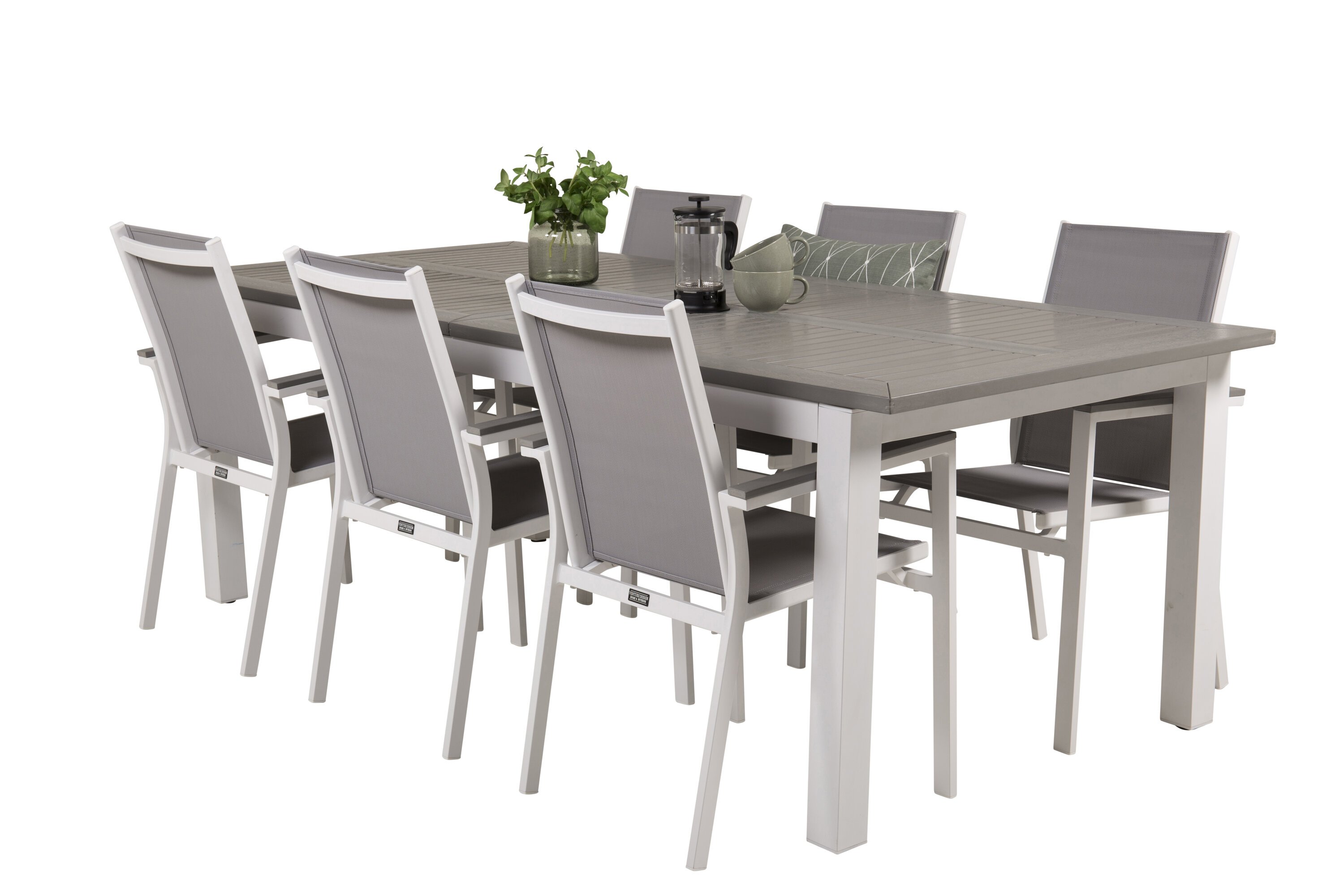 Albany Bord - Vit Alu/grå aintwood - 224/324*100+Parma Karmstol (stapelbar) - vi
