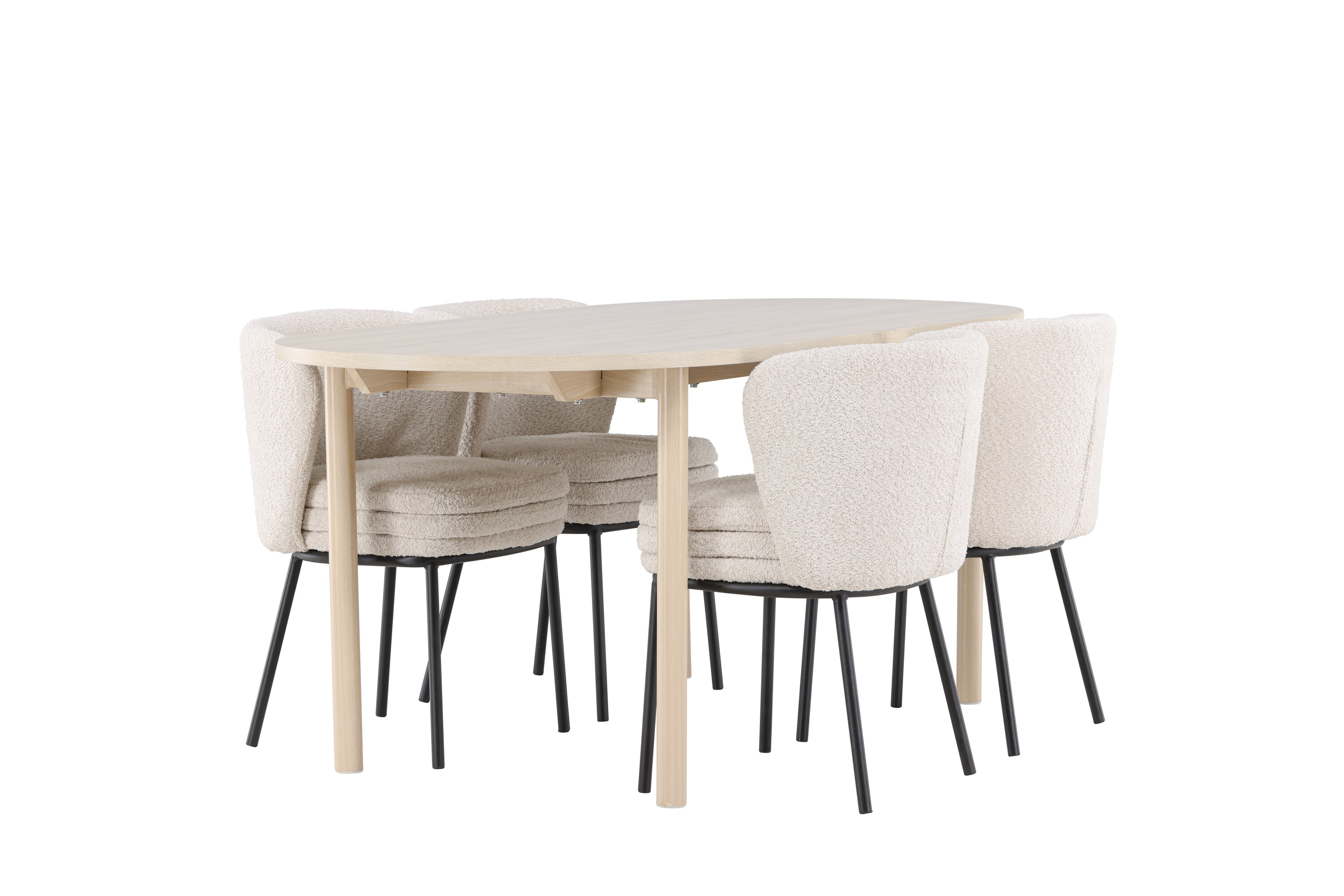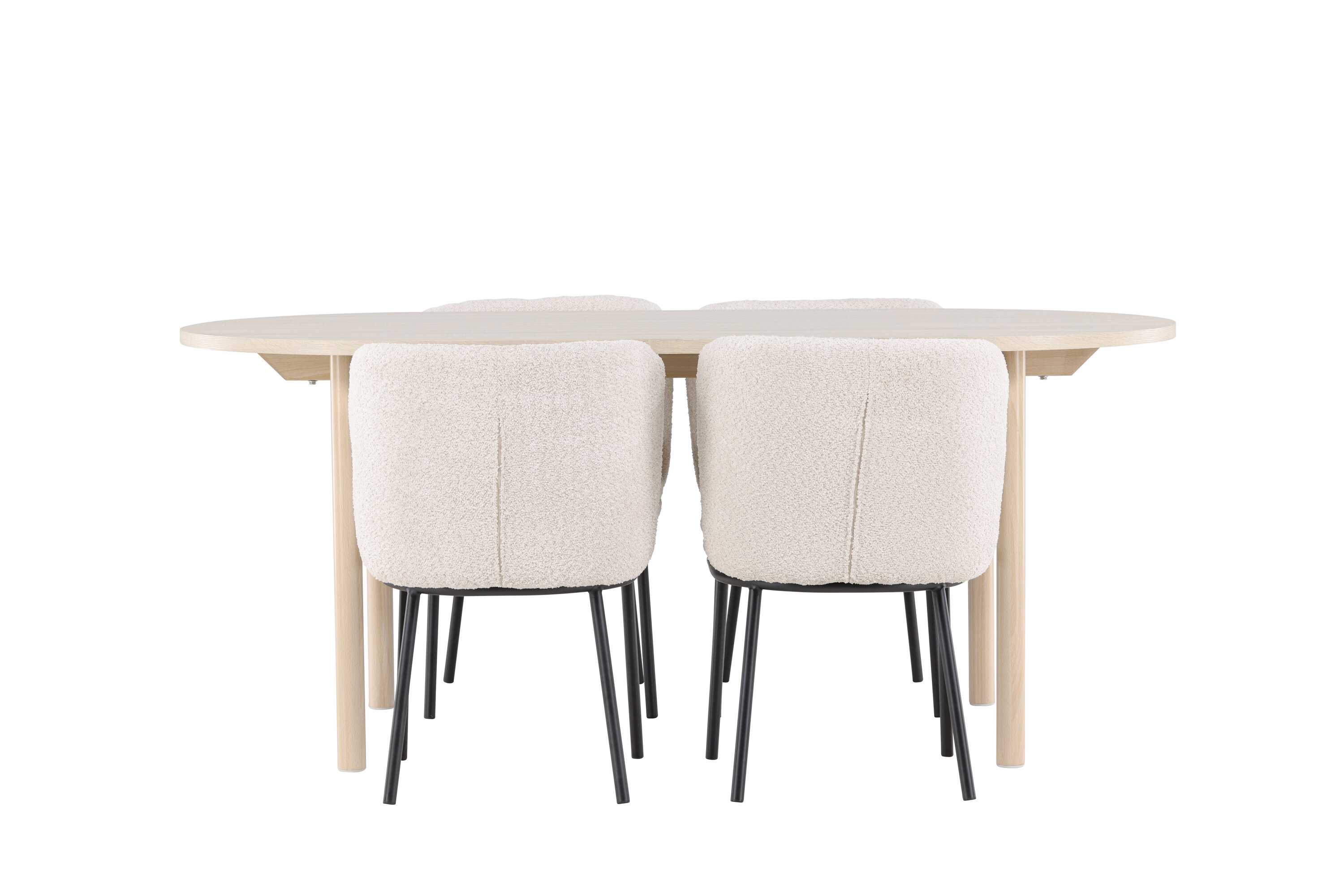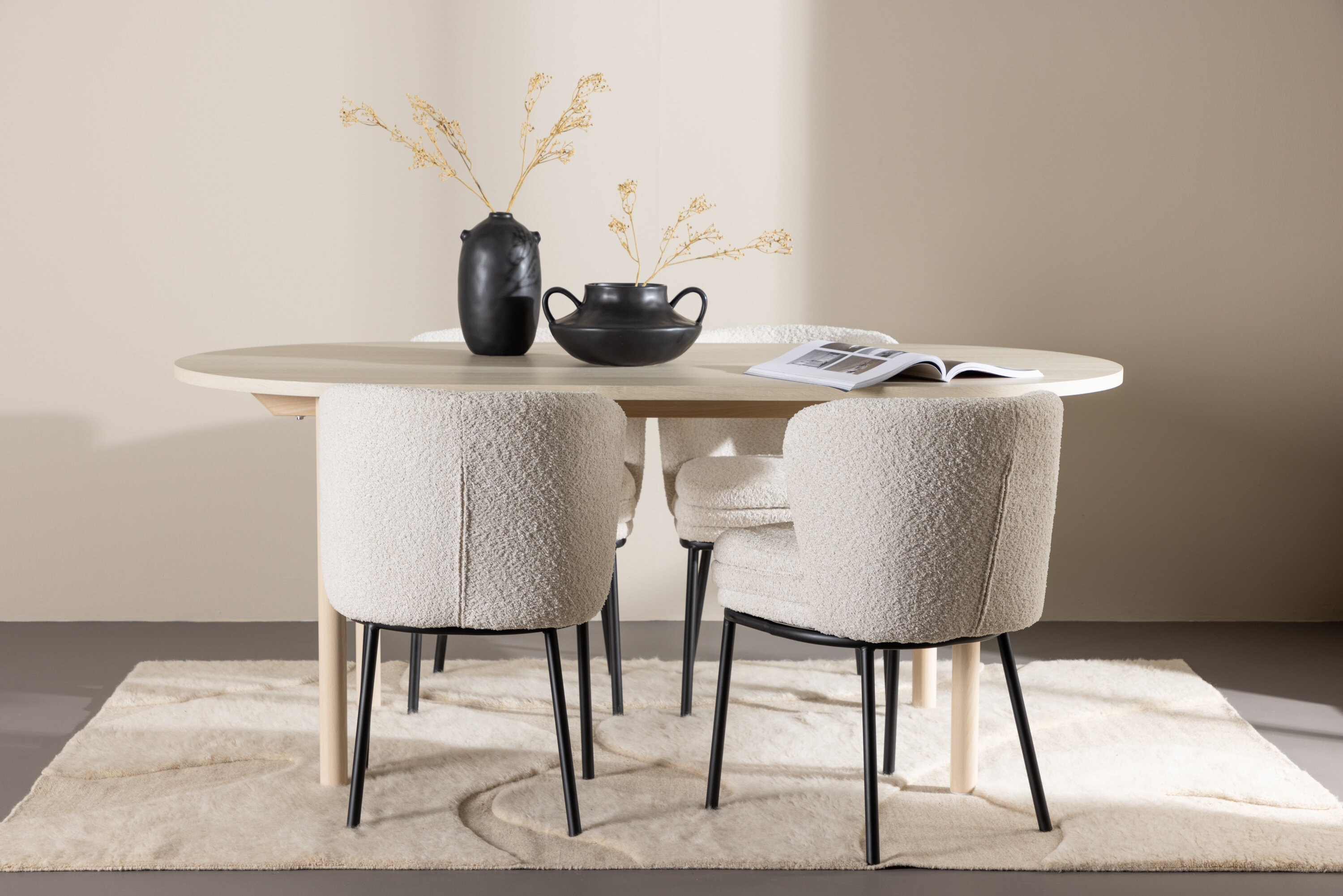 Ontdek de perfecte eetset voor je huis met de Andy eettafel en Agnes eetkamerstoelen. Andy eettafel is een tijdloze functie die een perfecte plek wordt voor gezellige maaltijden. Met zijn witgekalkte kleur geeft Andy een aards en neutraal gevoel aan je eetkamer of keuken. De stalen poten en het MDF-tafelblad van de tafel combineren strakheid met robuustheid, waardoor het een betrouwbaar meubelstuk is voor vele jaren. Met royale afmetingen van 180x90 cm is er voldoende ruimte voor familie en vrienden om rond de tafel te komen en te genieten van lekker eten en aangenaam gezelschap. Andy creëert een rustige en ontspannen sfeer die perfect past in verschillende interieurstijlen. Vul je eettafel aan met Agnes eetkamerstoelen, die eenvoudige schoonheid en strak design bieden. Met een zitting in witte bouclé en elegante zwarte stalen poten geeft Agnes een moderne en verfijnde esthetiek die bij alle interieurstijlen past. De zachte en getextureerde zitting in bouclé geeft een warm en uitnodigend gevoel, terwijl de zwarte stalen poten een modern tintje toevoegen. Agnes eetkamerstoelen creëren een harmonieuze sfeer en geven je eetkamer of keuken een indrukwekkend visueel effect. Geef je huis een vleugje eenvoudige elegantie met Andy eettafel en Agnes eetkamerstoelen - een tijdloze en stijlvolle combinatie die een gezellige sfeer en een uitnodigende omgeving creëert voor al je maaltijden.