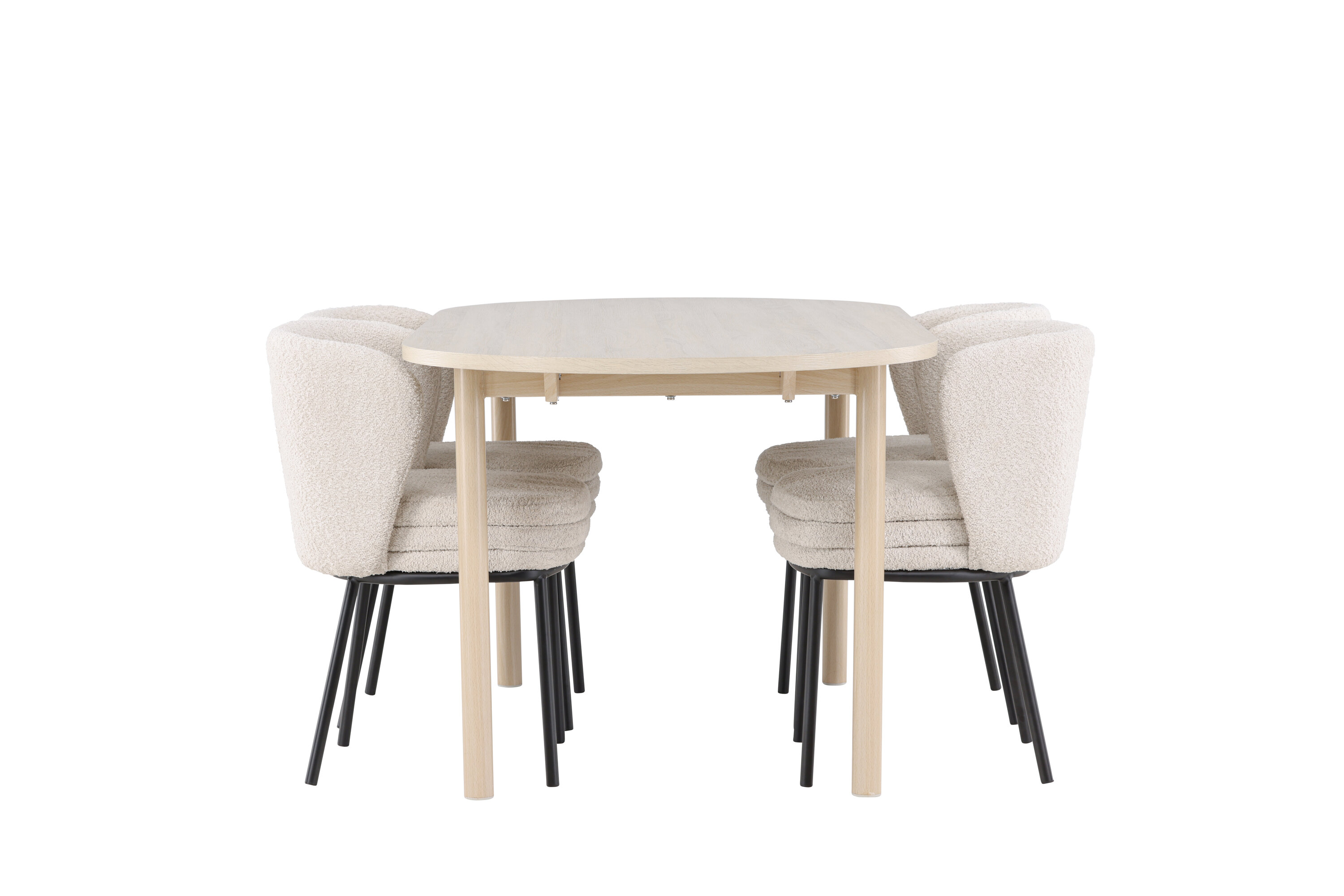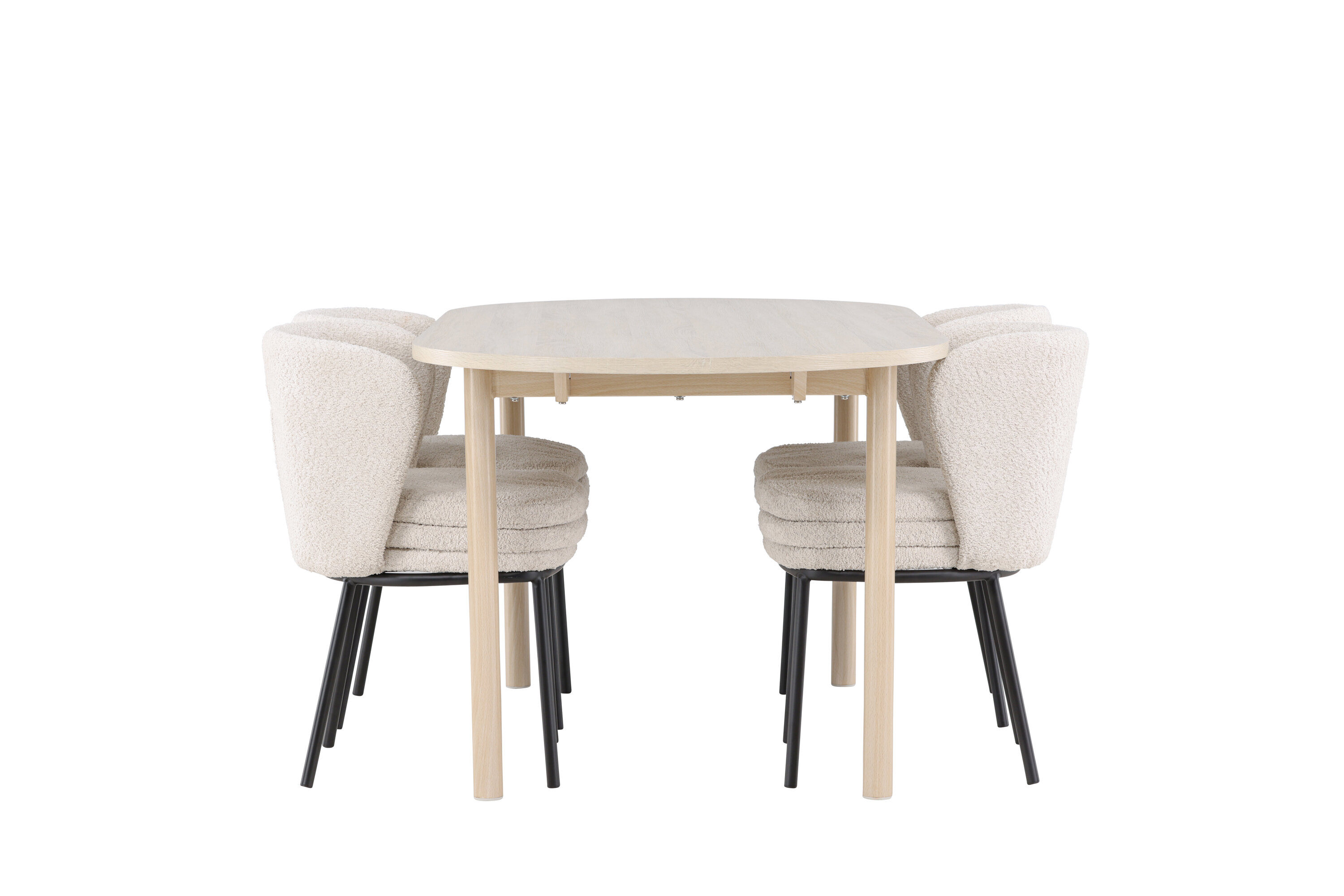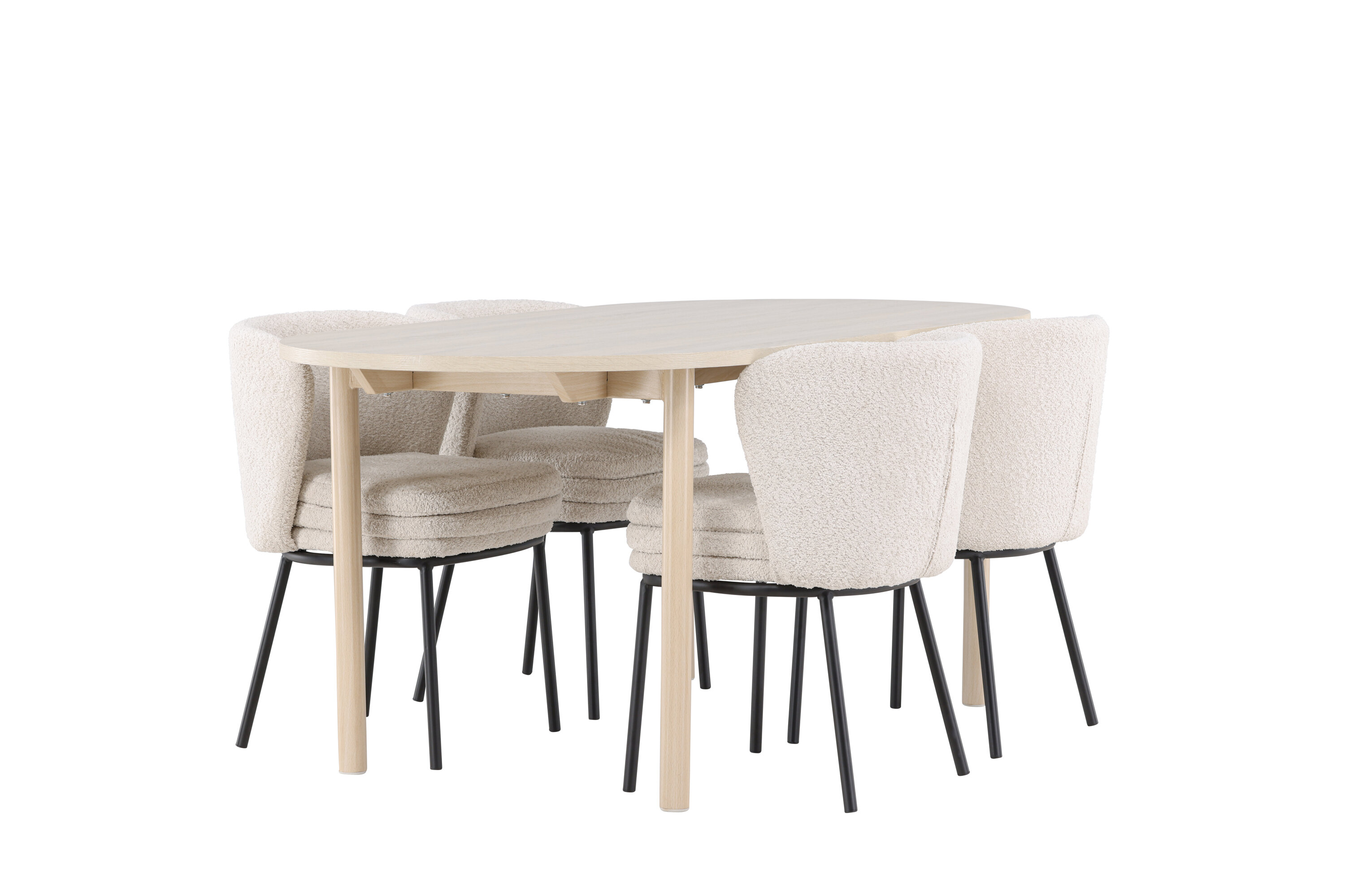 Ontdek de perfecte eetset voor je huis met de Andy eettafel en Agnes eetkamerstoelen. Andy eettafel is een tijdloze functie die een perfecte plek wordt voor gezellige maaltijden. Met zijn witgekalkte kleur geeft Andy een aards en neutraal gevoel aan je eetkamer of keuken. De stalen poten en het MDF-tafelblad van de tafel combineren strakheid met robuustheid, waardoor het een betrouwbaar meubelstuk is voor vele jaren. Met royale afmetingen van 180x90 cm is er voldoende ruimte voor familie en vrienden om rond de tafel te komen en te genieten van lekker eten en aangenaam gezelschap. Andy creëert een rustige en ontspannen sfeer die perfect past in verschillende interieurstijlen. Vul je eettafel aan met Agnes eetkamerstoelen, die eenvoudige schoonheid en strak design bieden. Met een zitting in witte bouclé en elegante zwarte stalen poten geeft Agnes een moderne en verfijnde esthetiek die bij alle interieurstijlen past. De zachte en getextureerde zitting in bouclé geeft een warm en uitnodigend gevoel, terwijl de zwarte stalen poten een modern tintje toevoegen. Agnes eetkamerstoelen creëren een harmonieuze sfeer en geven je eetkamer of keuken een indrukwekkend visueel effect. Geef je huis een vleugje eenvoudige elegantie met Andy eettafel en Agnes eetkamerstoelen - een tijdloze en stijlvolle combinatie die een gezellige sfeer en een uitnodigende omgeving creëert voor al je maaltijden.