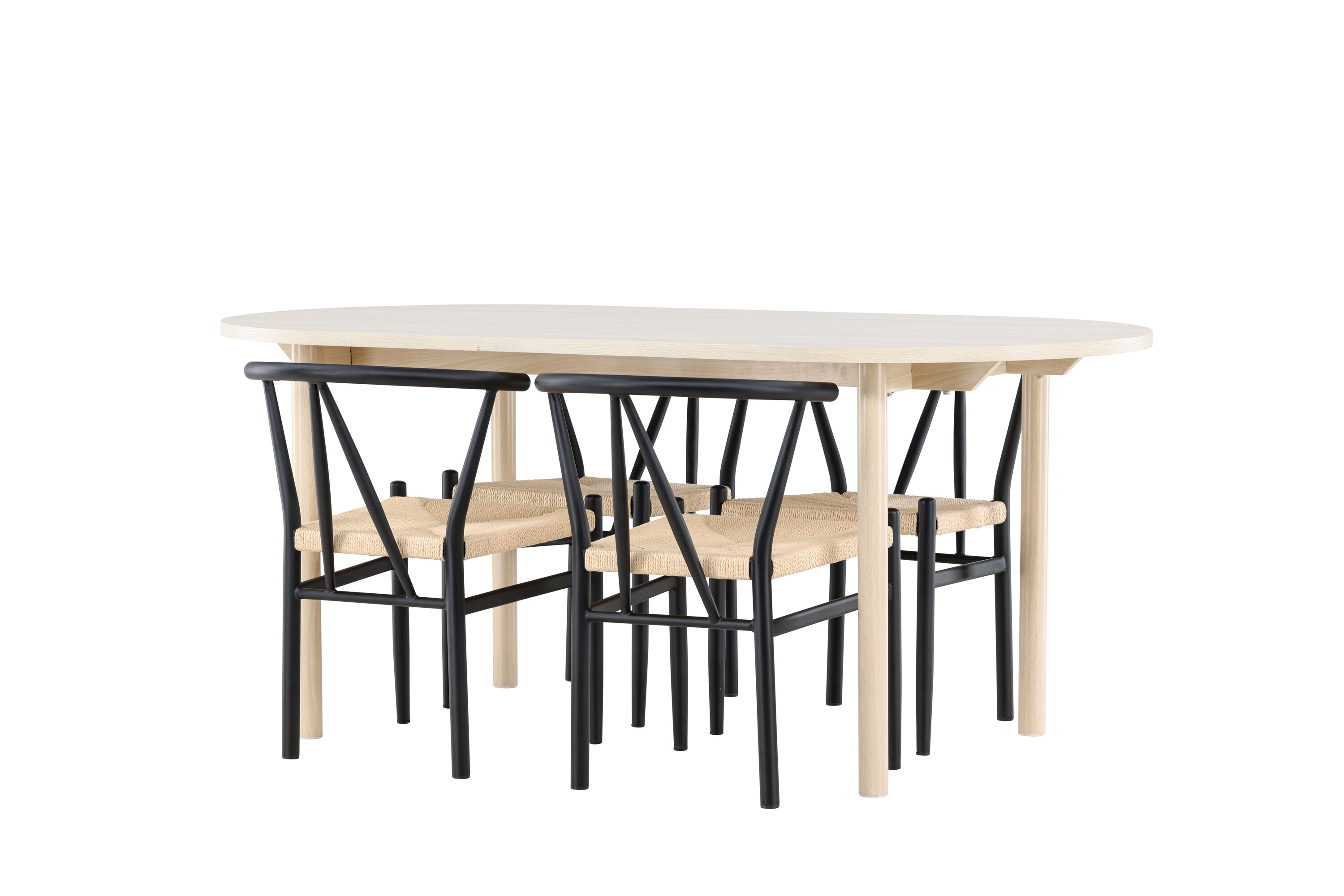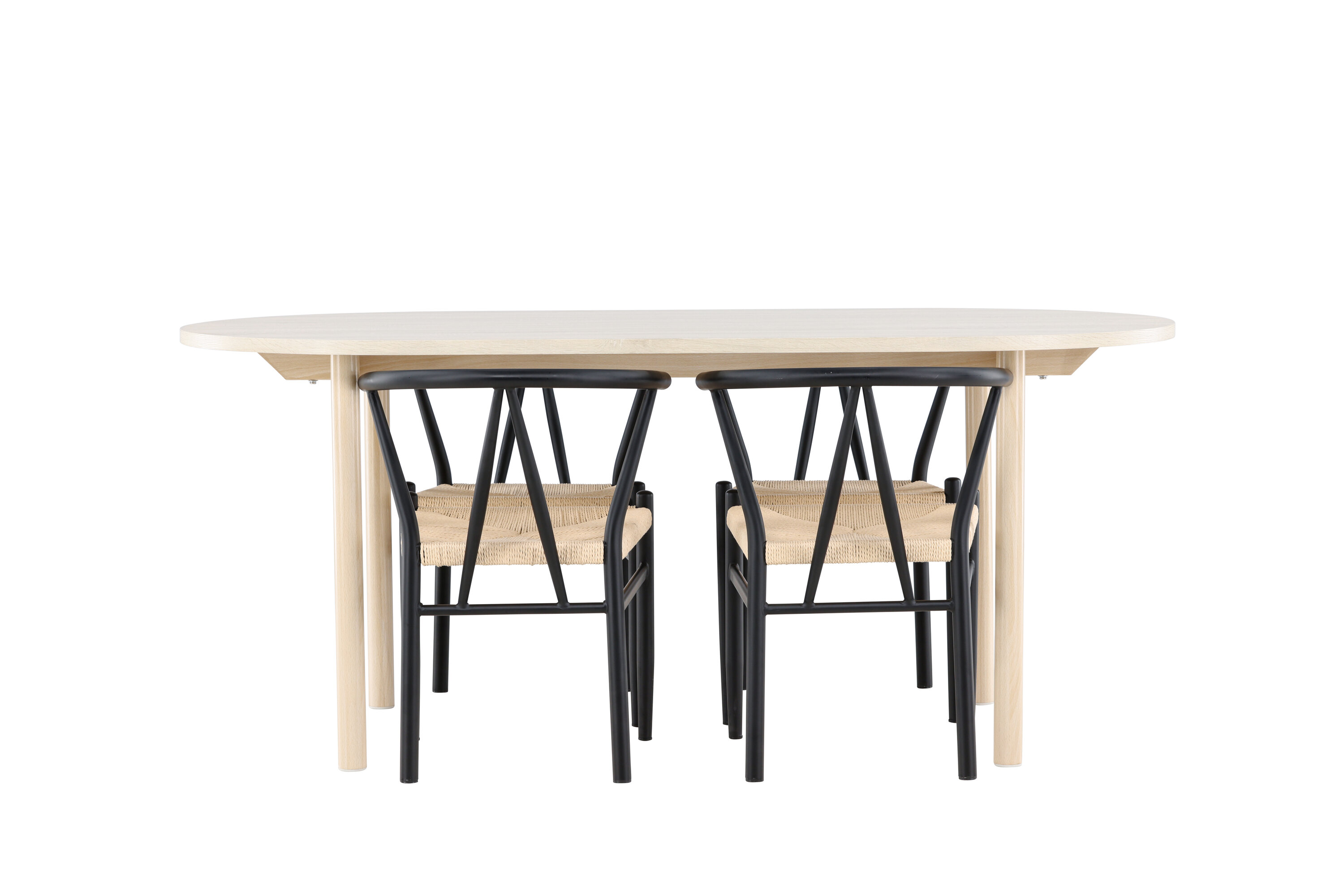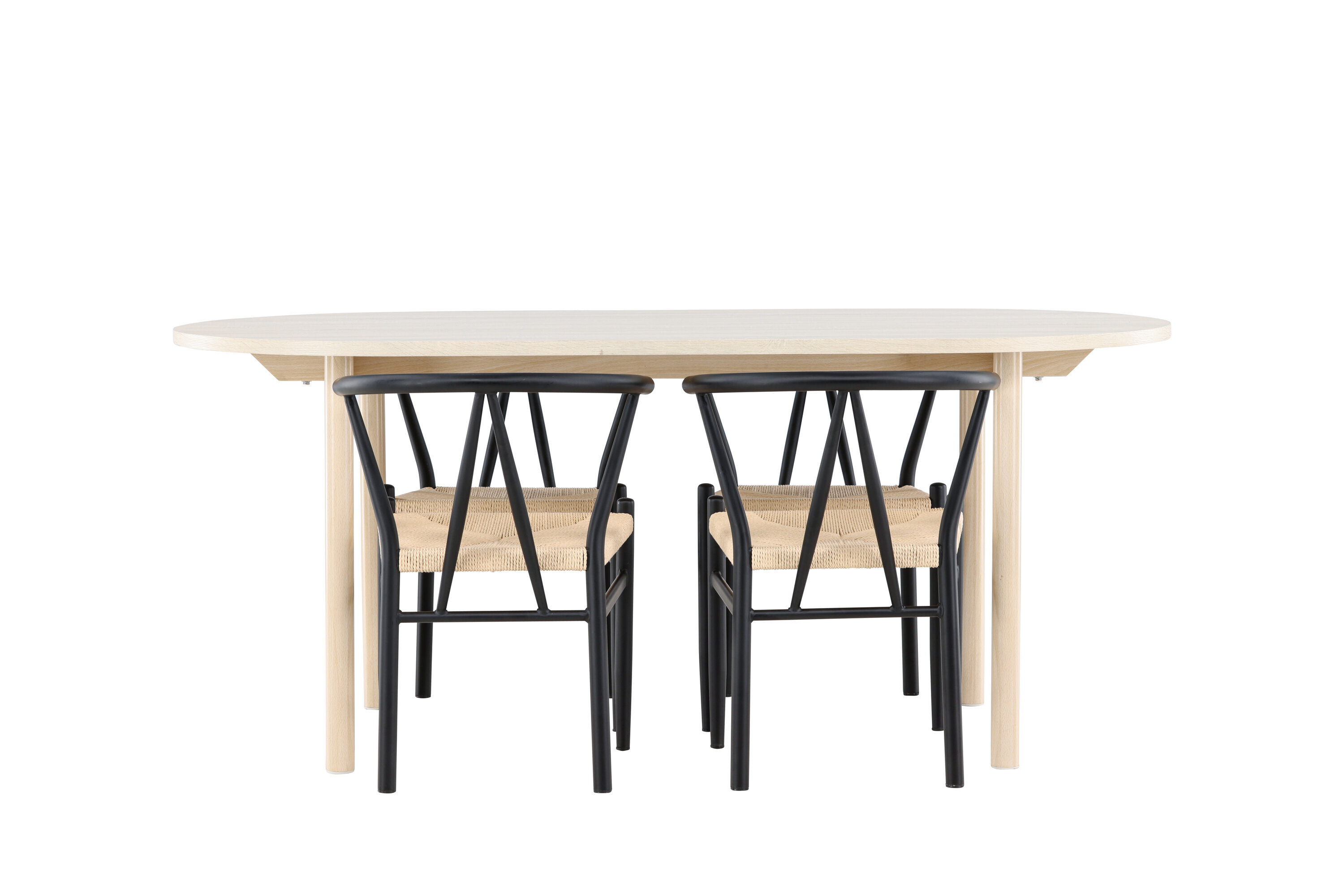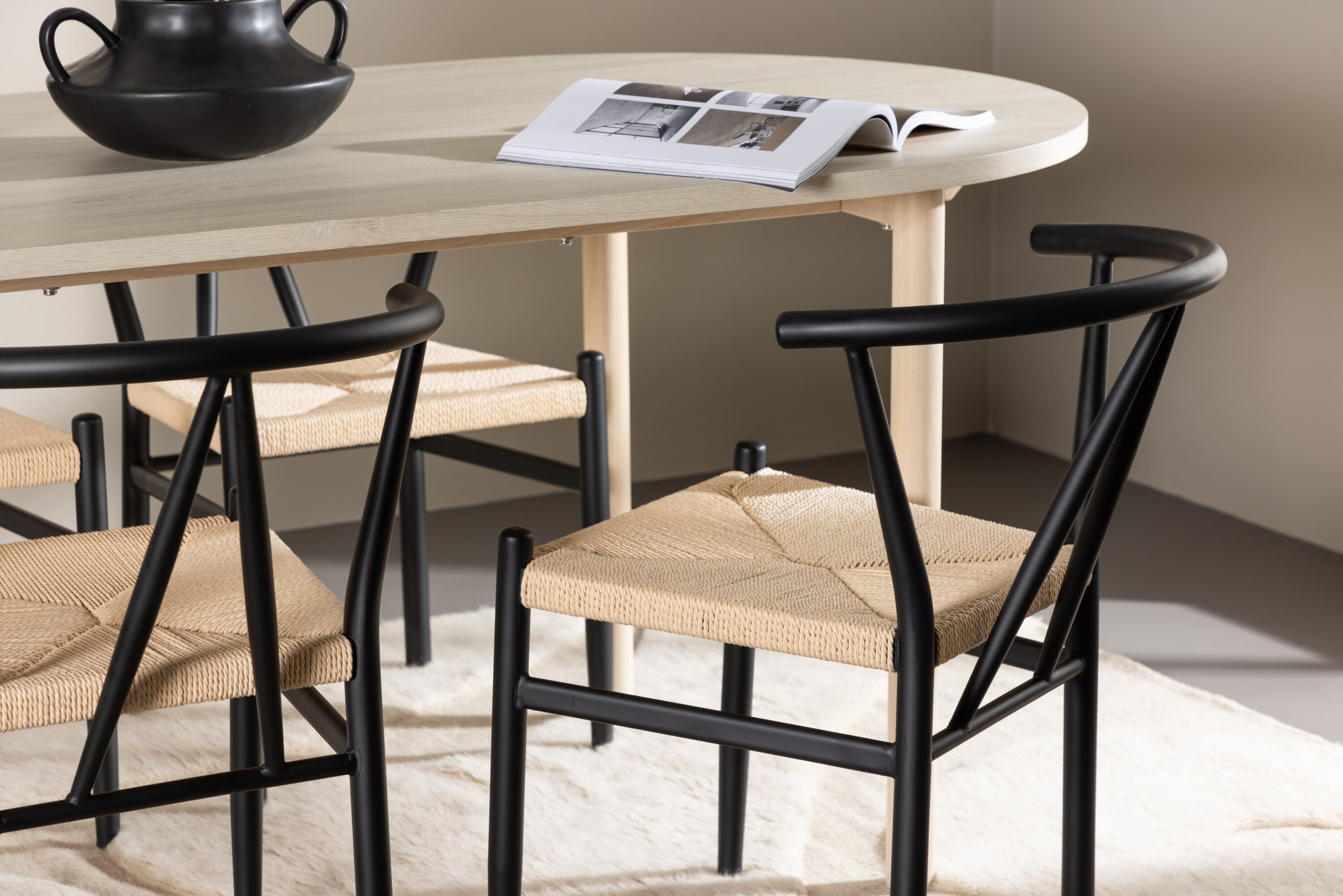Ontdek de perfecte eetset voor je huis met de Andy eettafel en Alfons eetkamerstoelen. Andy eettafel is een tijdloze functie in je eetkamer of keuken. Met zijn witgekalkte kleur geeft het de kamer een aards en neutraal gevoel. De stalen poten en het MDF-tafelblad van de tafel combineren strakheid met robuustheid, waardoor het een betrouwbaar meubelstuk is voor vele jaren. Met royale afmetingen van 180x90 cm is er voldoende ruimte voor familie en vrienden om rond de tafel te komen en te genieten van lekker eten en aangenaam gezelschap. Andy creëert een rustige en ontspannen sfeer die perfect past in verschillende interieurstijlen. Vul je eettafel aan met Alfons eetkamerstoelen, die stijl en functionaliteit op een elegante manier combineren. Met een zitting in beige rotan en een frame van zwart staal geeft Alfons een tijdloze en klassieke uitstraling aan je eettafel. De stoelen bieden niet alleen een comfortabele plek om te zitten en te genieten van je maaltijden, maar bieden ook de mogelijkheid om een gevoel van gemeenschap rond de tafel te creëren. De robuuste constructie en het stevige materiaal maken Alfons klaar om vele diners en bijeenkomsten in de toekomst te weerstaan. Met zijn strakke ontwerp past Alfons in verschillende interieurstijlen en voegt het een vleugje elegantie toe aan je huis. Geef je interieur een vleugje eenvoudige elegantie met Andy eettafel en Alfons eetkamerstoelen - een perfecte combinatie om herinneringen te creëren en goede momenten te delen met dierbaren.
