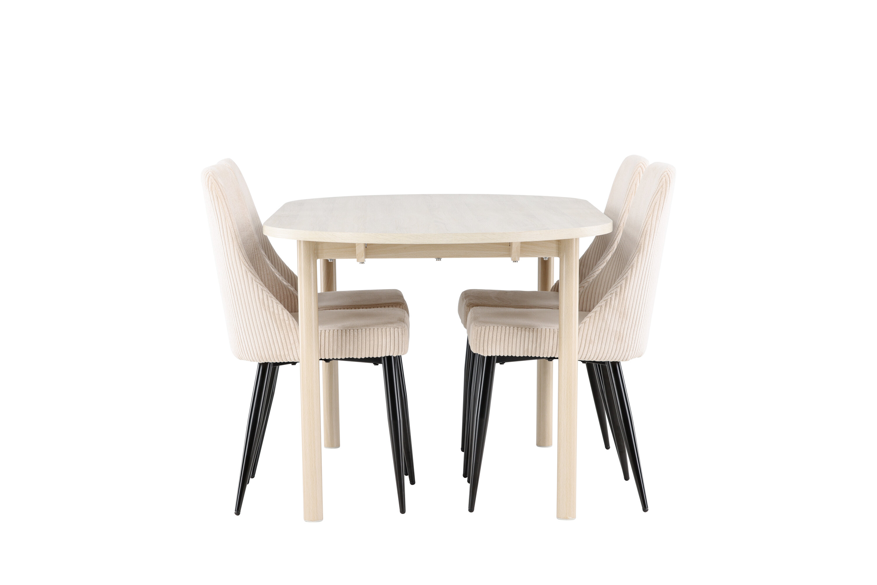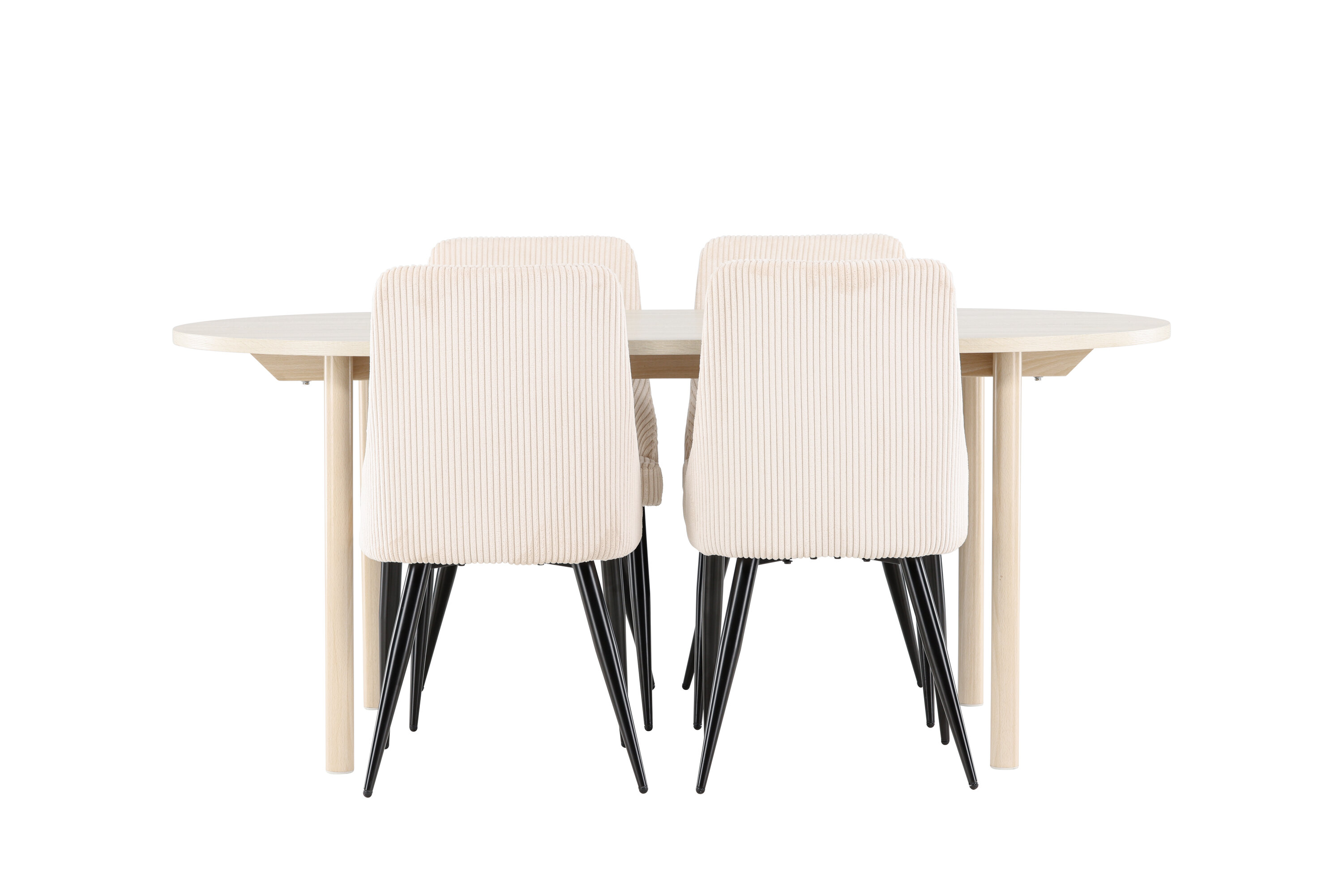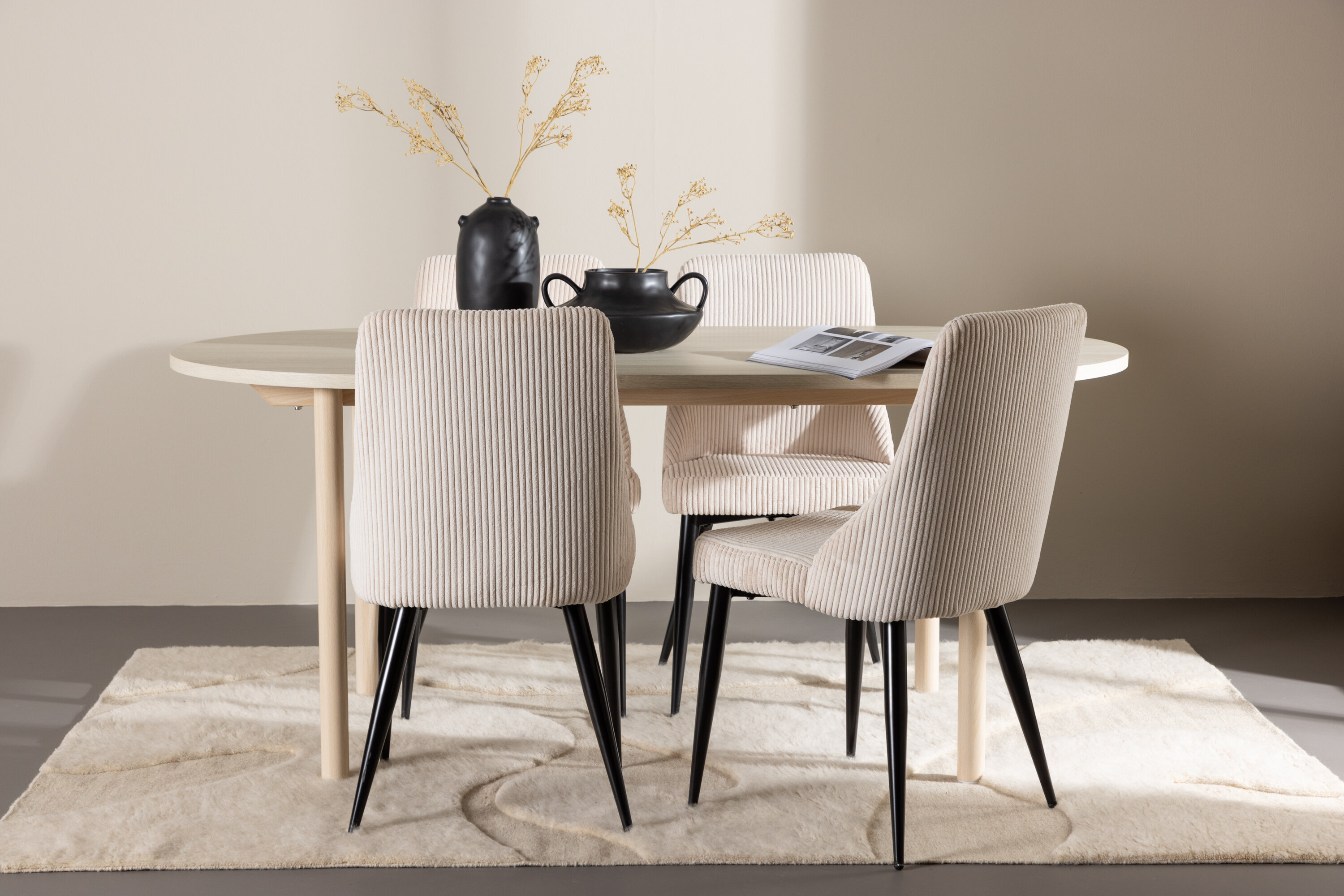 De Leone eetkamerstoel en Andy eettafel vormen samen de perfecte eethoek die stijl en comfort op een elegante manier combineert. De stoel is FSC®-gecertificeerd (FSC®C177288), wat betekent dat deze bestaat uit hout uit verantwoorde bosbouw, bosbouw die rekening houdt met mens en milieu. Leone is gemaakt van zacht fluweel met stalen poten en biedt een perfecte balans tussen functie en esthetiek. De zachte beige kleur geeft een warm en uitnodigend gevoel en het eenvoudige ontwerp maakt de stoel veelzijdig en geschikt voor verschillende interieurstijlen. Leone maakt het gemakkelijk om een uniforme en harmonieuze sfeer rond uw eethoek te creëren, of het nu gaat om dagelijkse maaltijden of speciale gelegenheden. De Andy eettafel, met zijn witgekalkte kleur, zorgt voor een aards en neutraal gevoel in je eetkamer of keuken. De stalen poten en het MDF-tafelblad van de tafel combineren elegantie met robuustheid, waardoor het nog vele jaren een betrouwbaar meubelstuk is. Met royale afmetingen van 180x90 cm is er voldoende ruimte voor familie en vrienden om rond de tafel te komen en te genieten van lekker eten en gezelschap. Samen bieden de Leone eetkamerstoel en Andy eettafel een stijlvolle en functionele oplossing voor uw huis, waardoor elke maaltijd een plezierige ervaring wordt. Geef je interieur een vleugje eenvoudige elegantie met deze tijdloze eetset.