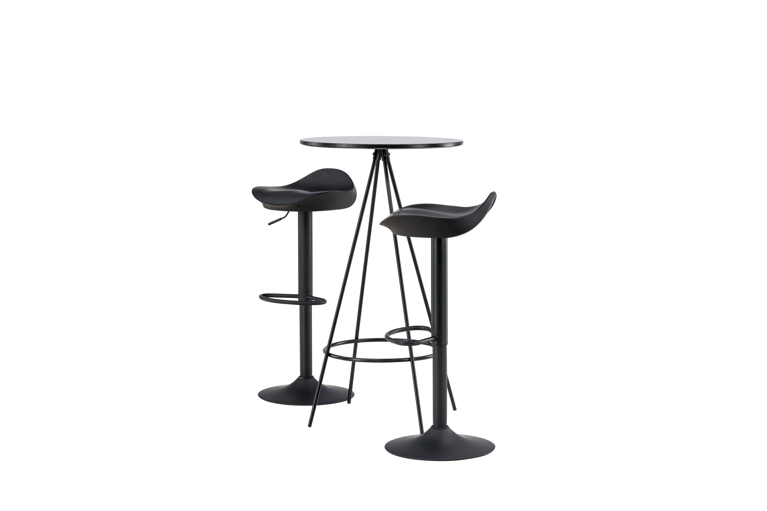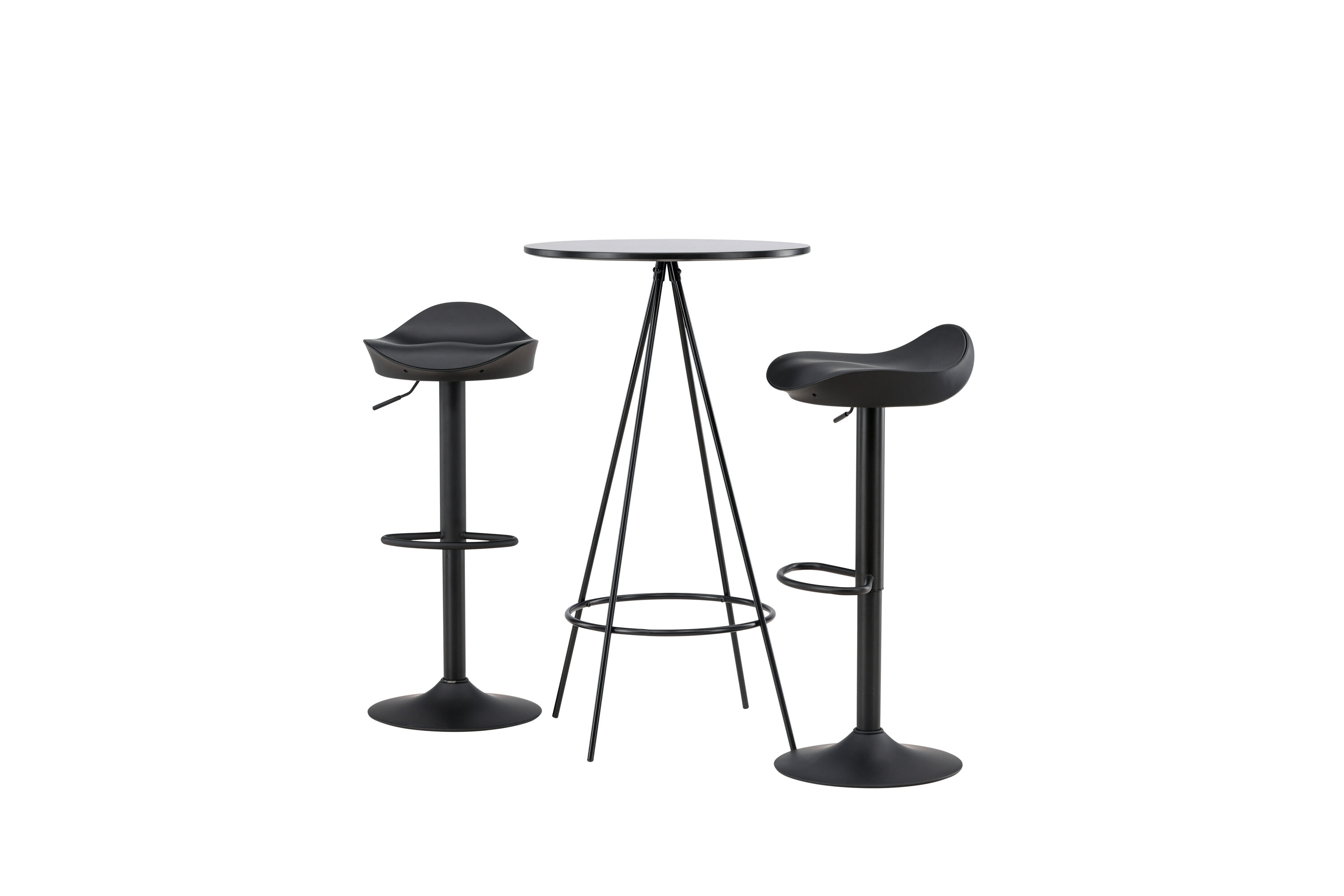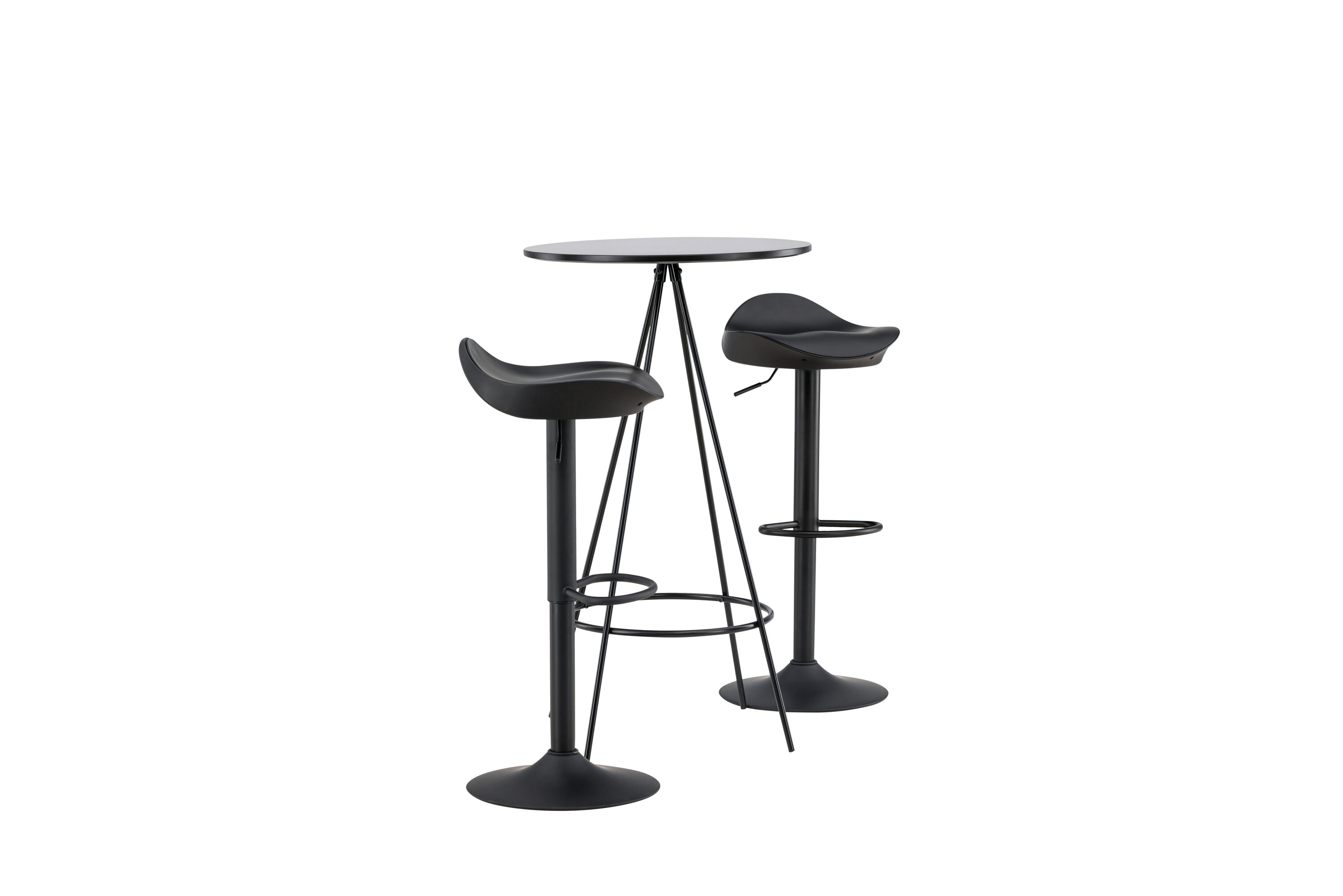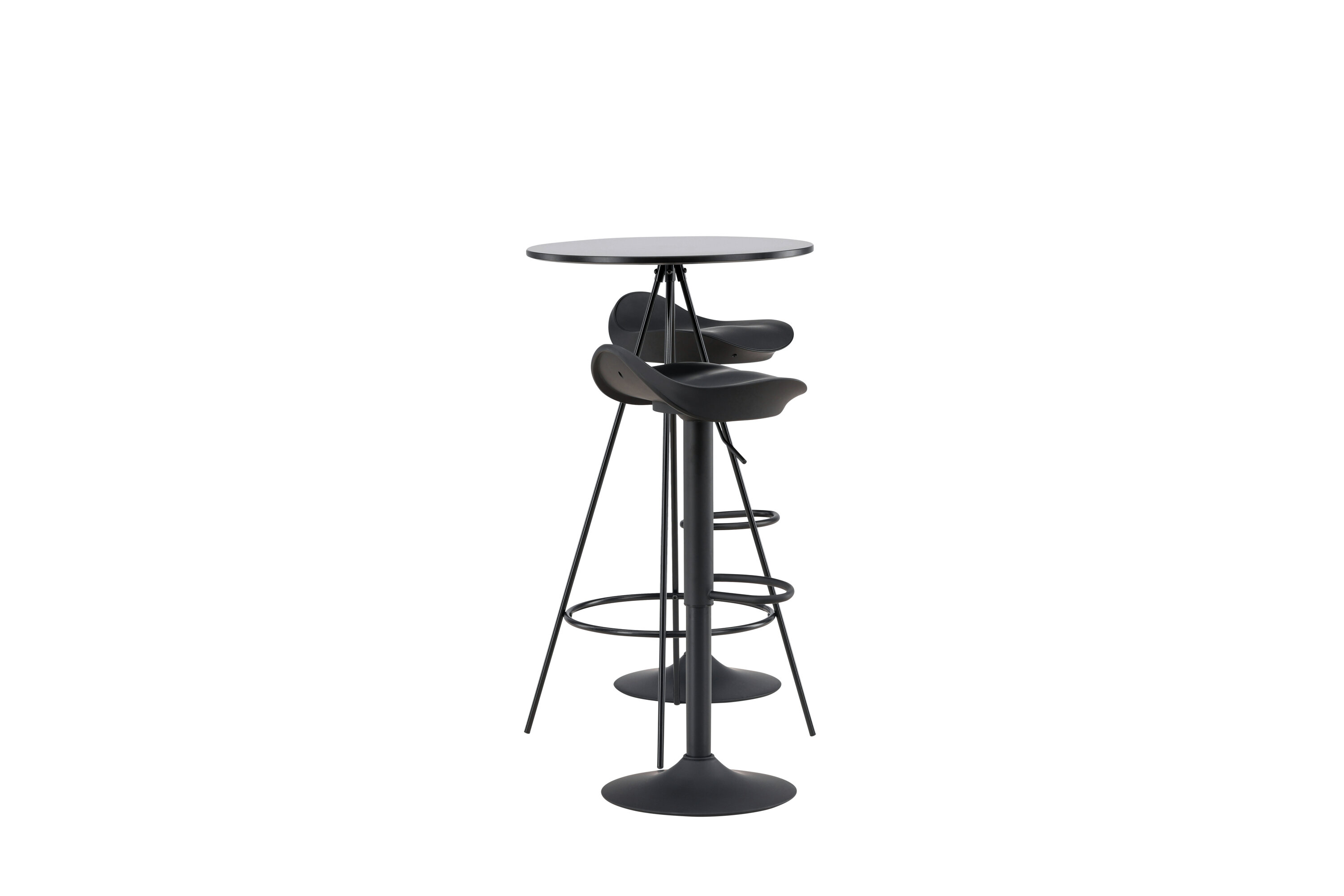 Waarom zou je je huis niet net zo modern als tijdloos inrichten? De Bistro bartafel heeft een minimalistisch, Scandinavisch design met een rond tafelblad in zwart MDF met fineer. De luchtige, kegelvormige tafelpoten zijn licht uitlopend in zwart metaal en hebben een geïntegreerd frame voor de voetensteun. Hier samen met klassieke, zwarte barkrukken uit de Adesto serie. De stoel heeft een stijlvol design met een trompetvoet in zwart staal en een eenvoudige zitting in zwart kunststof. Hier krijg je alles wat je nodig hebt! Tafelafmetingen: 60 cm.
