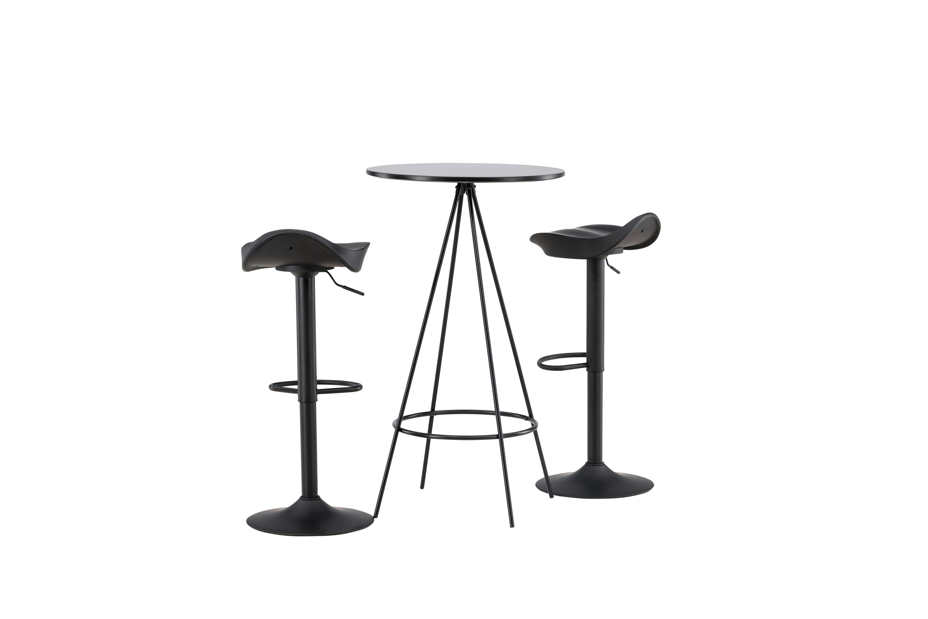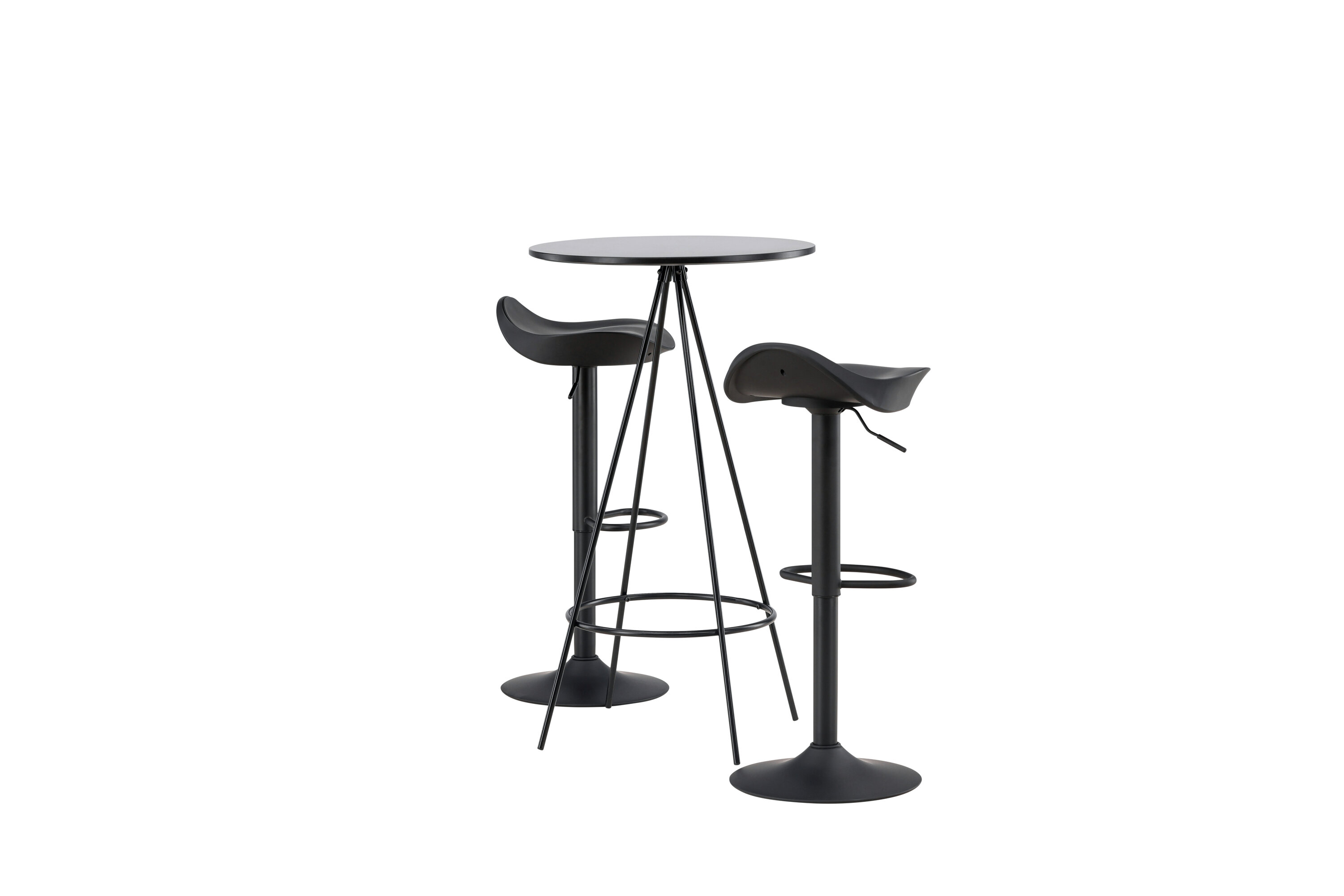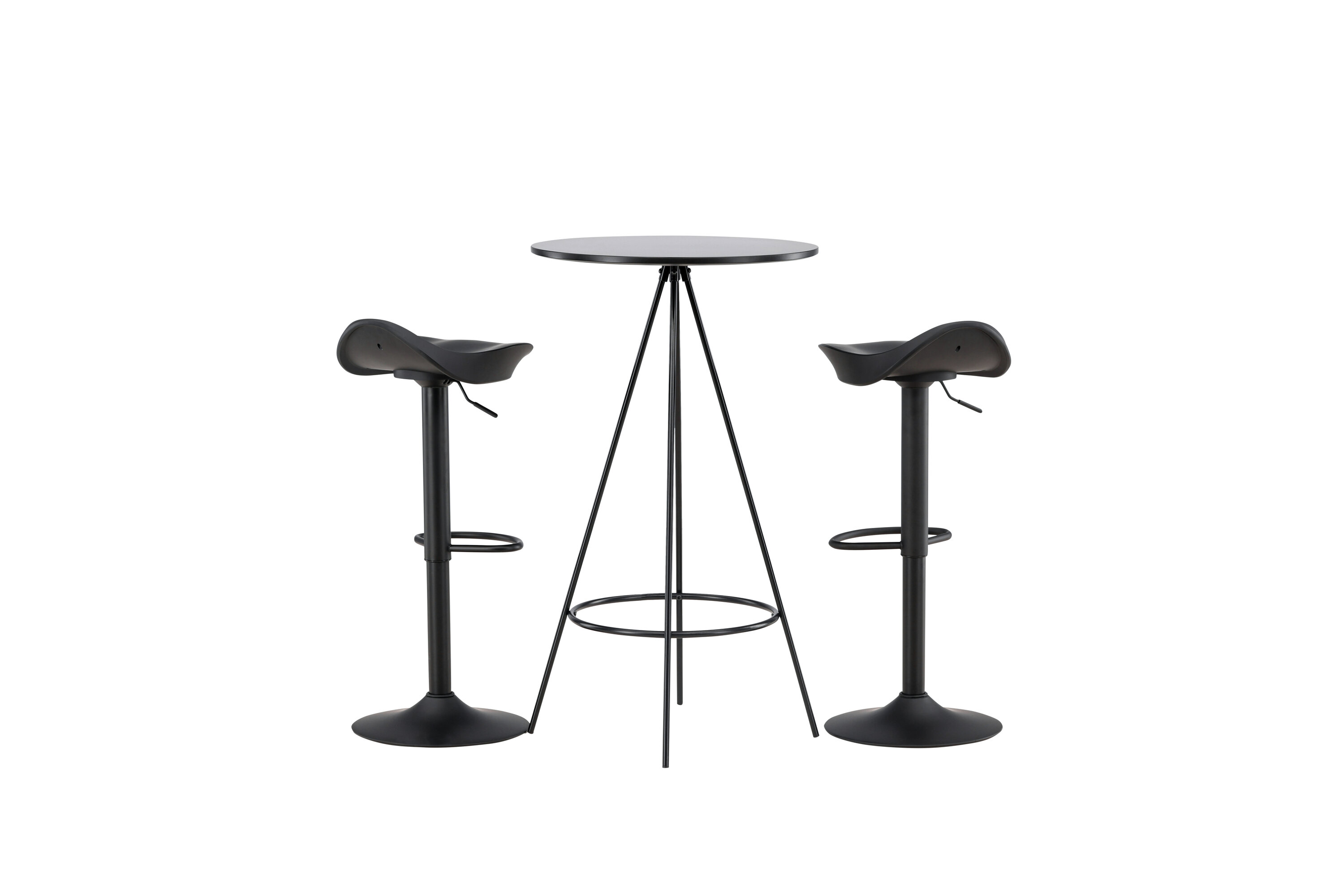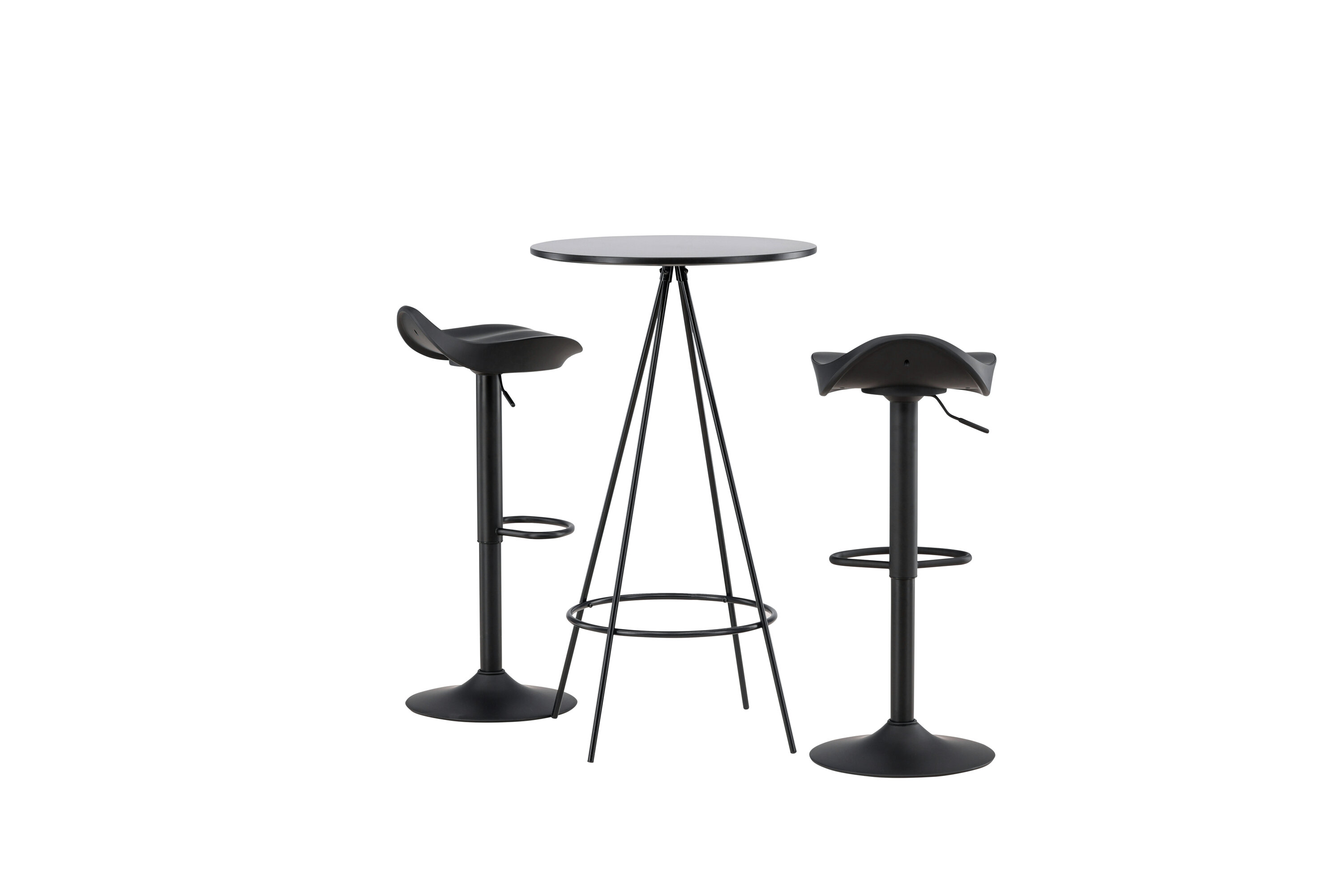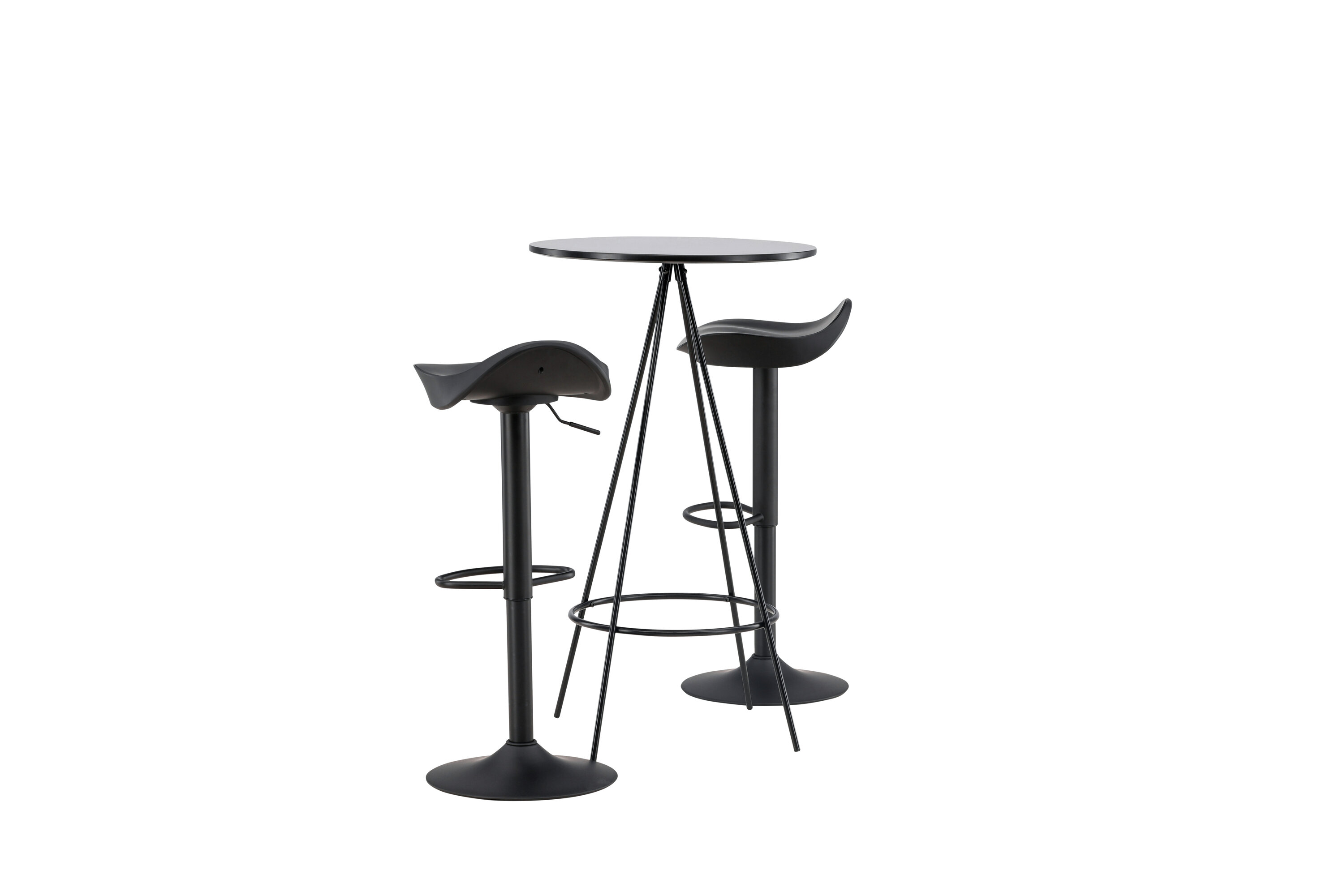 Waarom zou je je huis niet net zo modern als tijdloos inrichten? De Bistro bartafel heeft een minimalistisch, Scandinavisch design met een rond tafelblad in zwart MDF met fineer. De luchtige, kegelvormige tafelpoten zijn licht uitlopend in zwart metaal en hebben een geïntegreerd frame voor de voetensteun. Hier samen met klassieke, zwarte barkrukken uit de Adesto serie. De stoel heeft een stijlvol design met een trompetvoet in zwart staal en een eenvoudige zitting in zwart kunststof. Hier krijg je alles wat je nodig hebt! Tafelafmetingen: 60 cm.