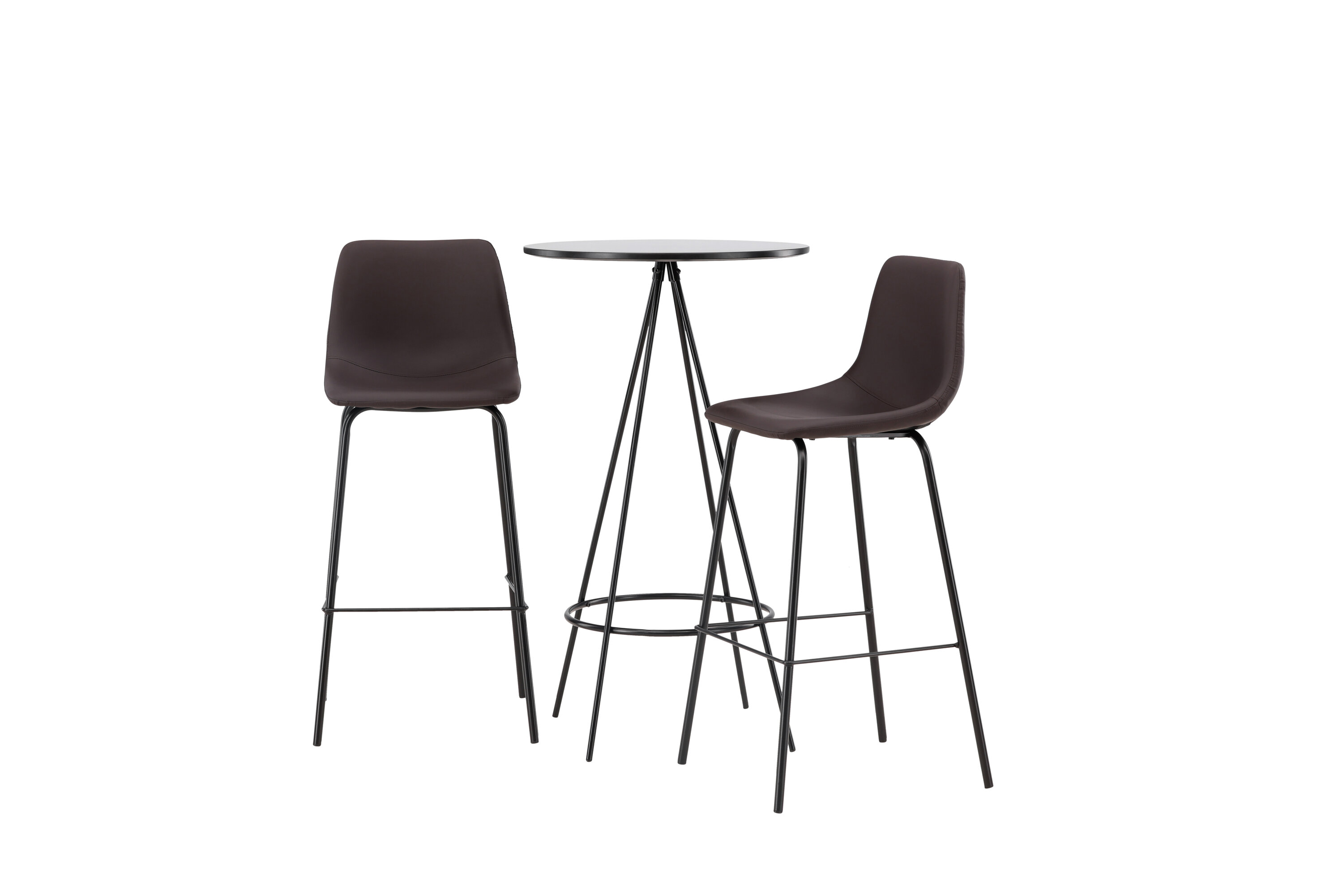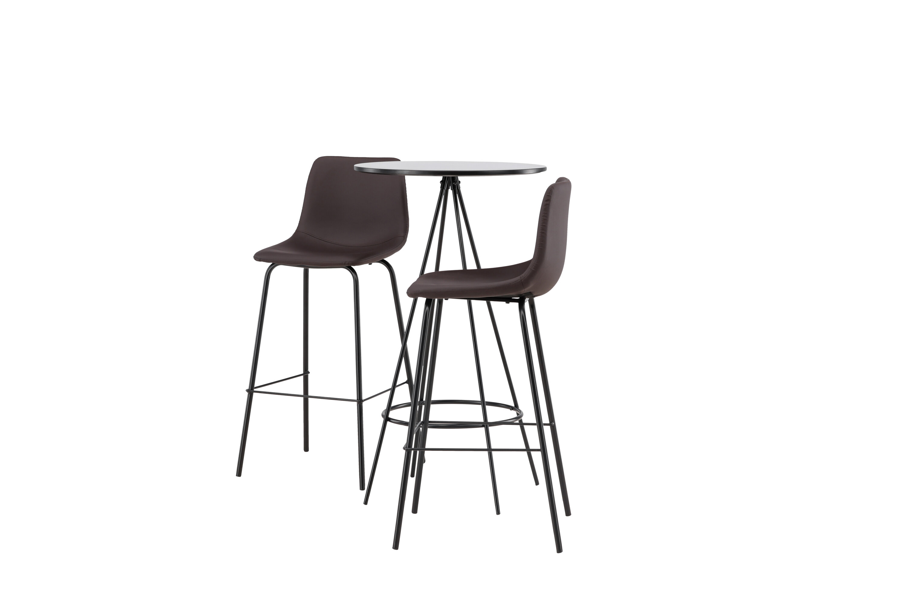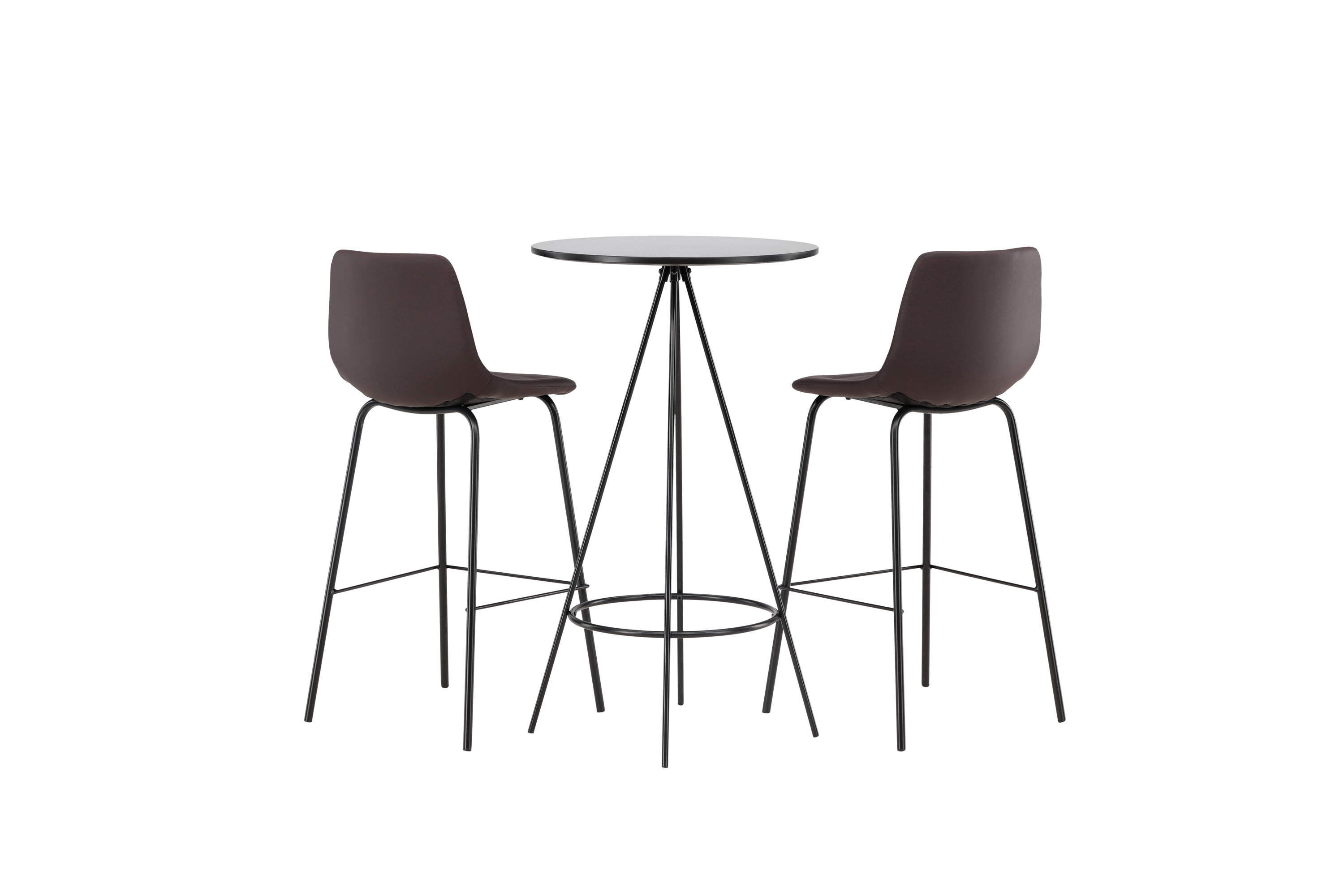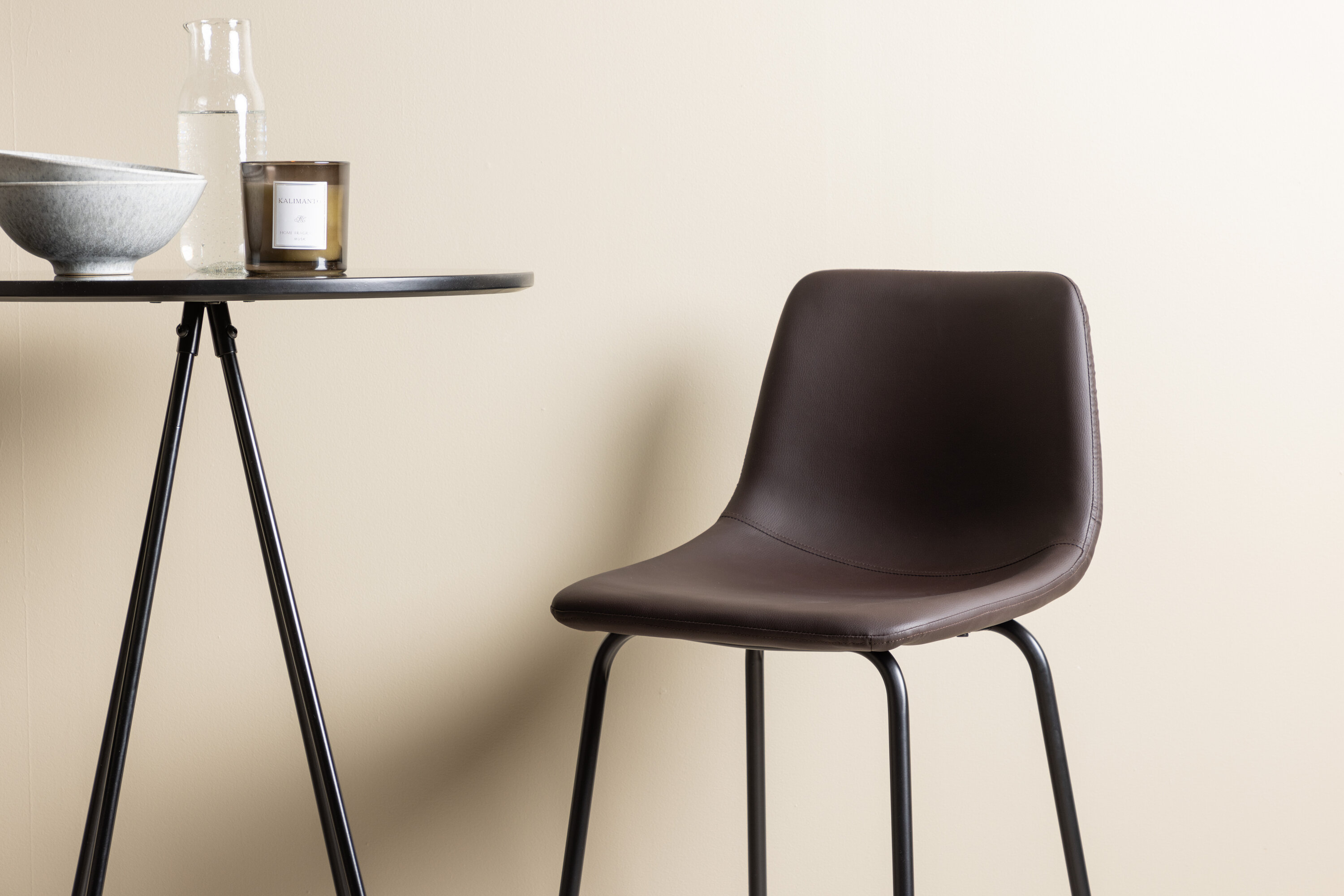 Stoffeer slim in moderne, aardse tinten! De Bistro bartafel heeft een minimalistisch, Scandinavisch design met een rond tafelblad in zwart MDF met fineer. De luchtige, kegelvormige tafelpoten zijn licht uitlopend in zwart metaal en hebben een geïntegreerd frame voor de voetensteun. Hier in stijlvolle combinatie met bruine barkrukken uit de Alexi serie. Het ontwerp is goed doordacht met een volledig gestoffeerde stoel in bruin gestoffeerd polyurethaanleer en polyester en smalle poten in zwart gepoedercoat metaal met geïntegreerde voetsteun voor extra comfort. Welkom thuis bij een trendbestendige bargroep! Tafelafmetingen: 60 cm.