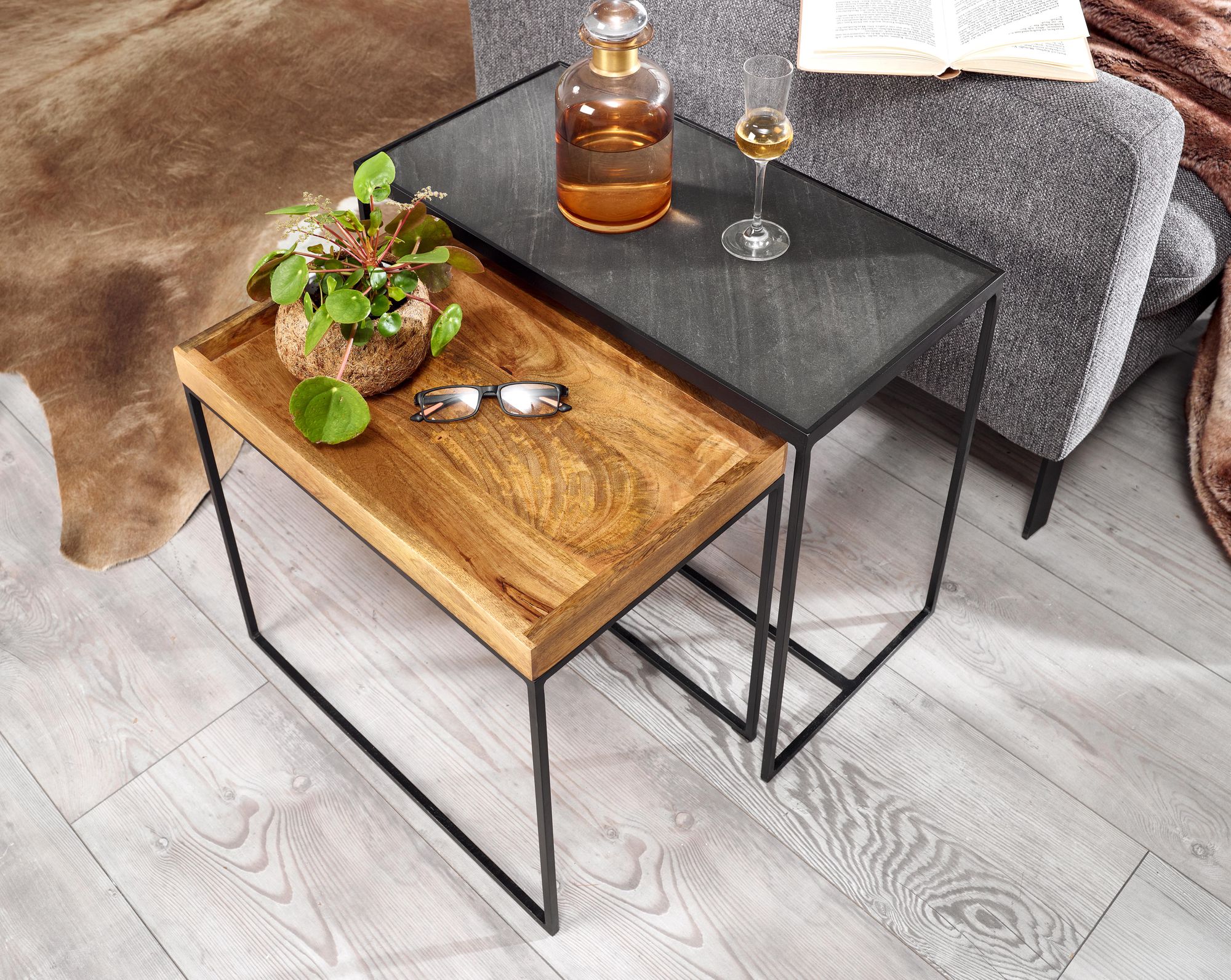 2-delige Bijzettafel Set Massief Mangohout / Steenlook Antraciet & Bruin | Zwart | 60x30x50 cm & 50x30x44 cm