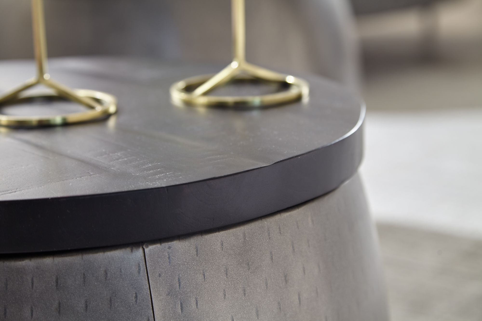 Breng industriële stijl in uw woonkamer met deze set van 2 ronde salontafels met een zorgvuldig afgewerkt ontwerp. De bladen zijn gemaakt van zwart gelakt gerecycled massief mangohout en rusten op zilverkleurige metalen frames die duurzaamheid en verfijnde esthetiek combineren.
