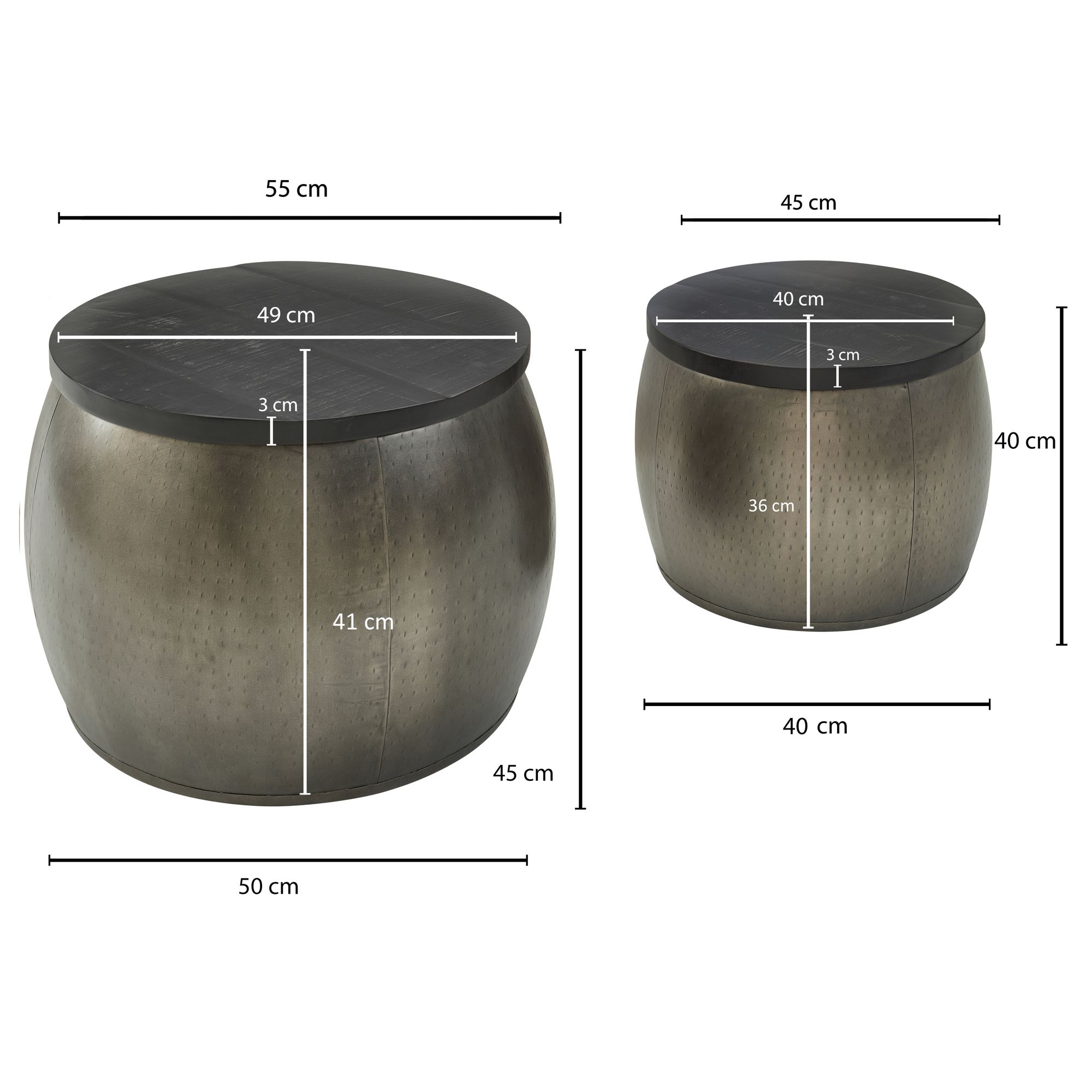 2-delige Mango Massiefhouten Salontafelset Zwart 55/45x45/40x55/45 cm | Zilverkleurig Industrieel Metaal | Rond met Opbergruimte