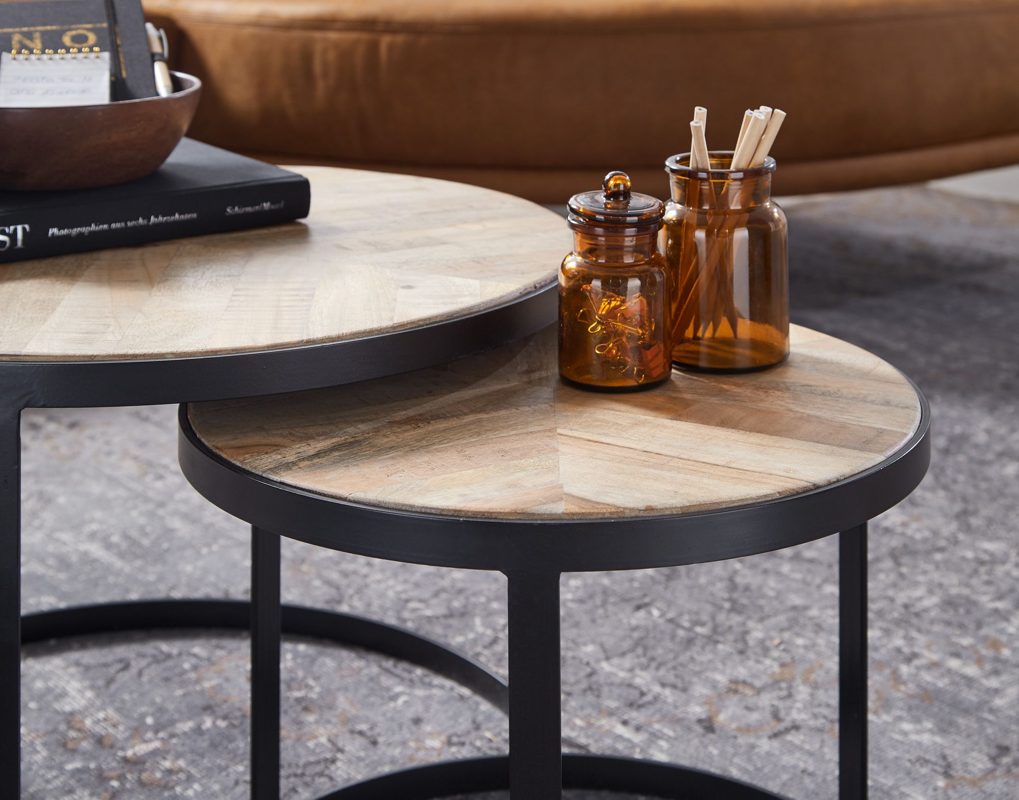 Deze set van twee ronde salontafels combineert modern industrieel design met een stijlvolle mix van massief hout en zwarte metalen poten. Elke tafel is handgemaakt, waardoor elk exemplaar uniek is met natuurlijke kleurnuances.