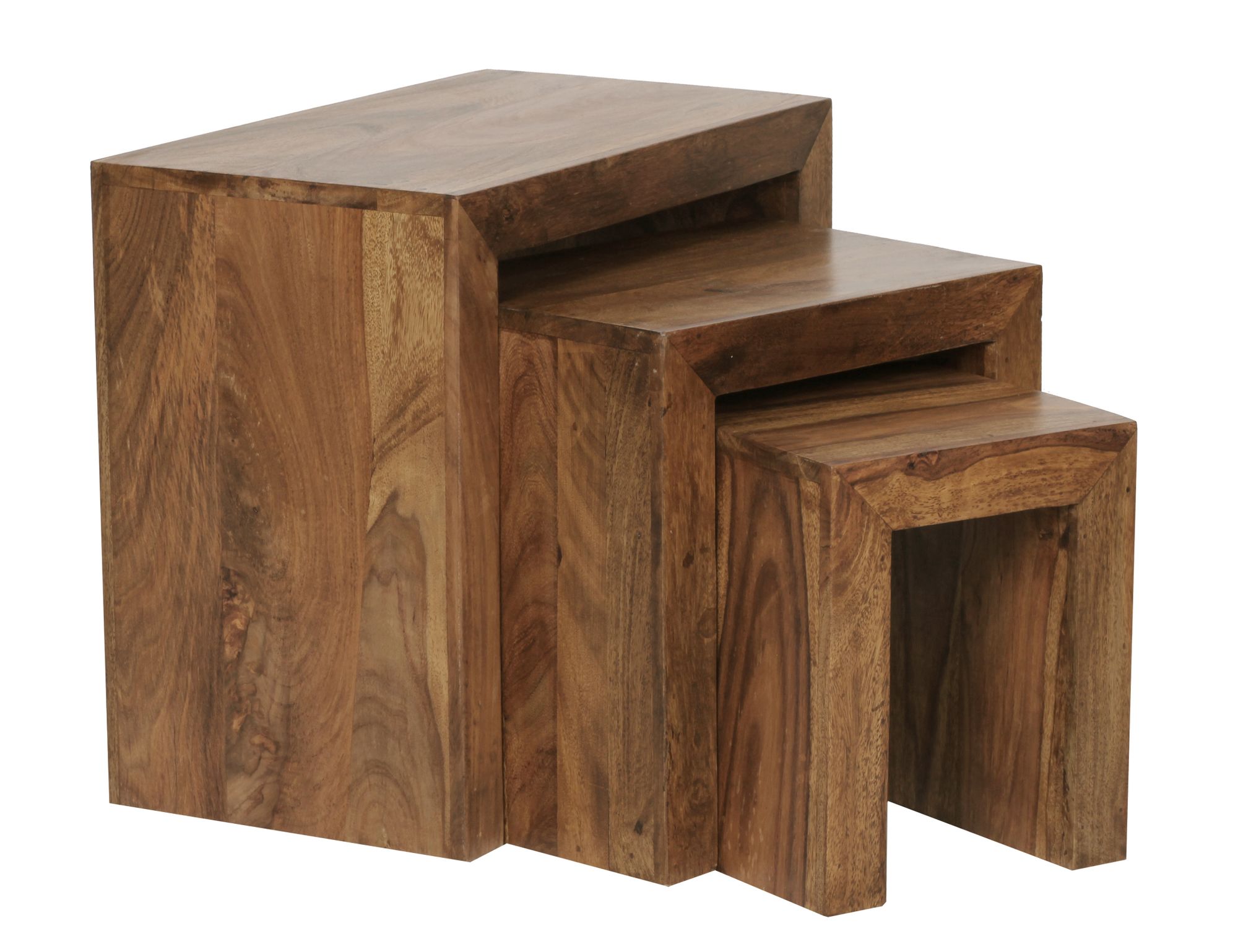 Ontdek deze set van 3 bijzettafels gemaakt van massief Sheesham hout in donkerbruin, perfect voor een landhuisstijl woonkamer. De natuurlijke afwerking benadrukt de unieke houtnerf en maakt elk stuk uniek en handgemaakt.