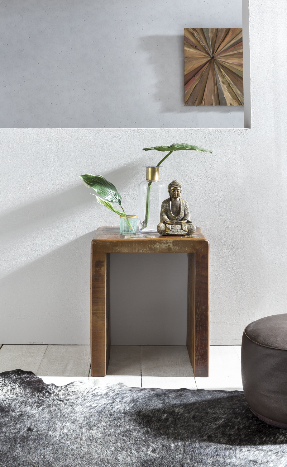 Gemaakt van gerecycled mangohout van oude boten, voorzien van transparante lak voor eenvoudige reiniging. Geschikt voor woonkamer en slaapkamer.