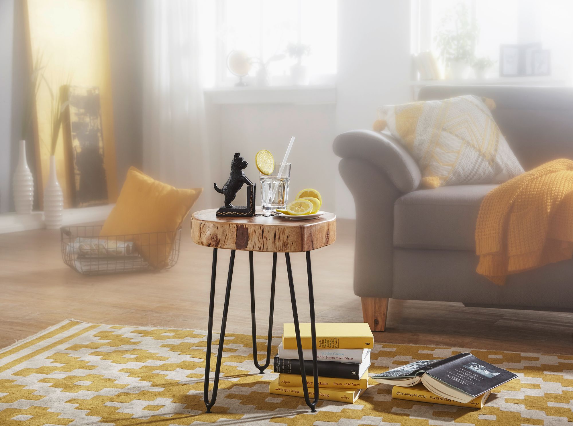 Breng natuurlijke elegantie in huis met de BAGLI bijzettafel van massief acaciahout. Het tafelblad met natuurlijke rand en drie stijlvolle metalen poten combineert klassiek design met moderne functionaliteit.