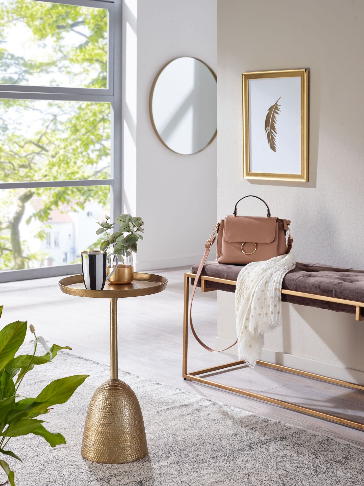 Deze kleine bijzettafel van mat gouden aluminium combineert elegantie met functionaliteit. Het ronde ontwerp met decoratief patroon op de voet creëert een uniek accent in uw woonkamer. De opstaande rand van het tafelblad houdt voorwerpen veilig. Perfect om tijdschriften, telefoon en decoratie in diverse ruimtes neer te zetten.