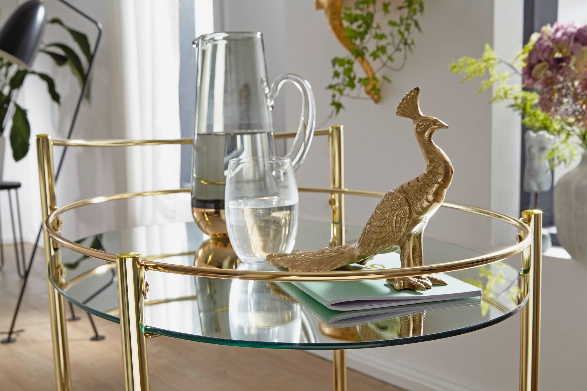- Kleur: Donker goud frame / wit glazen plateaus