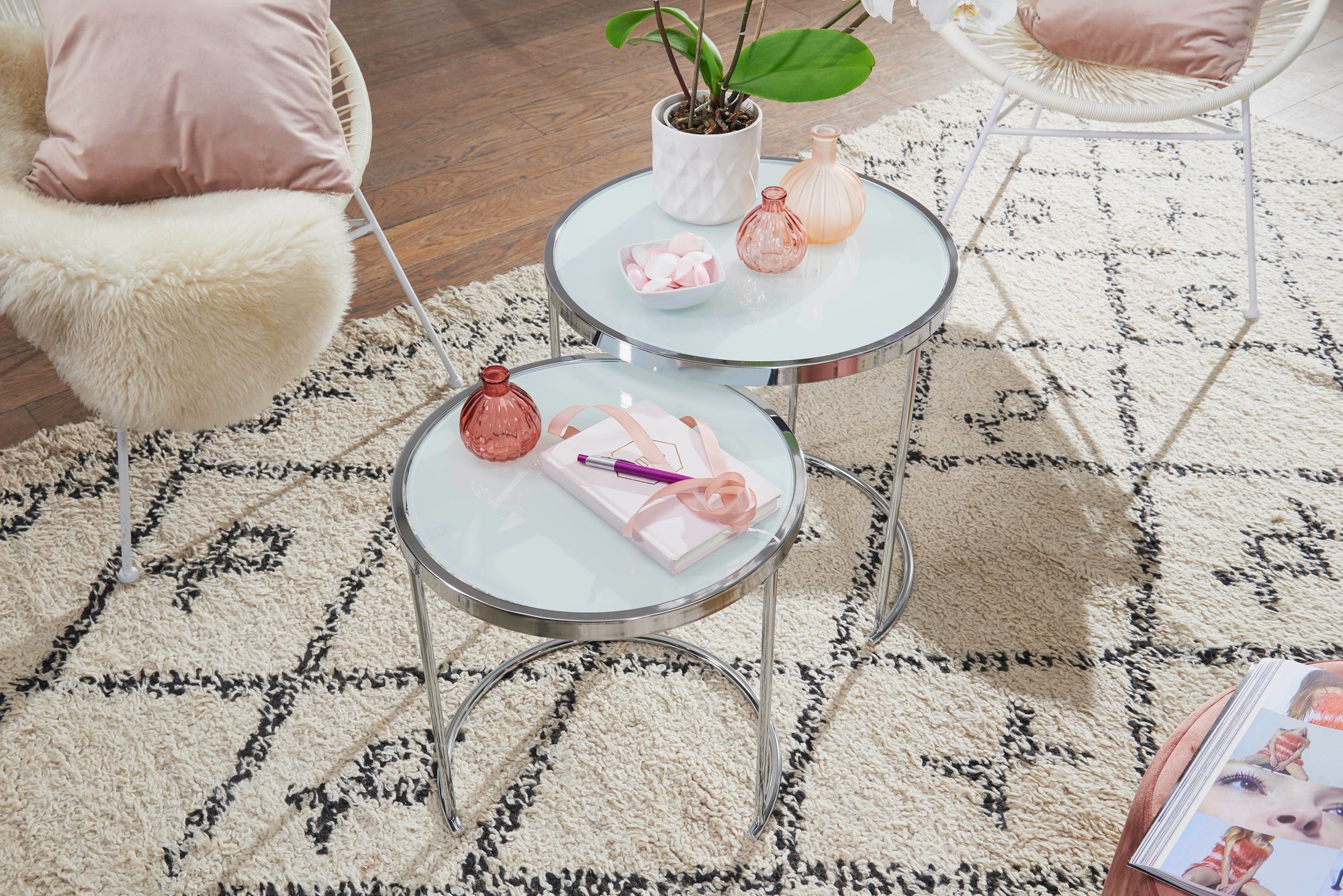 Deze tweedelige set ronde bijzettafels combineert een modern design met een verfijnd wit- en zilverkleurig kleurenpalet. Matglasbladen rusten op verchroomde stalen frames, waardoor een elegante en lichte uitstraling ontstaat.