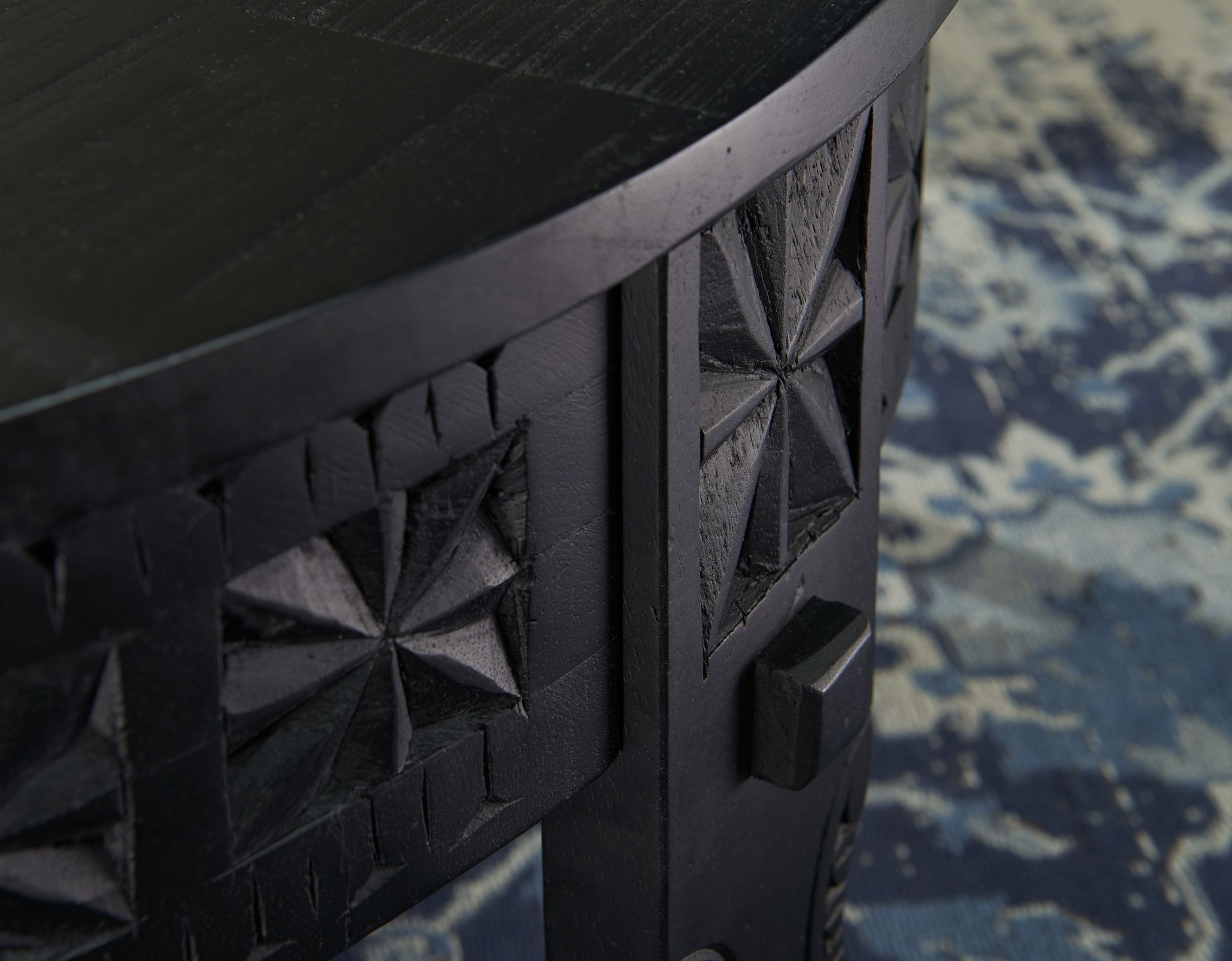 Voeg een oosterse uitstraling toe aan uw woonkamer met deze design salontafel van massief zwart mangohout. Het elegante ronde tafelblad biedt praktische opbergruimte.