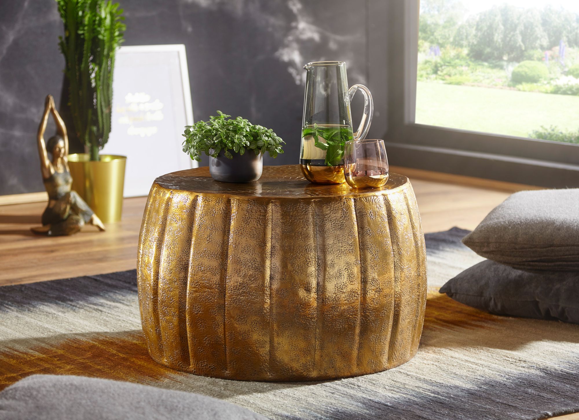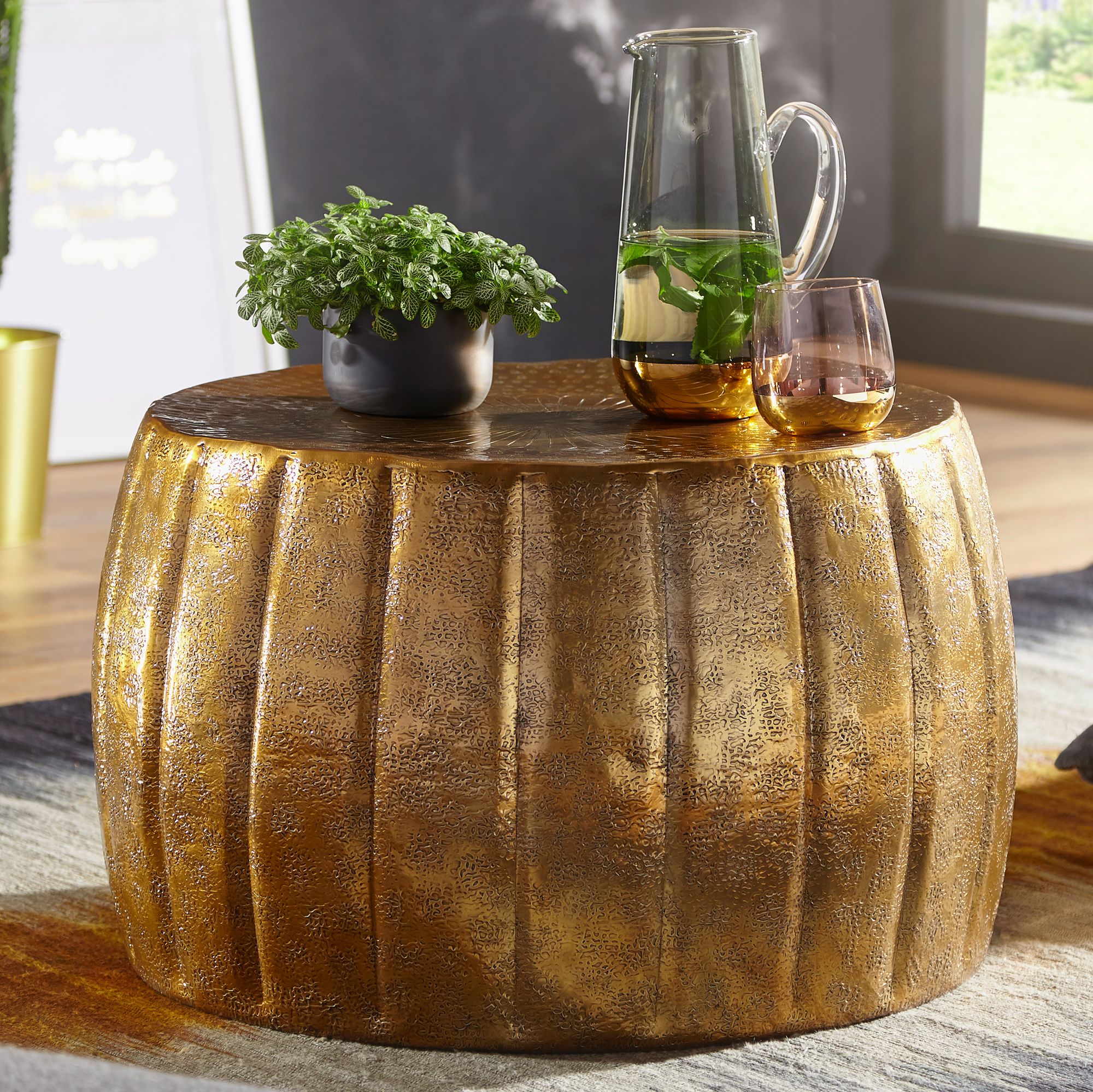 Breng een elegante oosterse touch met deze gouden aluminium salontafel van 60x36x60 cm. Het ronde blad met hamerslag afwerking is versierd met een verfijnd decoratief motief. Elk stuk is met de hand gemaakt, wat uniciteit en kwaliteit garandeert. Aluminium zorgt voor lichtheid en duurzaamheid.