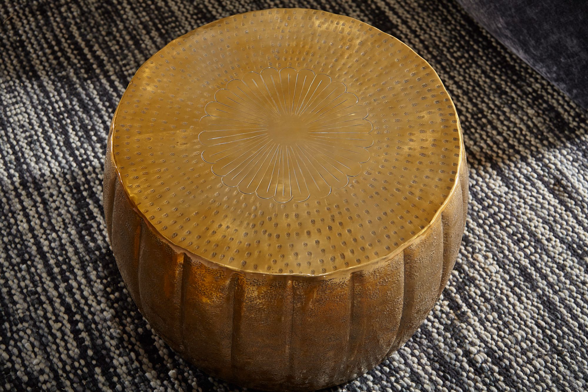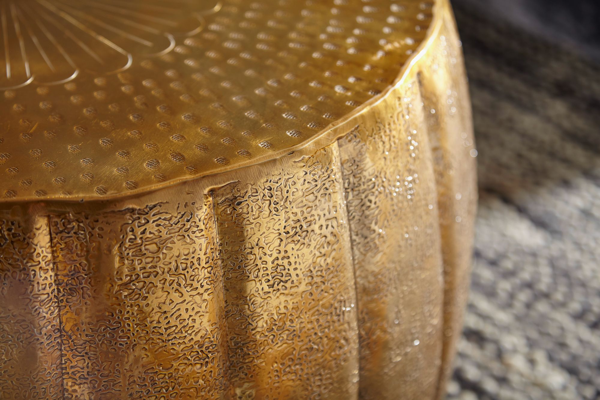 Productinformatie "Gouden aluminium salontafel oosters ontwerp | 60x36x60 cm | Ronde tafel met hamerslag structuur en decoratief motief"