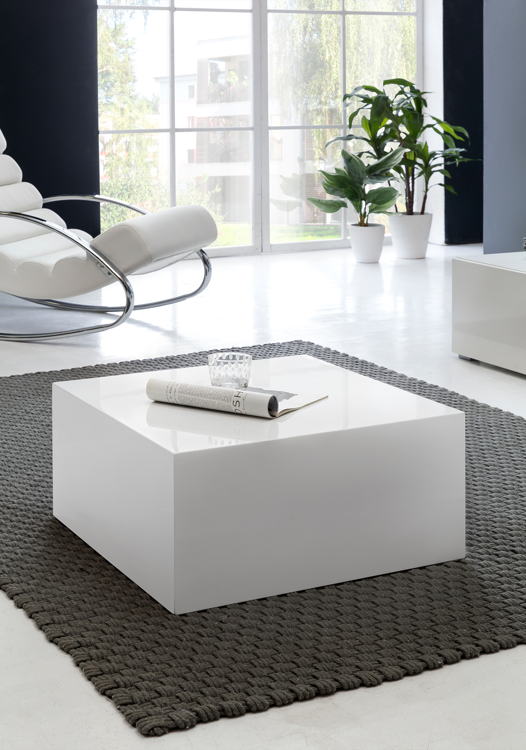 De MONOBLOC salontafel combineert modern design met praktische functionaliteit. De hoogglans wit gelakte MDF-afwerking geeft elke woonkamer een heldere en elegante uitstraling.