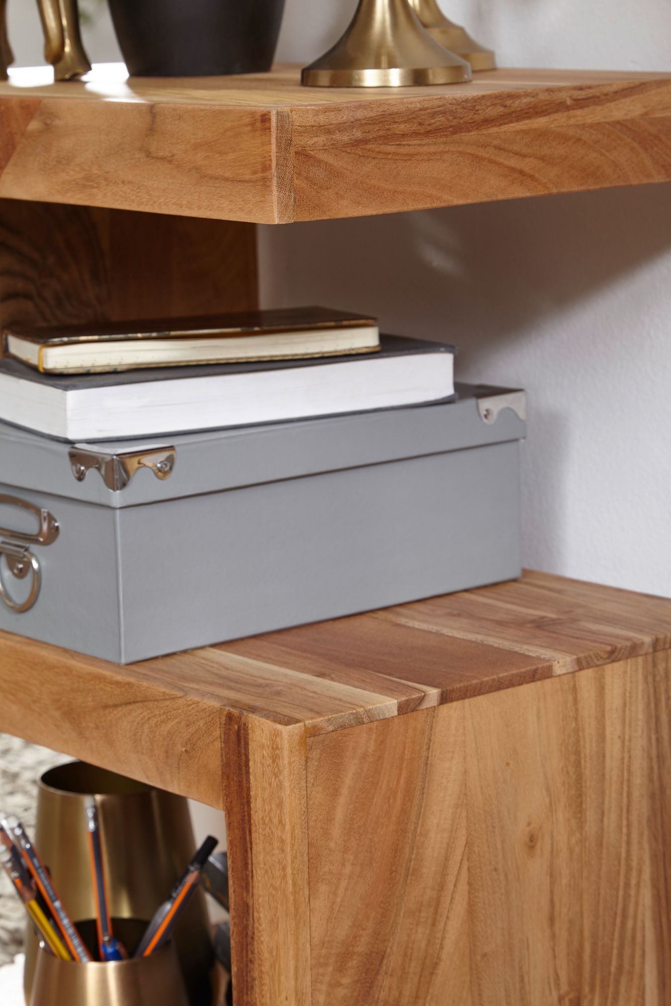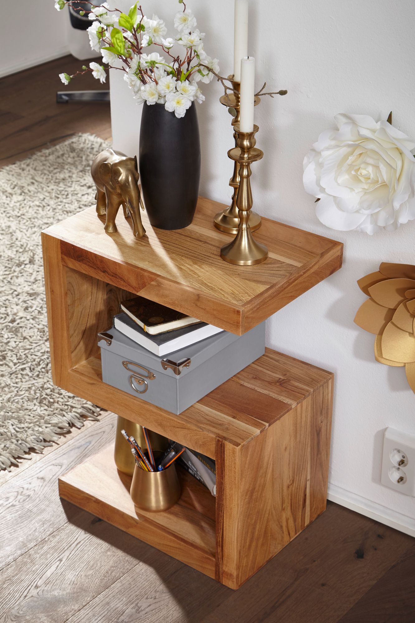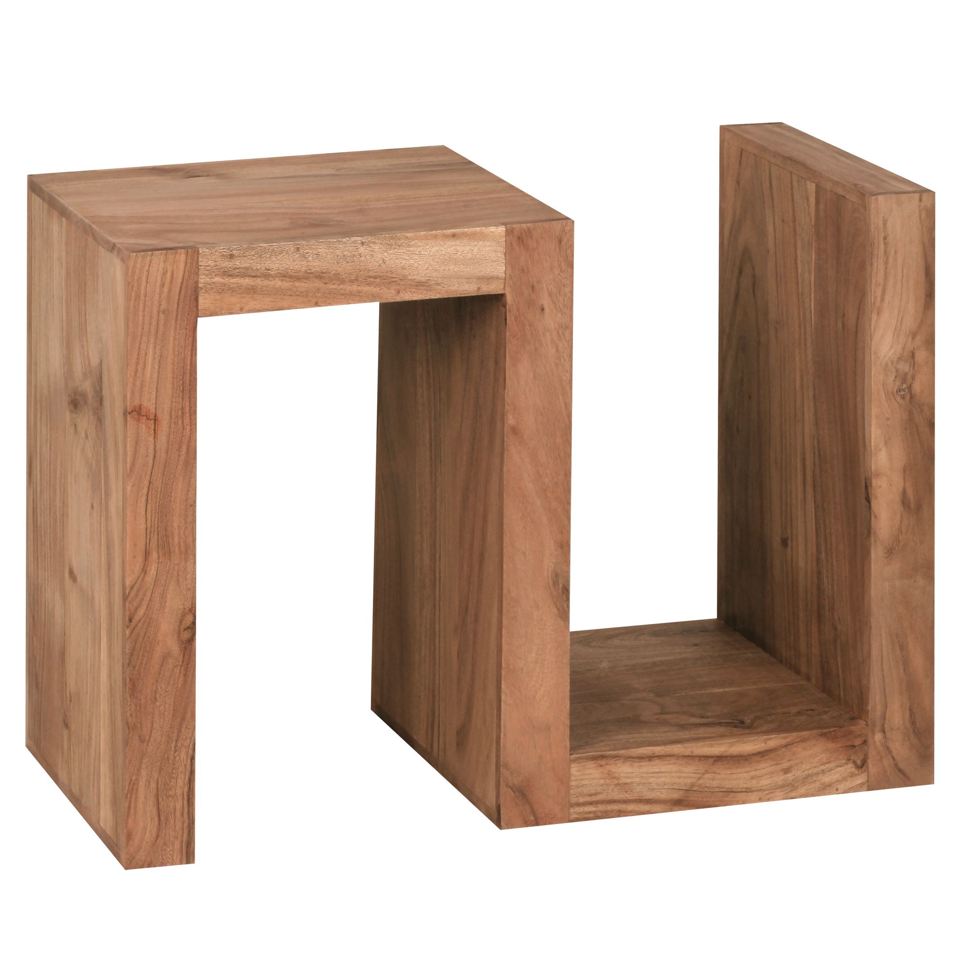 Ontdek de MUMBAI bijzettafel van massief acaciahout, 60 cm hoog, perfect voor uw woonkamer. Het unieke S-vormige design creëert extra opbergruimte voor tijdschriften of decoratie.