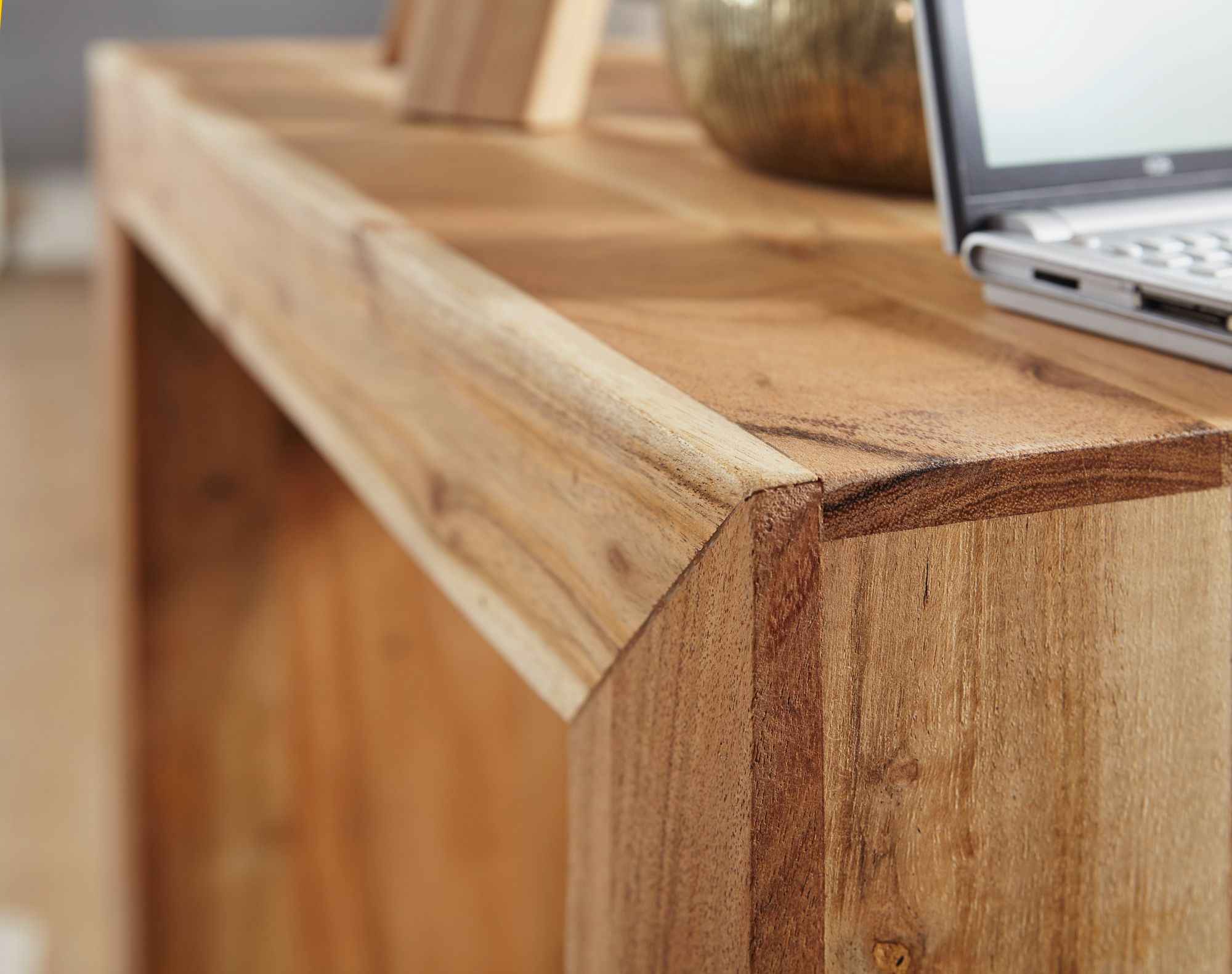 De MUMBAI bijzettafel van massief acaciahout combineert modern design met functionaliteit. De donker-natuurlijke houtkleur en compacte afmetingen maken hem perfect als extra tafel in de woonkamer, ook in kleine hoeken.