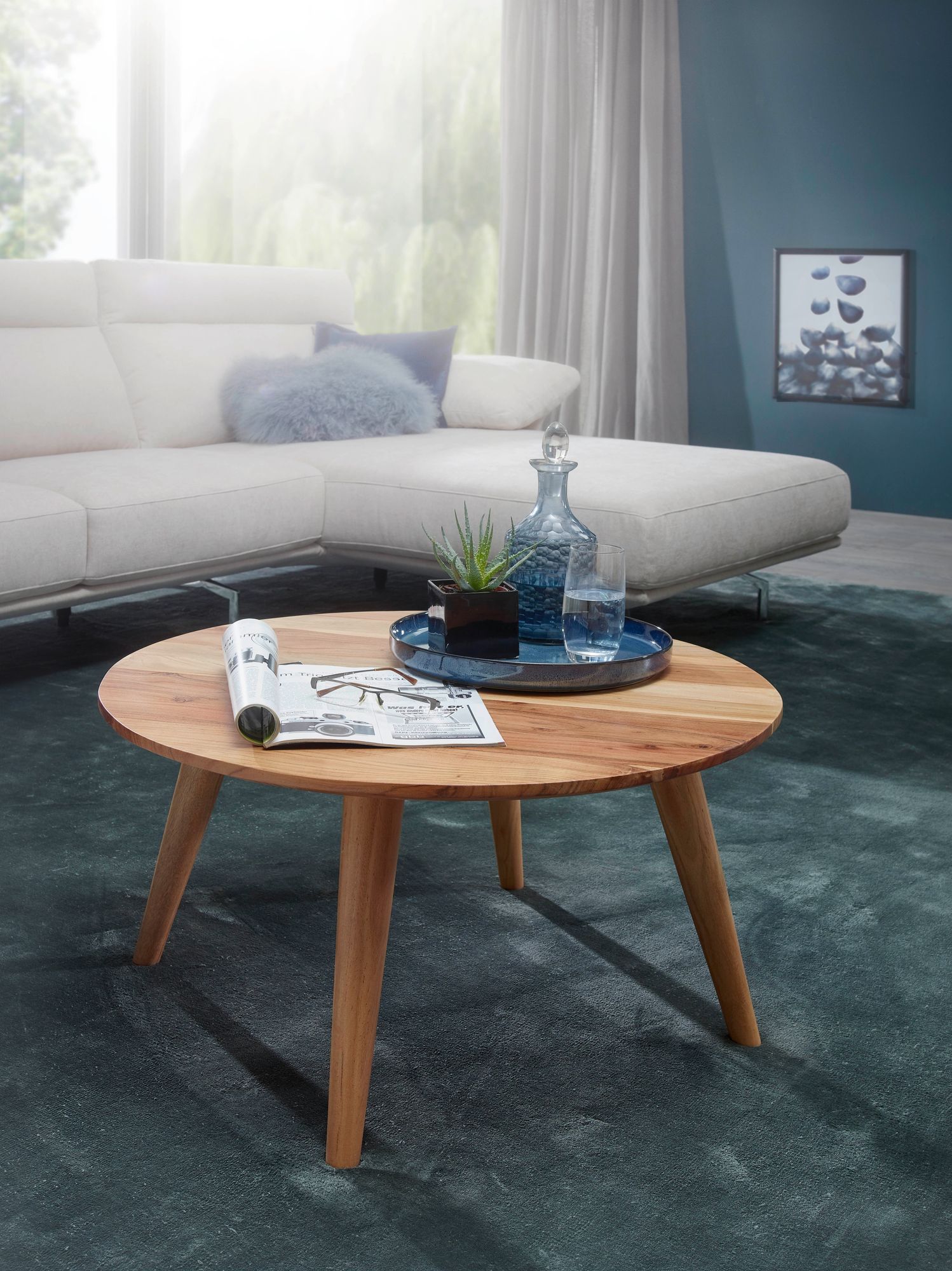 De BOHA salontafel heeft een ronde massief acaciahouten tafelblad met een diameter van 75 cm en straalt een natuurlijke en gezellige stijl uit. De vier naar buiten hellende poten zorgen voor extra stabiliteit en een mooie landelijke uitstraling. Perfect om functionaliteit en charme toe te voegen in uw woonkamer.