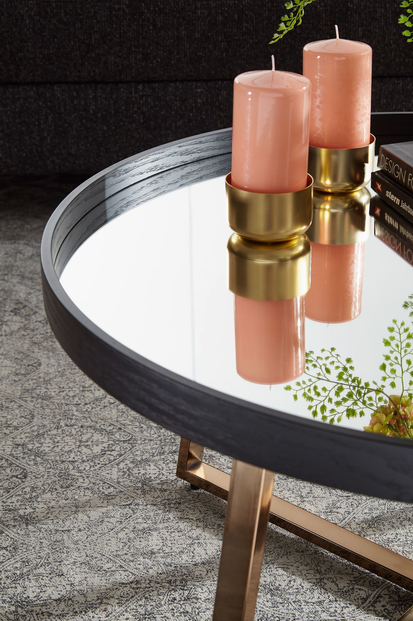 Deze ronde salontafel valt op door het moderne design met donker gouden metalen frame en zwarte spiegel glazen blad, perfect voor uw woonkamer.