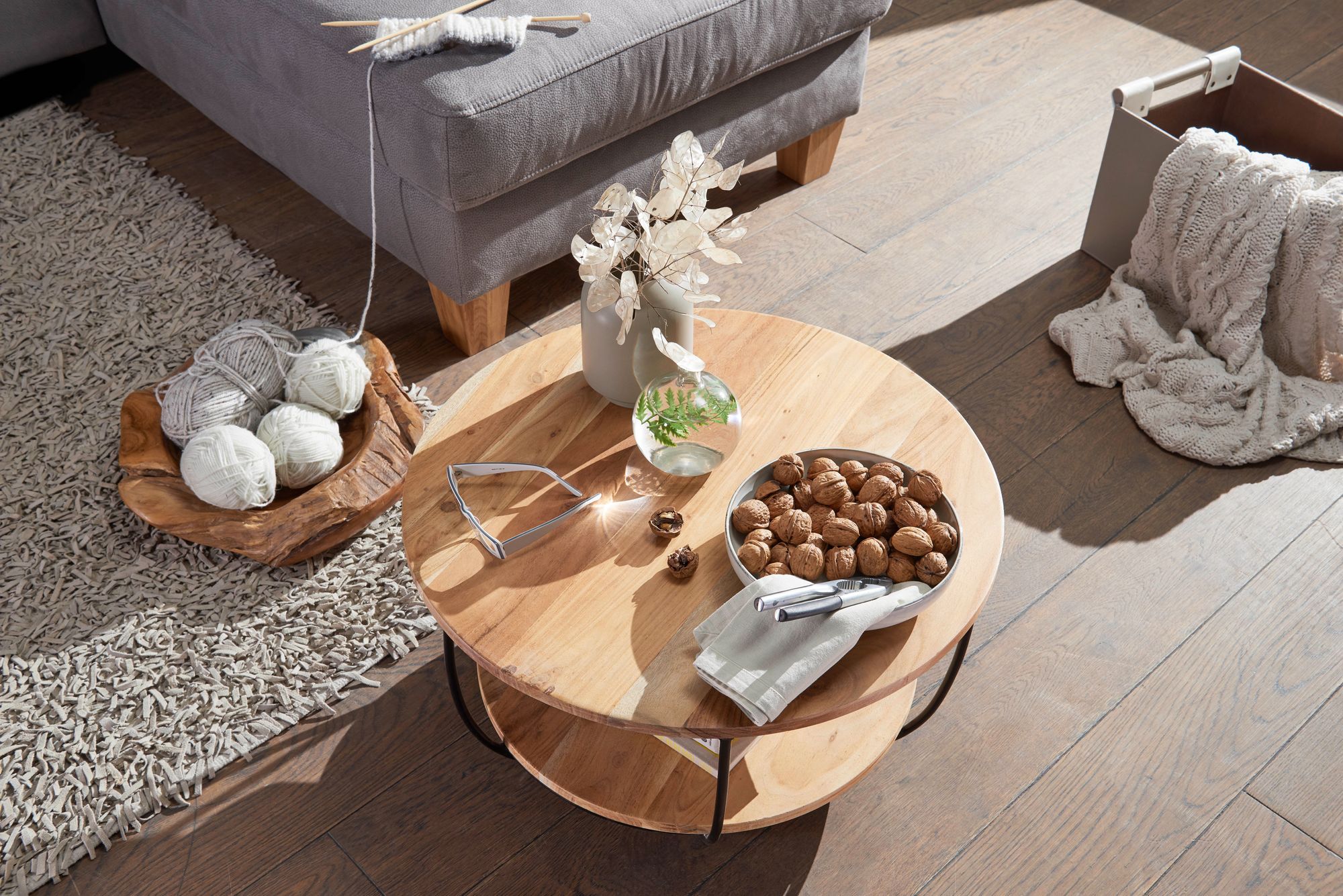 Geef je woonkamer een warme industriële uitstraling met deze ronde salontafel van massief acaciahout in natuurlijke bruine kleur. Het ronde tafelblad biedt voldoende ruimte voor je dagelijkse spullen, terwijl de tweede plank extra opbergruimte creëert. Het matzwarte metalen frame zorgt voor stabiliteit en een moderne uitstraling.