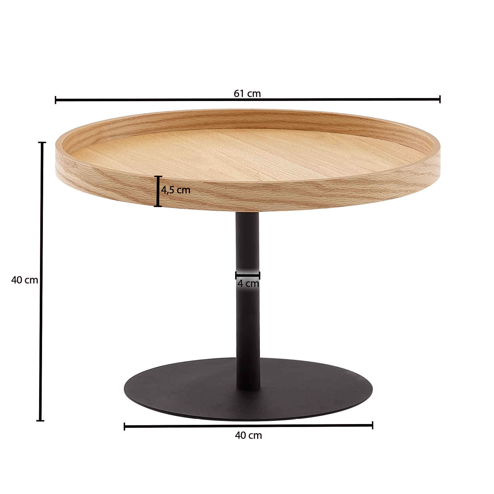- Materialen: MDF met eikenfineer, tulpenhouten ring, gepoedercoat stalen frame