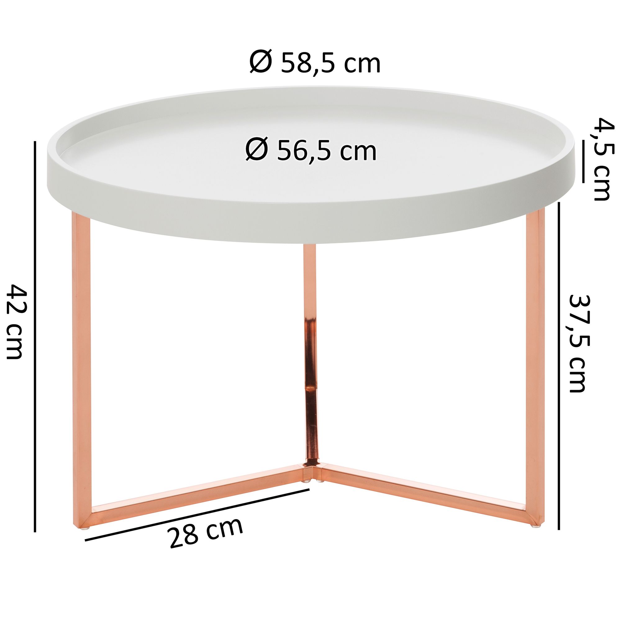 Productinformatie "Ronde Wit en Koper Metalen Salontafel | Wit Houten Blad | 58,5 x 42 x 58,5 cm"