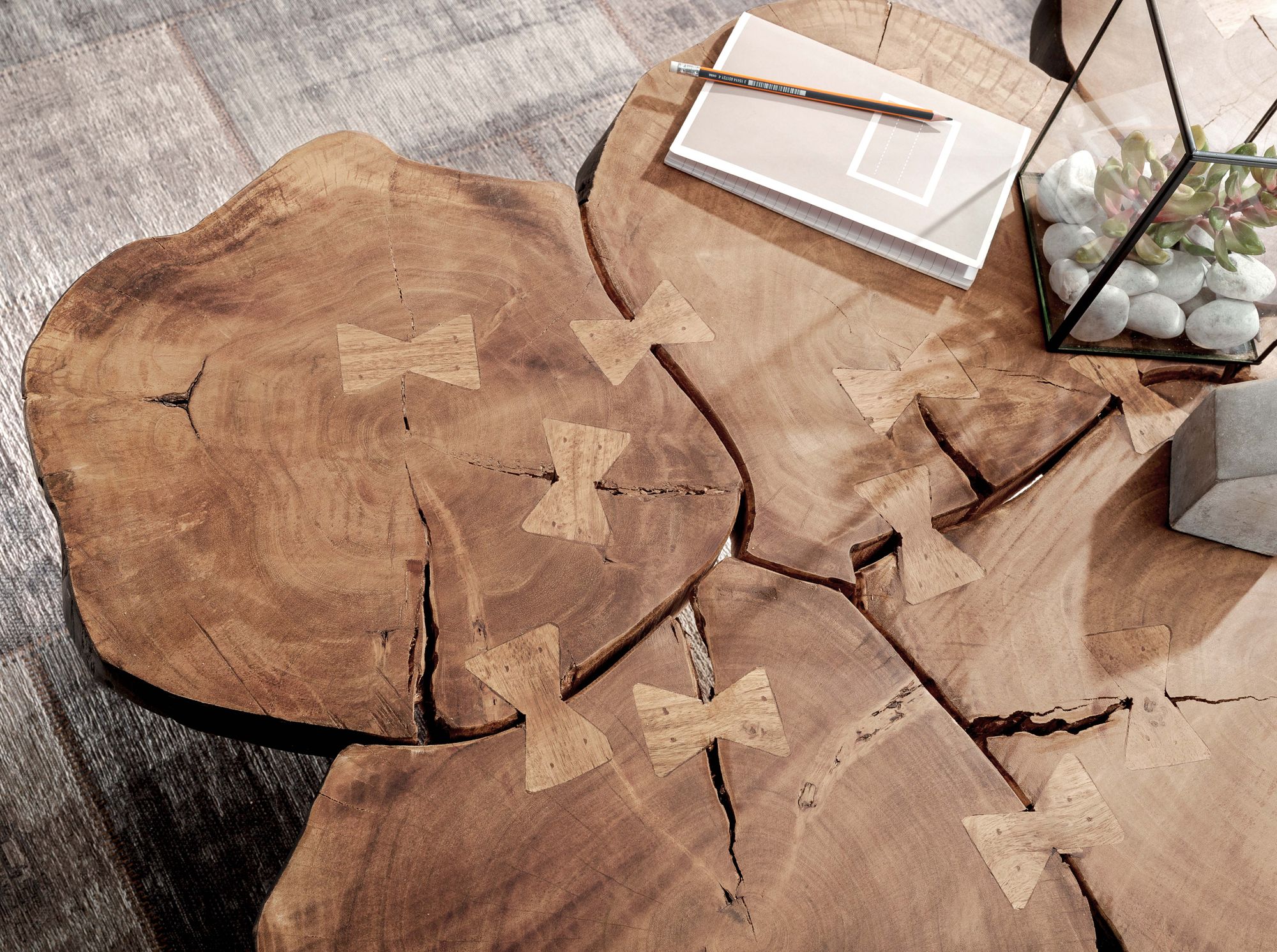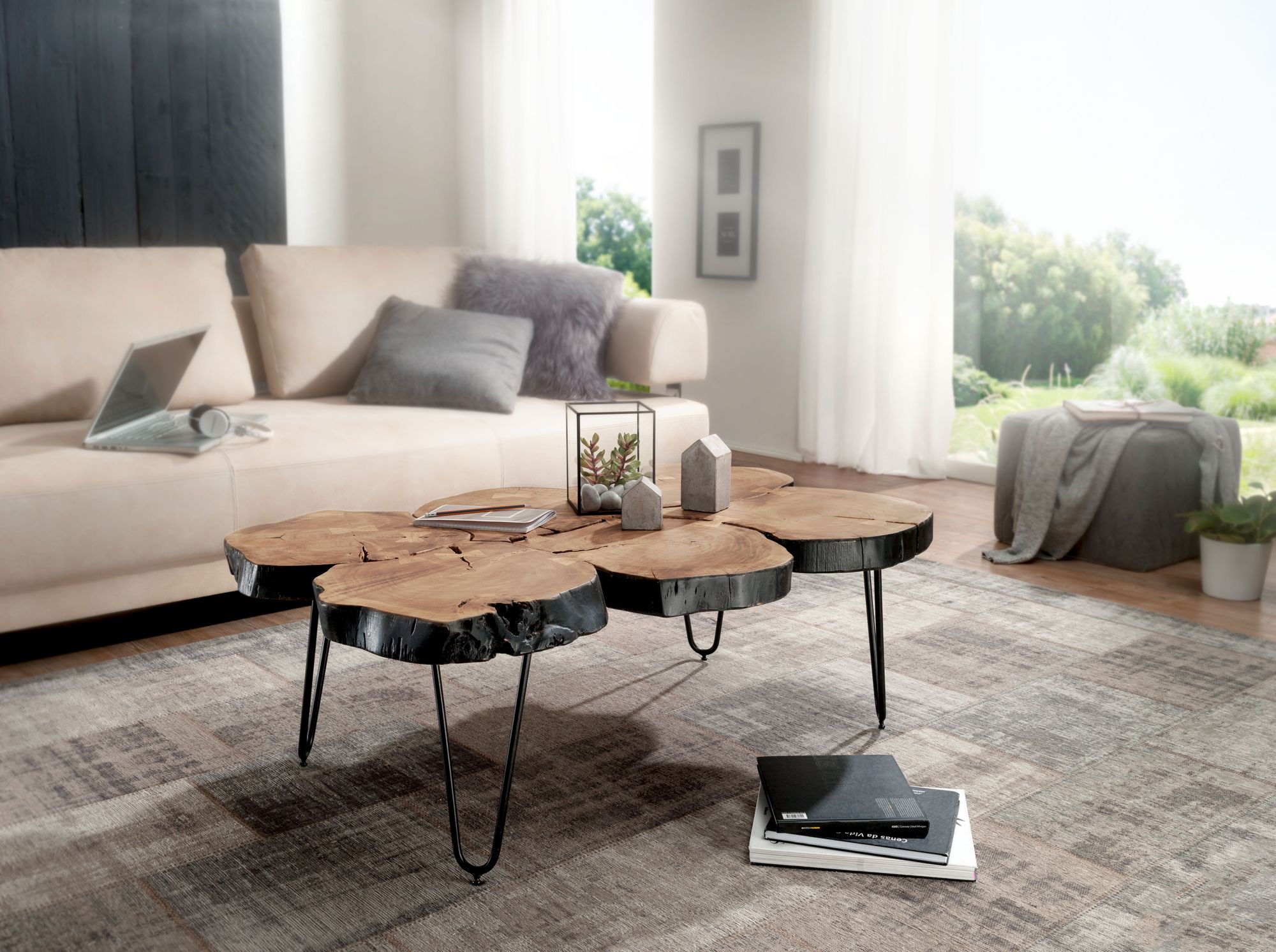 De BAGLI salontafel van massief natuurlijk acaciahout combineert elegant design met functionaliteit. Met zes tafelbladen in de vorm van boomstamplakken en vier stijlvolle metalen poten biedt hij ruim plaats voor de woonkamer met een warme, klassieke uitstraling.