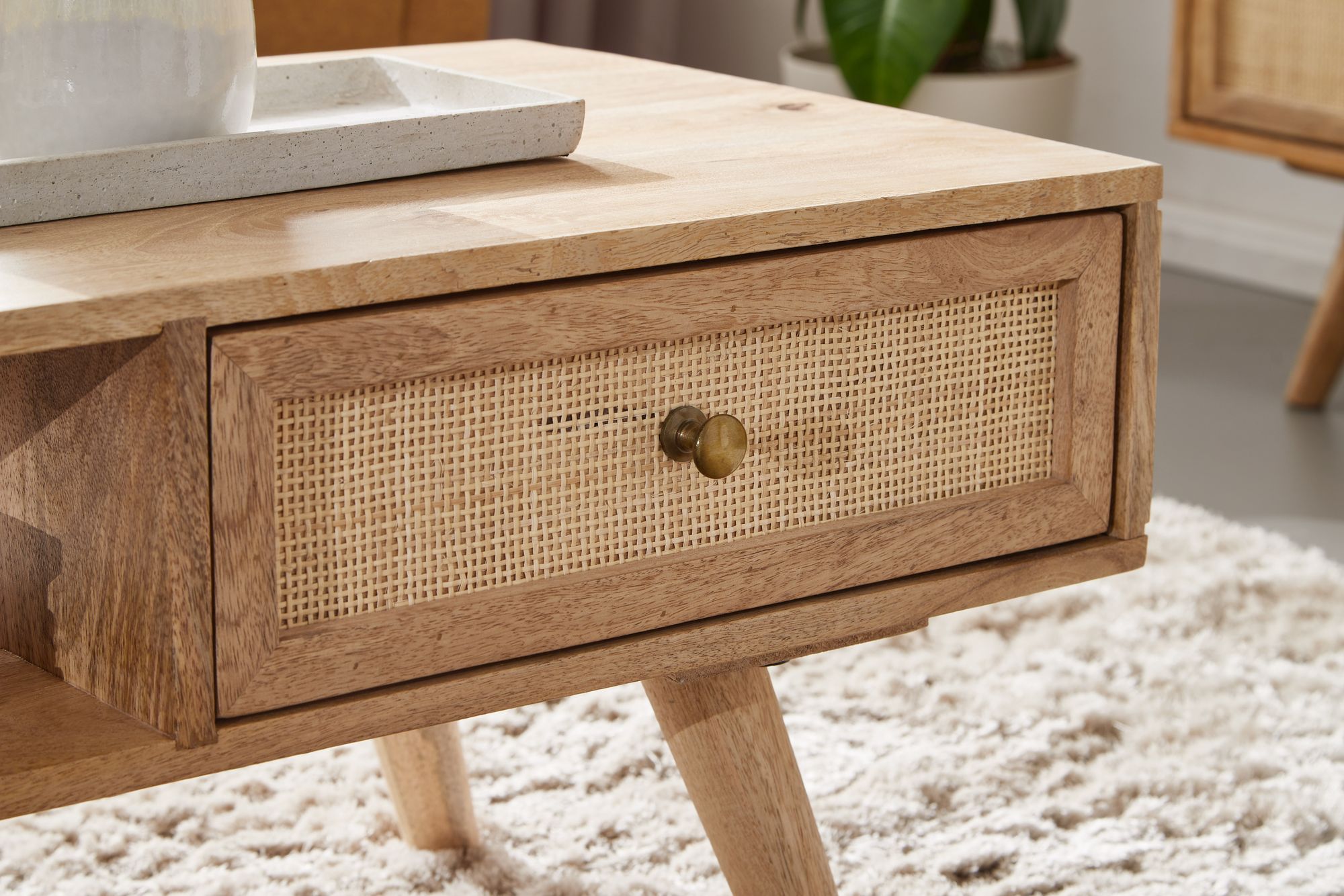 Voeg natuurlijke elegantie toe aan uw woonkamer met deze salontafel van massief mangohout en rotan. De bruine afwerking met gouden greep geeft een tijdloze uitstraling.