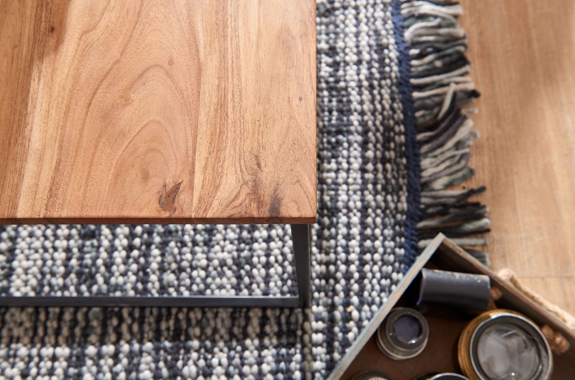 - Materialen: massief acaciahouten blad met blanke lak, matzwarte gepoedercoate metalen poten.