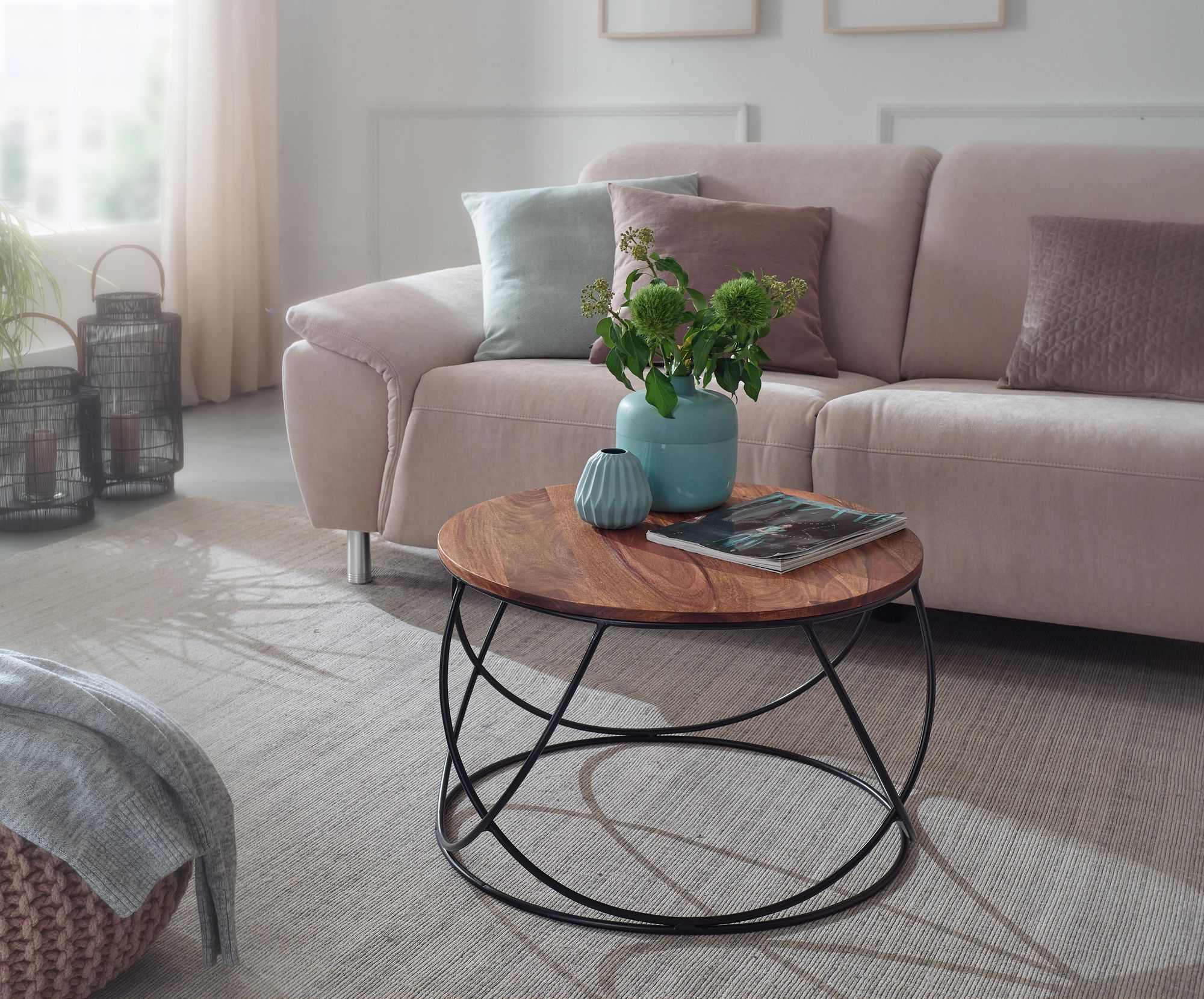 Voeg een industriële charme toe aan uw interieur met deze ronde salontafel van massief Sheeshamhout, 60x40x60 cm. Het ronde blad combineert schoonheid met functionaliteit voor dagelijks gebruik.