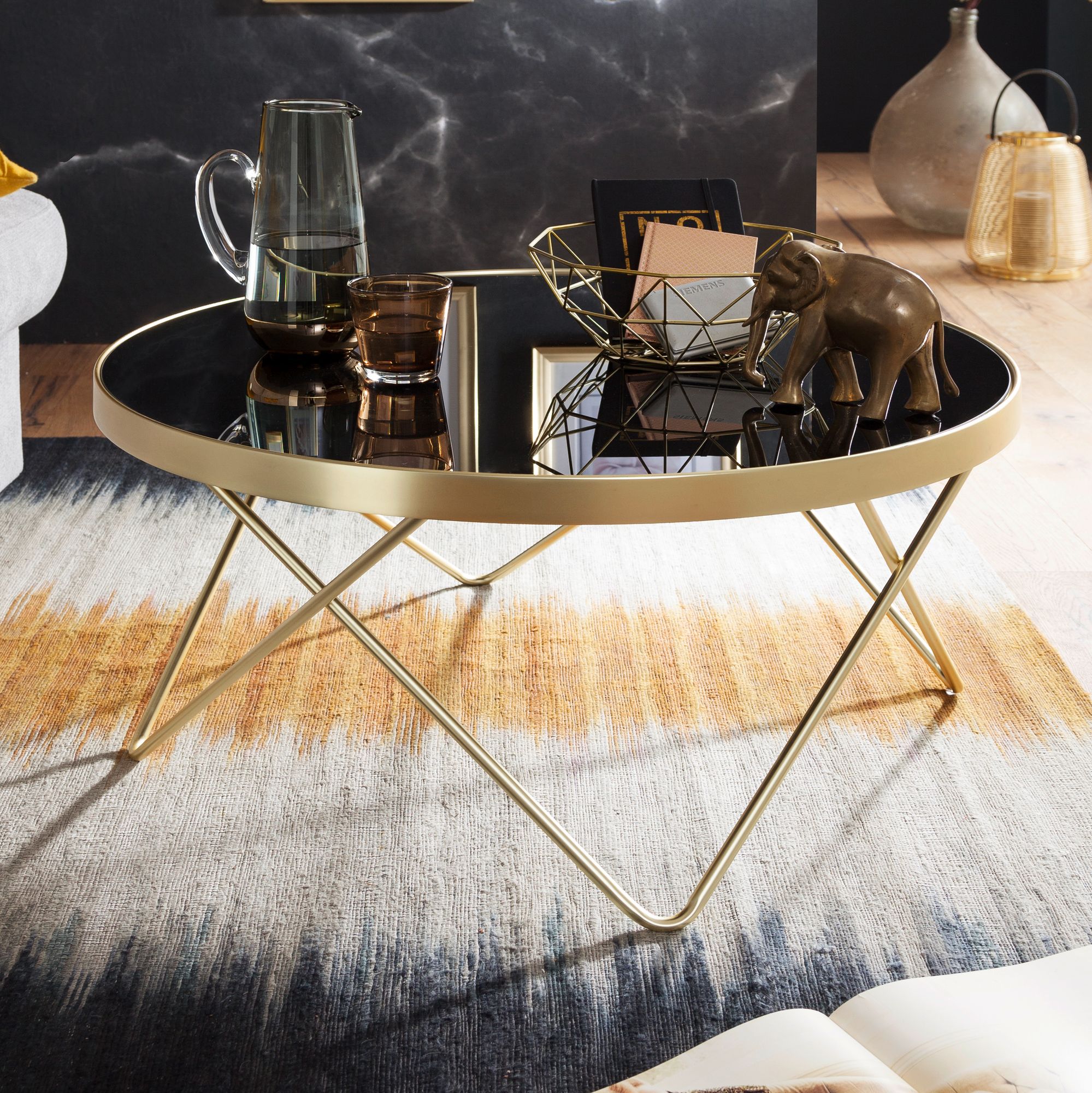 Breng een vleugje moderne retro elegantie in uw woonkamer met deze salontafel Ø 82 cm die metaal en zwart glas combineert. Het goudgelakte stalen frame met stevig veiligheidsglasblad staat garant voor stijl en duurzaamheid.