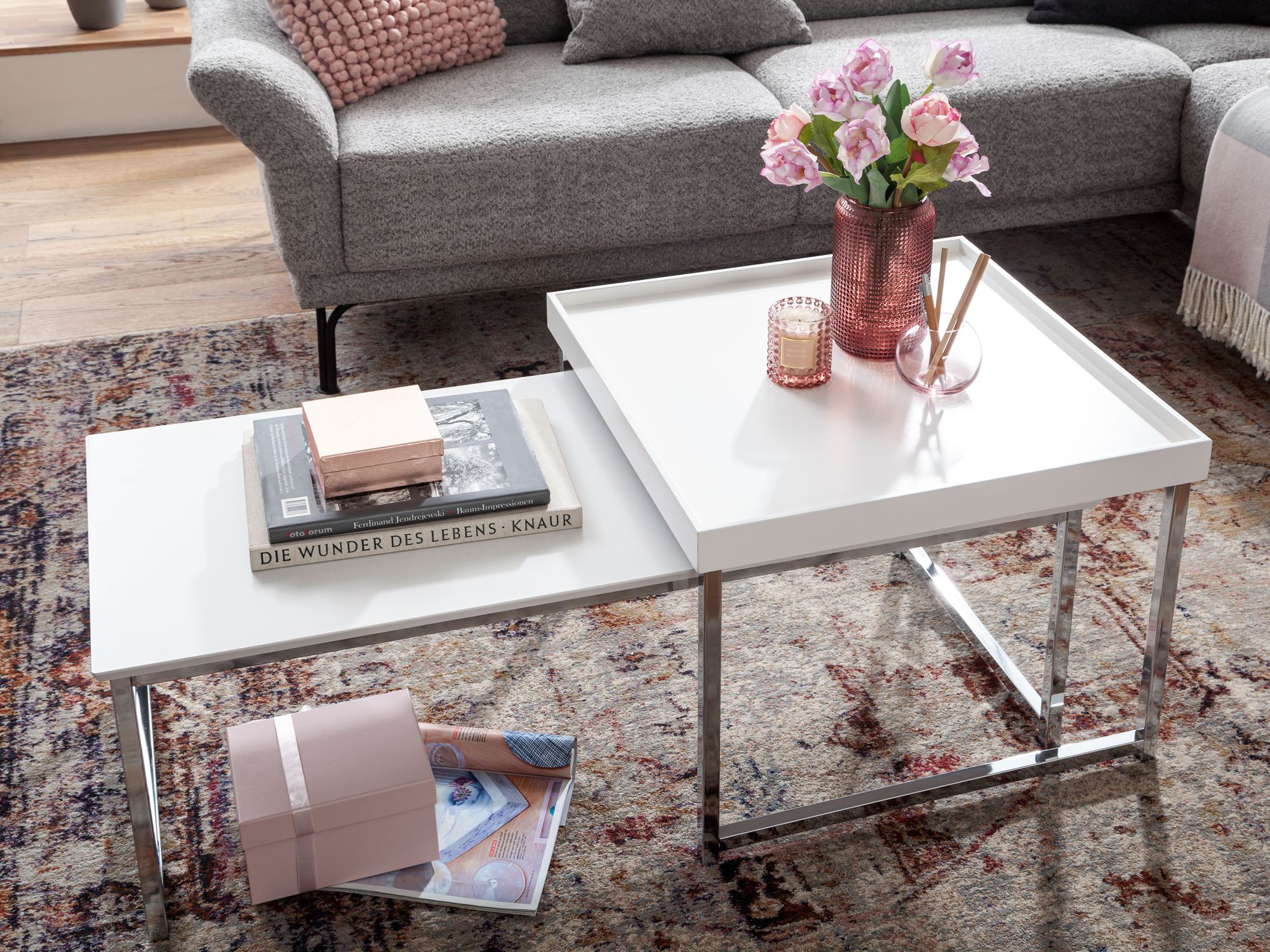 Deze set van 2 salontafels combineert modern design met functionaliteit. Met rechthoekige en vierkante vormen voegen de tafels een elegante uitstraling toe aan uw woonkamer dankzij het wit gelakte MDF blad en stevige zilveren metalen frames.