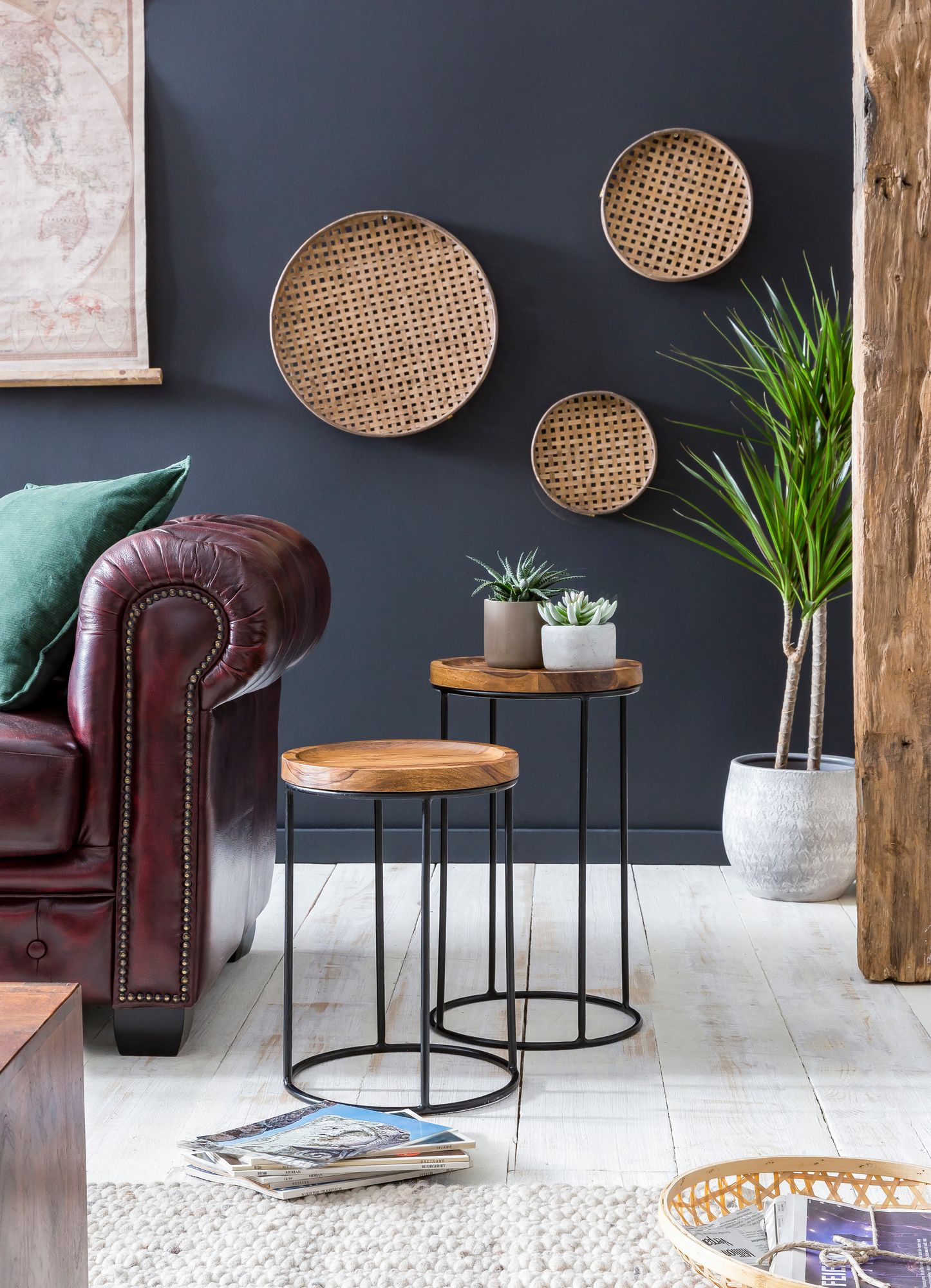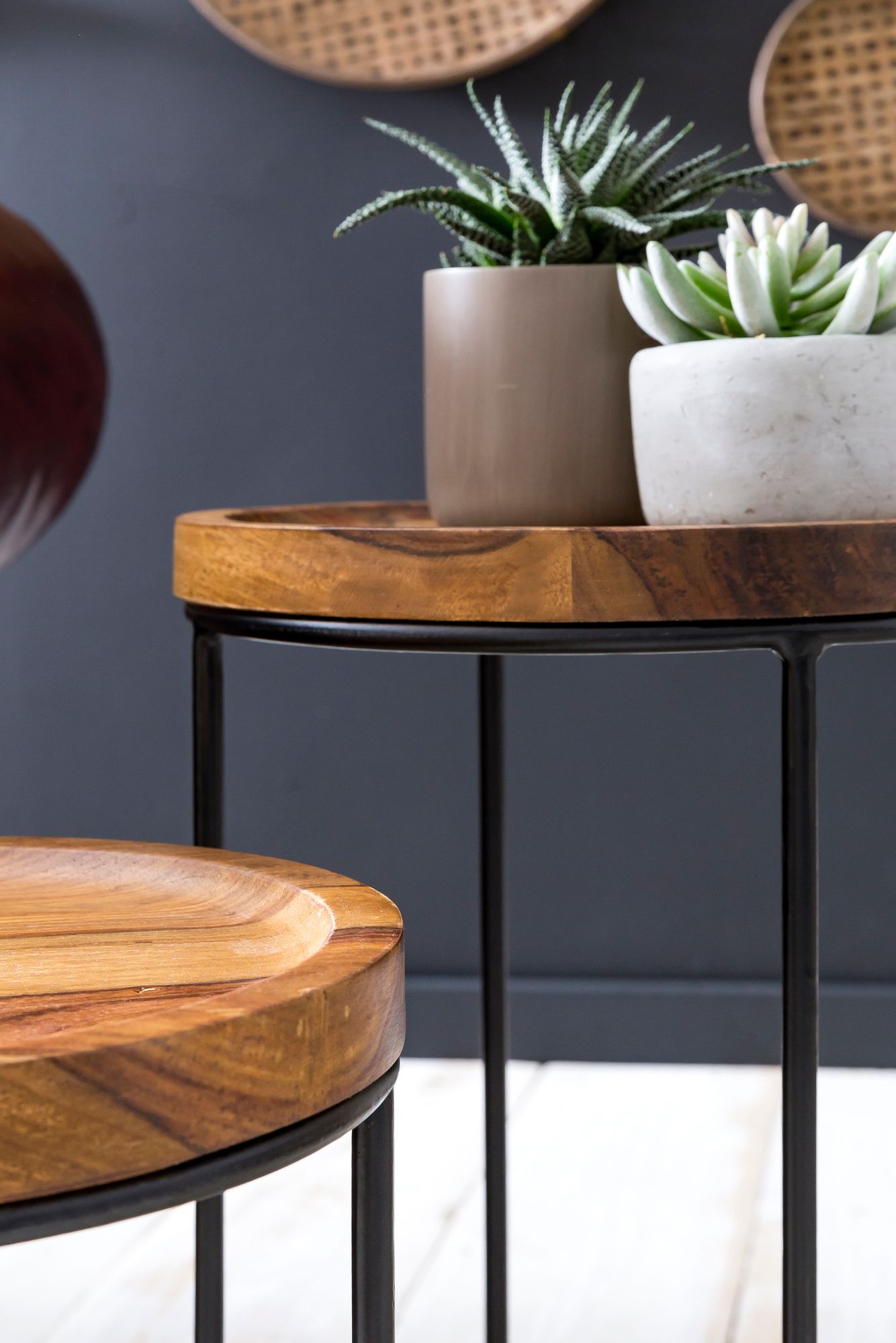 Geef uw woonkamer een industriële charme met deze set van 2 bijzettafels van massief bruin Sheesham hout en matzwarte metalen frames. Elke handgemaakte tafel is natuurlijk en stevig afgewerkt.