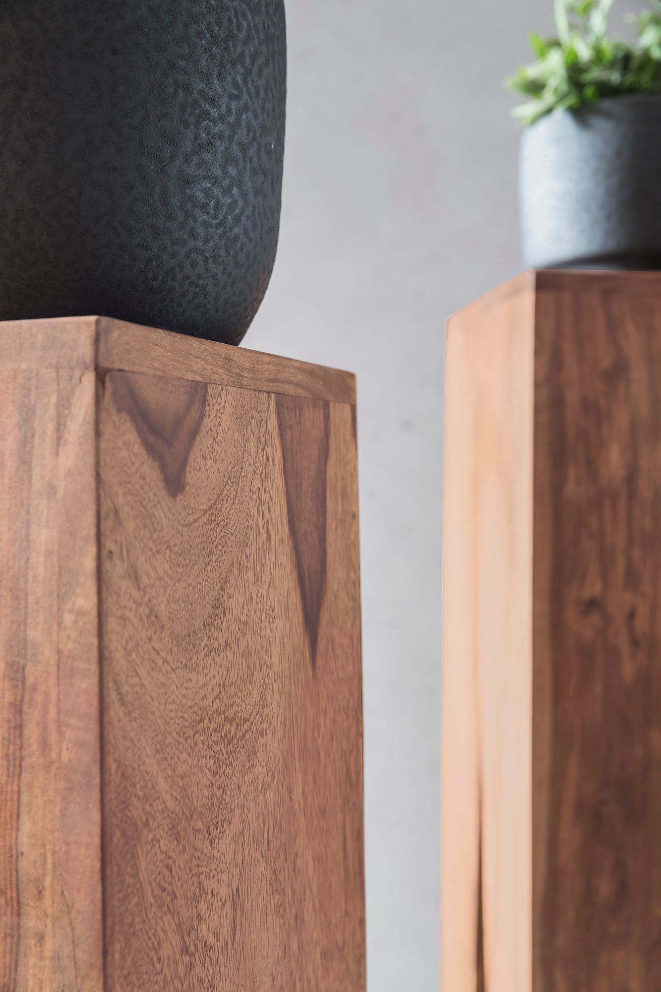 Deze set van 3 bijzettafels van natuurlijk massief acaciahout heeft een modern vierkant ontwerp met slanke zuilpoten. Perfect voor decoratieve items, elke tafel toont een unieke natuurlijke houtnerf.