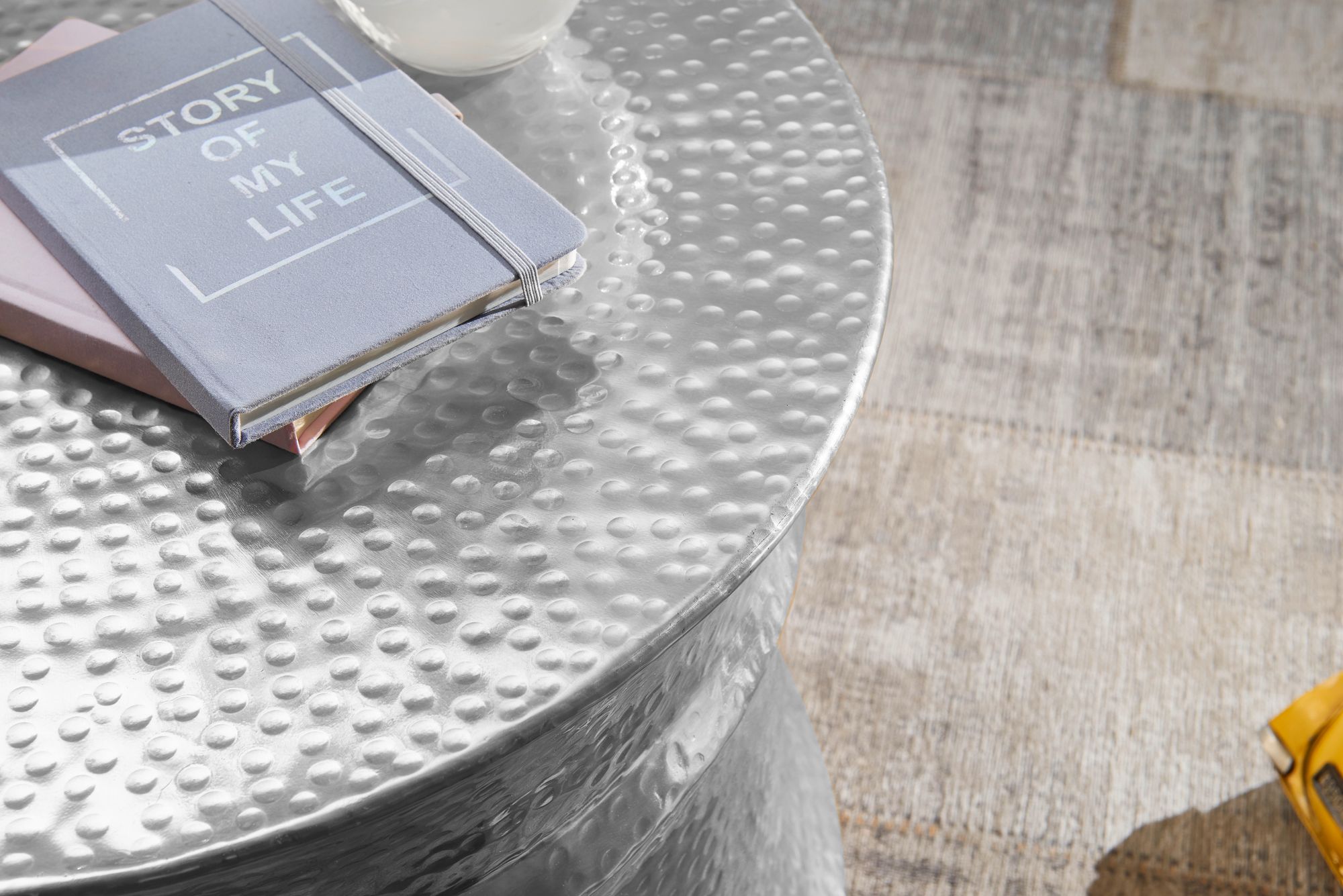 Breng een unieke oosterse sfeer in je woonkamer met deze zilveren aluminium salontafel van 62x41x62 cm. De gehamerde afwerking is handgemaakt en zorgt voor decoratieve charme en stevigheid, ideaal voor dagelijkse gebruiksvoorwerpen.