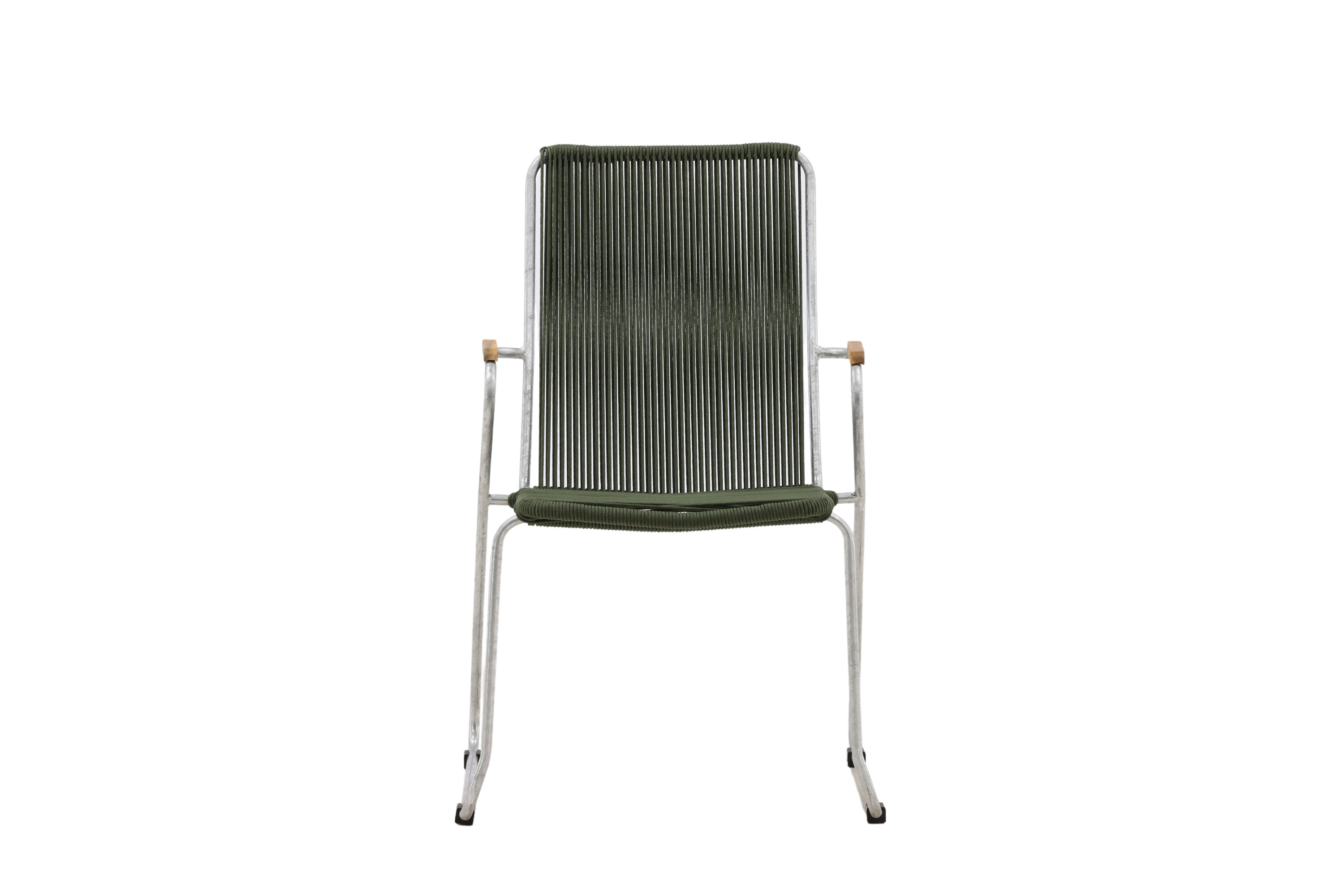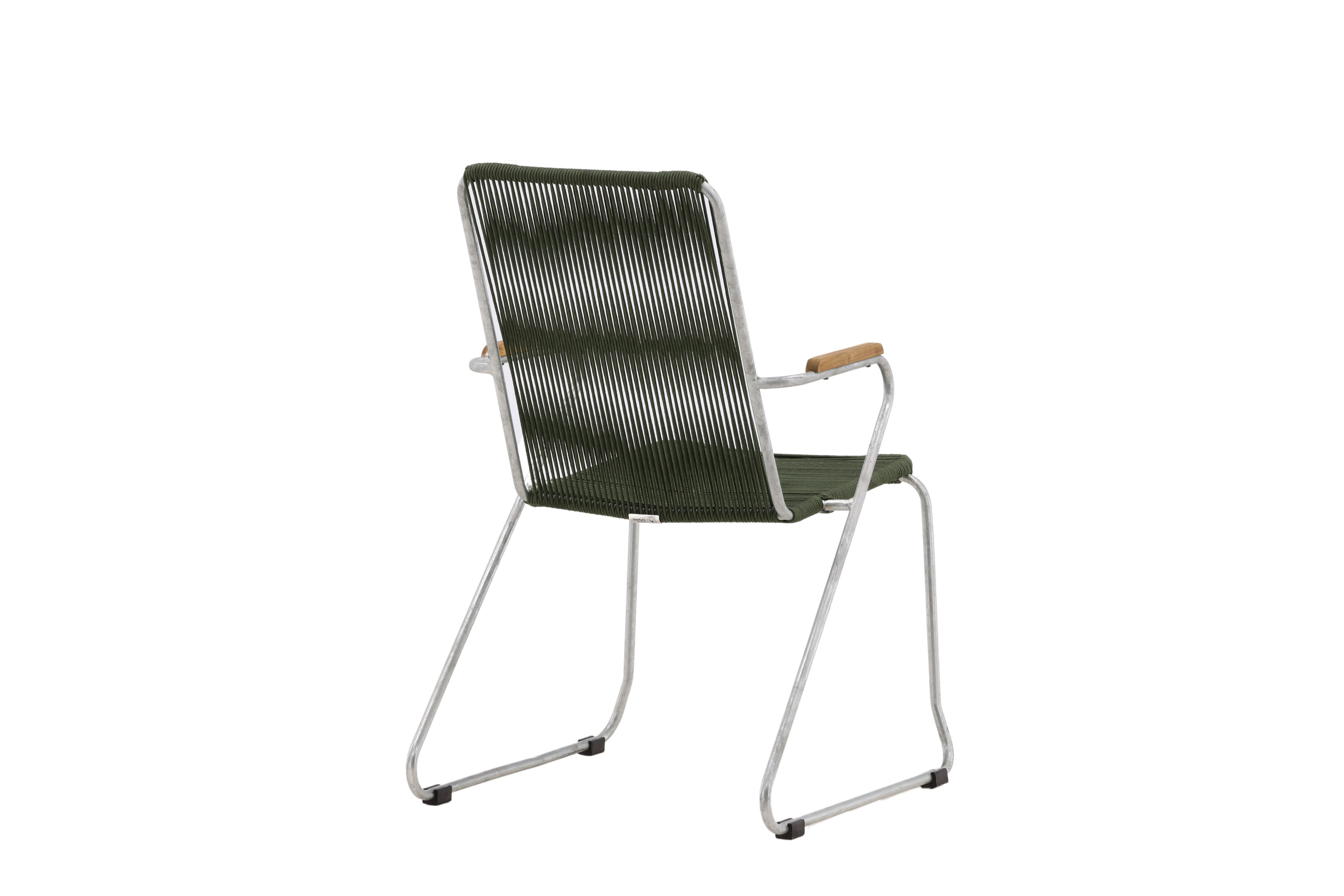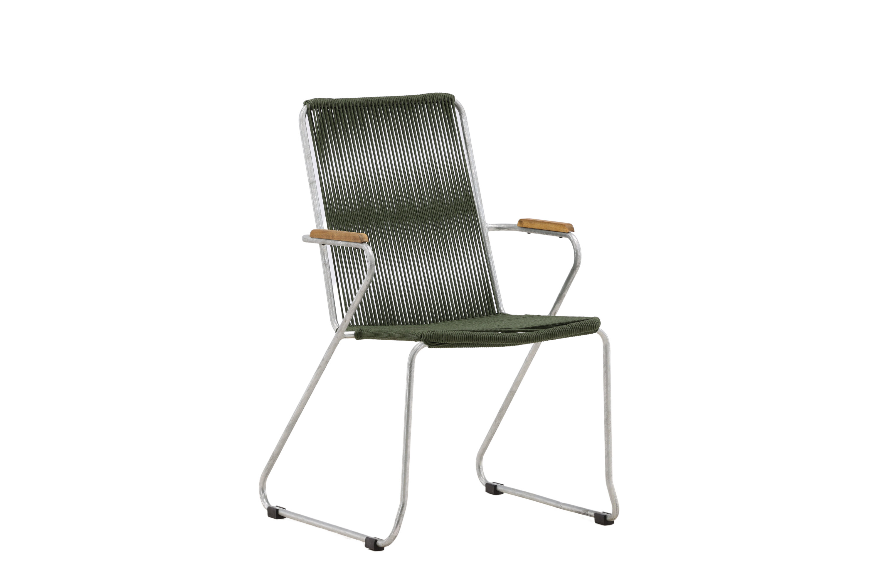Modern, stijlvol en duurzaam - een trendy stoel met de juiste kenmerken! Bois heeft een comfortabel ontwerp in zinkconstructie, zitting in zacht groen touw en decoratieve armleuningen in teakhout. Een meubelstuk dat uitnodigt tot vele aangename momenten. Geniet van een beetje extra van heerlijke maaltijden buiten en geef het balkon een stijlvolle uitstraling! De stoel is stapelbaar.