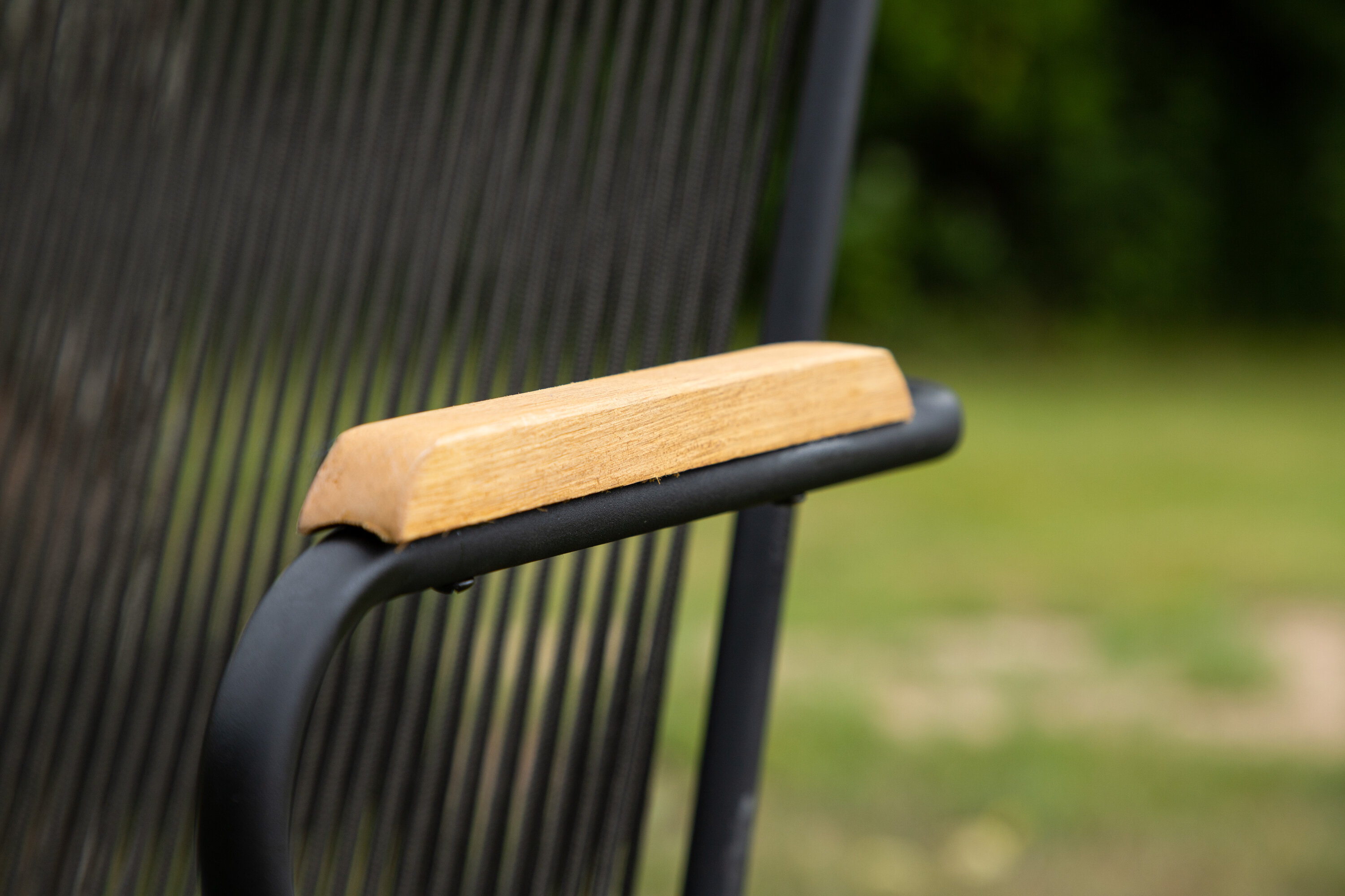 Modern, stijlvol en duurzaam - een trendy stoel met de juiste kenmerken! Bois heeft een comfortabel design met teakhouten armleuningen en zwarte touwzitting. Een meubelstuk dat uitnodigt tot vele aangename momenten. Geniet van een beetje extra van heerlijke maaltijden buiten en geef het balkon een stijlvolle uitstraling! De stoel is stapelbaar.