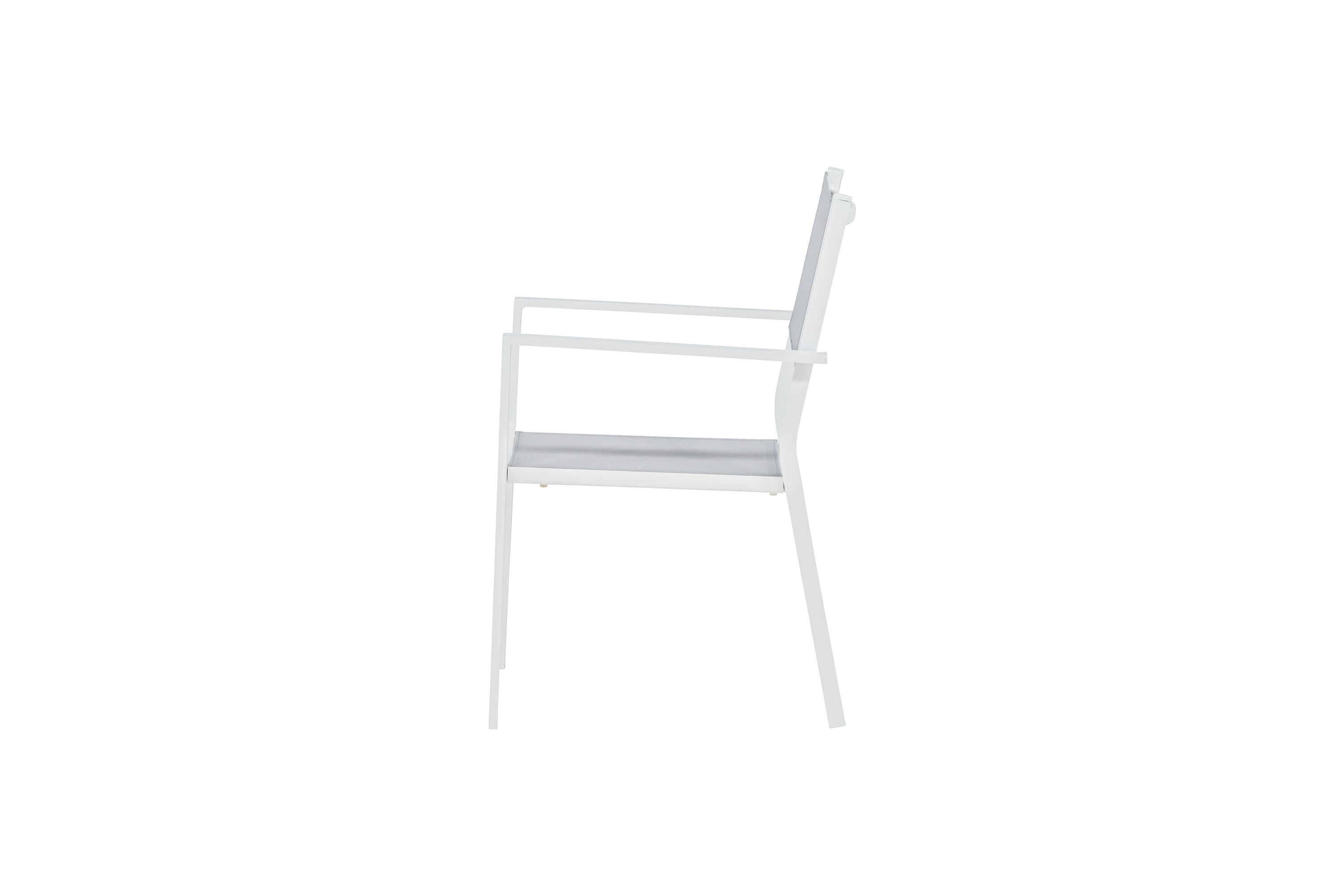 Copacabana in zijn industriële en stijlvolle design maakt zich uitstekend samen met andere tuinmeubelen. De witte constructie in aluminium en grijze zitting in Textilene zorgt voor een mooie blikvanger en geeft je een praktische eetkamerstoel die na verloop van tijd meegaat. Nodig deze zomer uit voor veel sociale momenten! De stoel is stapelbaar.