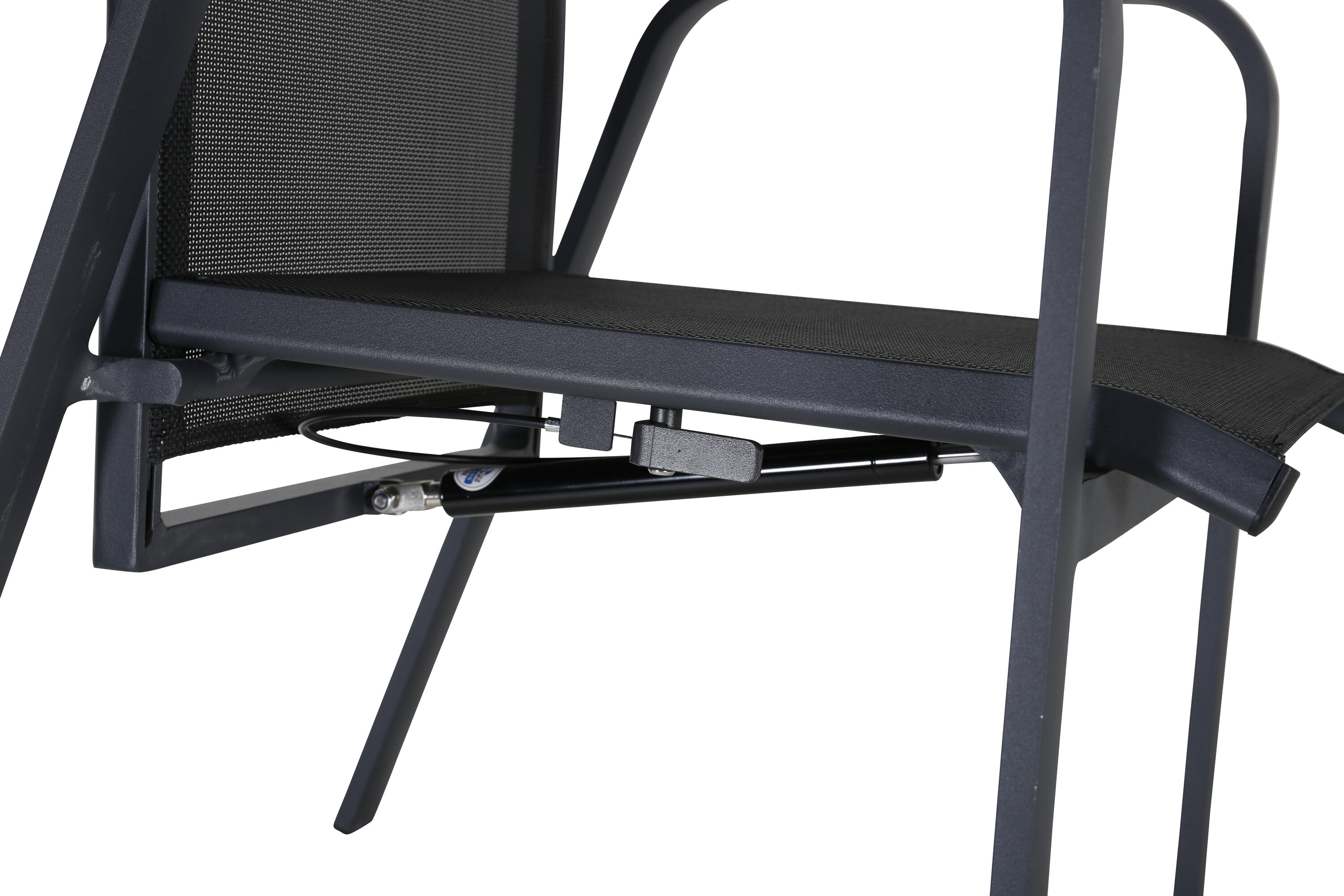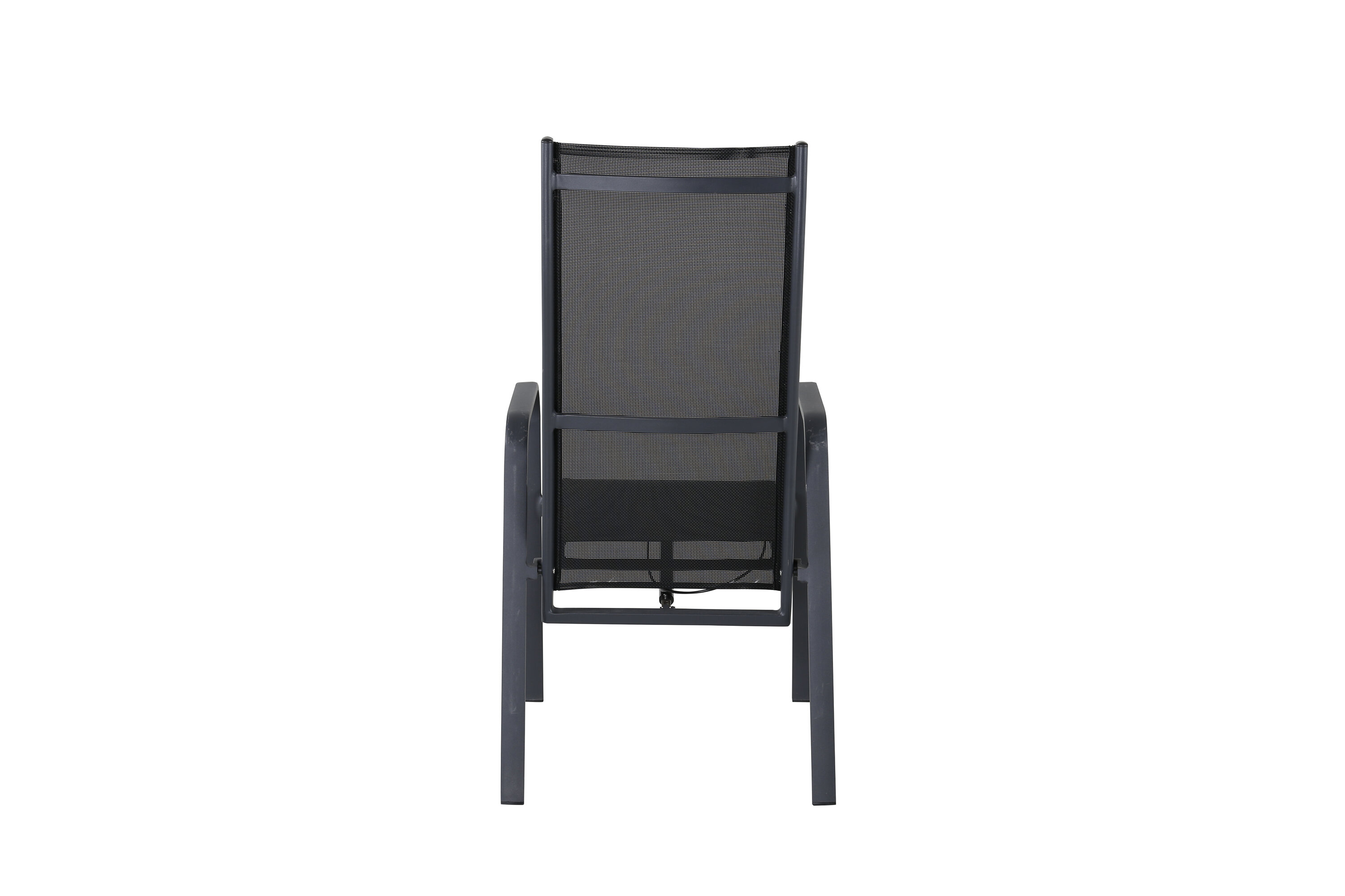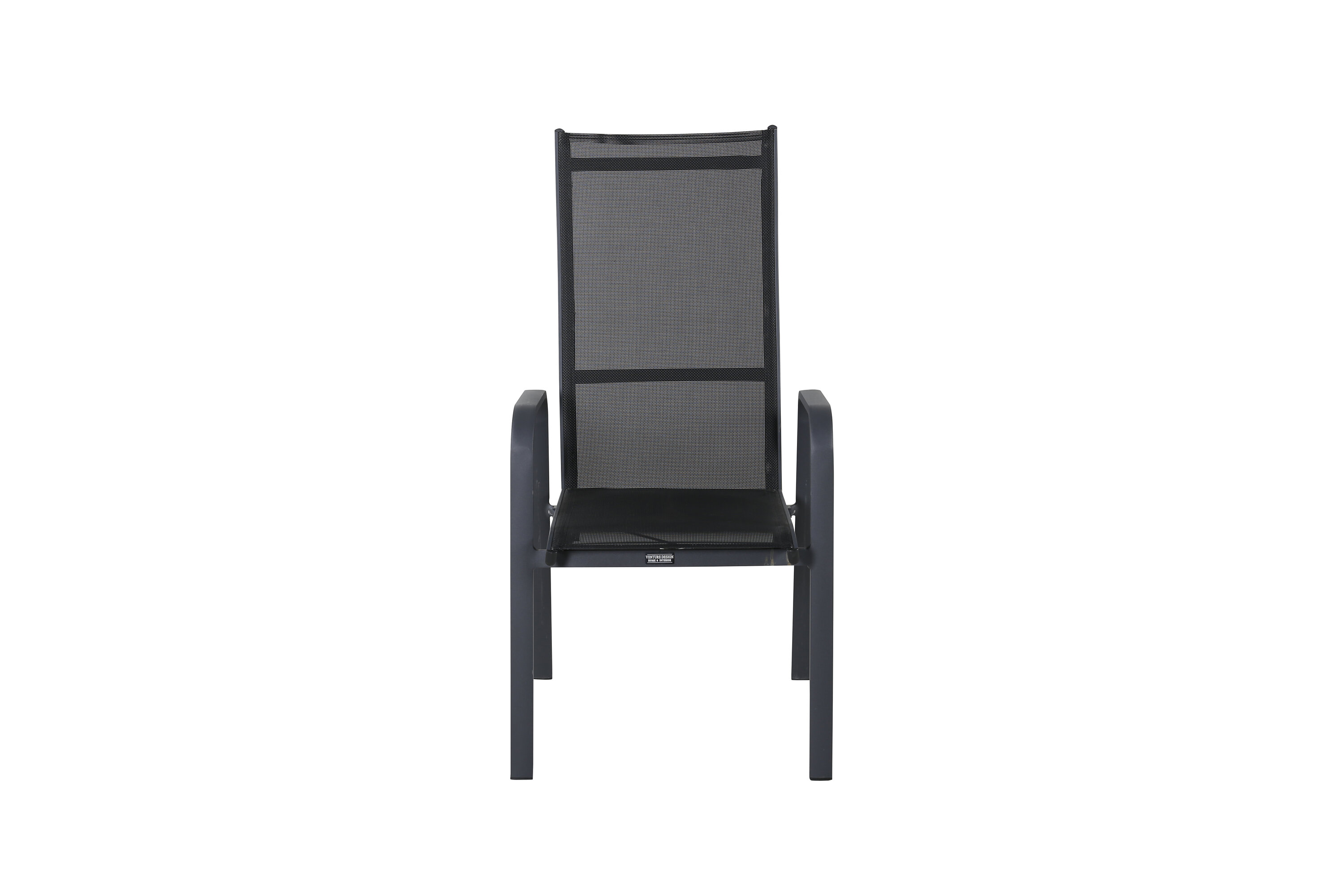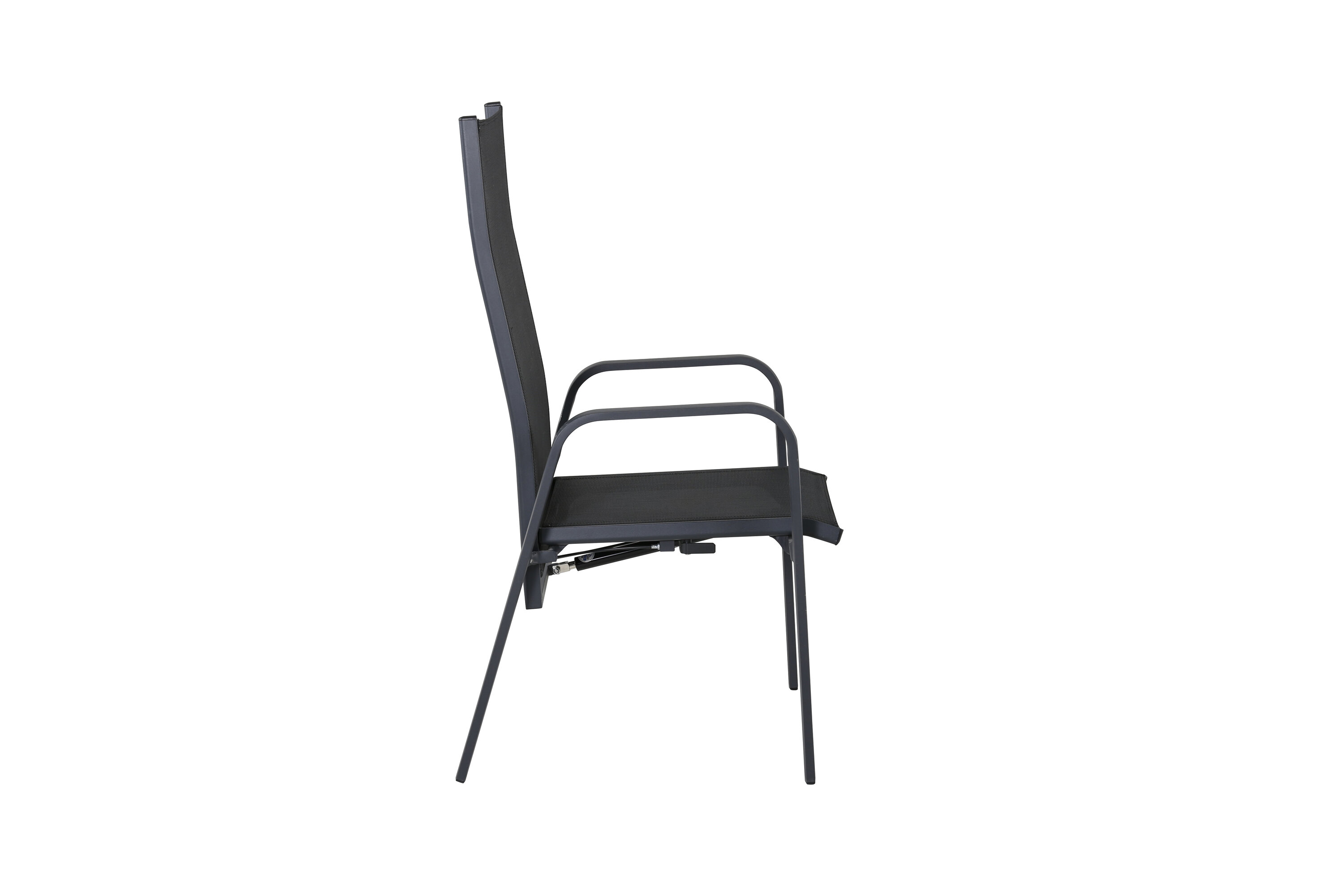Copacabana, een moderne stapelbare fauteuil in zwarte kleur die zich uitstekend leent aan de eettafel op het balkon. De rugleuning van de stoel kan worden ingeklemd, waardoor deze zeer comfortabel en praktisch is. Geniet op de beste manier van de zomer!