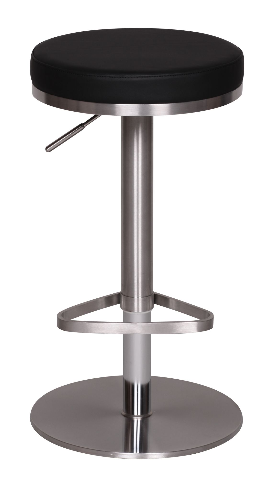Deze moderne zwarte barkruk heeft een verstelbare zithoogte van 57 tot 82 cm voor persoonlijk comfort. De ronde, dik gestoffeerde zwarte kunstleren zitting wordt omlijst door een verchroomde roestvrijstalen ring.
