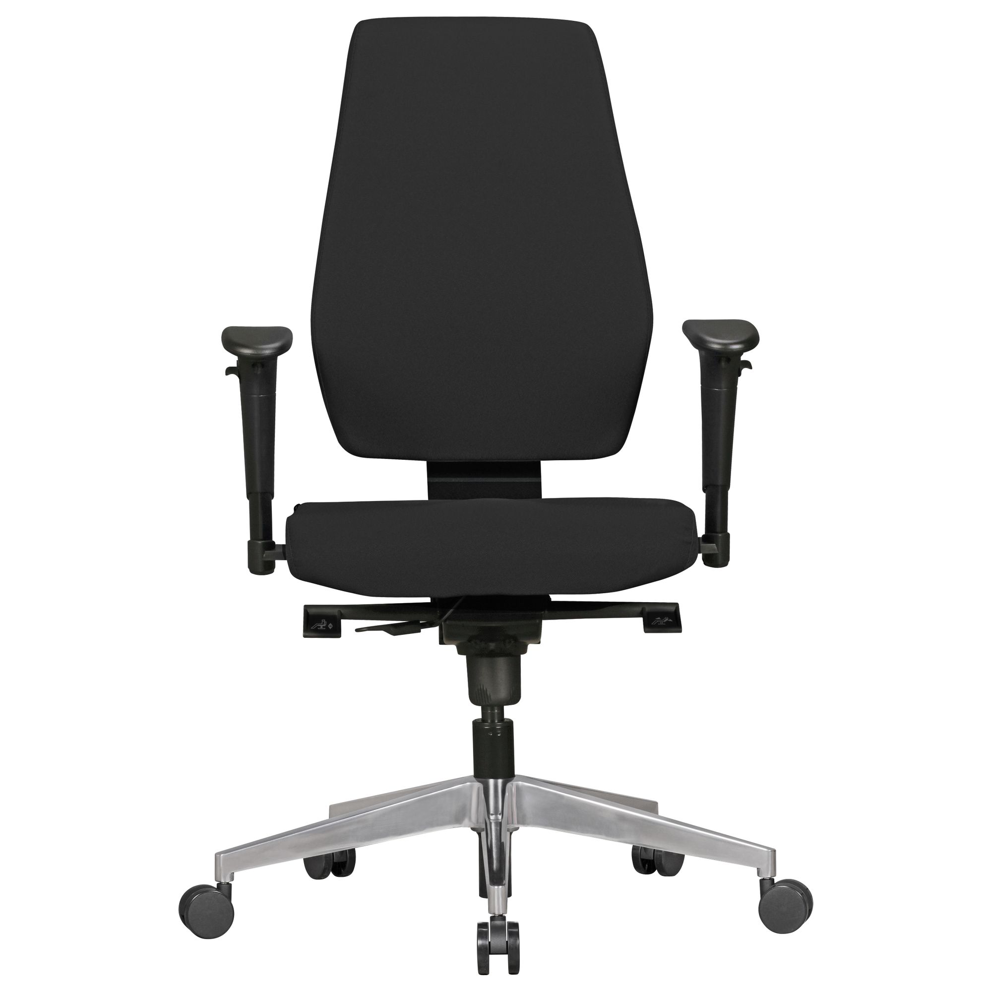 De DARIUS bureaustoel biedt optimaal comfort dankzij het ergonomische ontwerp en de comfortabele PU-schuimpadding met hoge dichtheid (65 kg/m³). De zwarte stof is slijtvast (100.000 cycli) en geschikt voor intensief gebruik tot 8 uur per dag. Het robuuste zilveren aluminium onderstel met een diameter van 70 cm zorgt voor uitstekende stabiliteit.